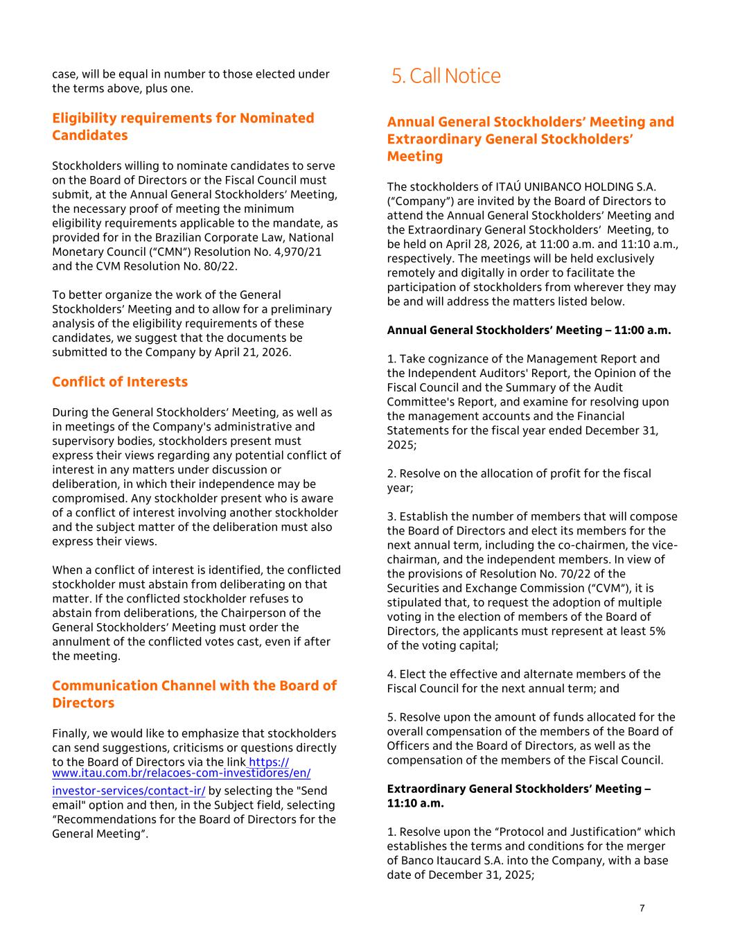 case, will be equal in number to those elected under the terms above, plus one. Eligibility requirements for Nominated Candidates Stockholders willing to nominate candidates to serve on the Board of Directors or the Fiscal Council must submit, at the Annual General Stockholders’ Meeting, the necessary proof of meeting the minimum eligibility requirements applicable to the mandate, as provided for in the Brazilian Corporate Law, National Monetary Council (“CMN”) Resolution No. 4,970/21 and the CVM Resolution No. 80/22. To better organize the work of the General Stockholders’ Meeting and to allow for a preliminary analysis of the eligibility requirements of these candidates, we suggest that the documents be submitted to the Company by April 21, 2026. Conflict of Interests During the General Stockholders’ Meeting, as well as in meetings of the Company's administrative and supervisory bodies, stockholders present must express their views regarding any potential conflict of interest in any matters under discussion or deliberation, in which their independence may be compromised. Any stockholder present who is aware of a conflict of interest involving another stockholder and the subject matter of the deliberation must also express their views. When a conflict of interest is identified, the conflicted stockholder must abstain from deliberating on that matter. If the conflicted stockholder refuses to abstain from deliberations, the Chairperson of the General Stockholders’ Meeting must order the annulment of the conflicted votes cast, even if after the meeting. Communication Channel with the Board of Directors Finally, we would like to emphasize that stockholders can send suggestions, criticisms or questions directly to the Board of Directors via the link https:// www.itau.com.br/relacoes-com-investidores/en/ investor-services/contact-ir/ by selecting the "Send email" option and then, in the Subject field, selecting “Recommendations for the Board of Directors for the General Meeting”. Annual General Stockholders’ Meeting and Extraordinary General Stockholders’ Meeting The stockholders of ITAÚ UNIBANCO HOLDING S.A. (“Company”) are invited by the Board of Directors to attend the Annual General Stockholders’ Meeting and the Extraordinary General Stockholders’ Meeting, to be held on April 28, 2026, at 11:00 a.m. and 11:10 a.m., respectively. The meetings will be held exclusively remotely and digitally in order to facilitate the participation of stockholders from wherever they may be and will address the matters listed below. Annual General Stockholders’ Meeting – 11:00 a.m. 1. Take cognizance of the Management Report and the Independent Auditors' Report, the Opinion of the Fiscal Council and the Summary of the Audit Committee's Report, and examine for resolving upon the management accounts and the Financial Statements for the fiscal year ended December 31, 2025; 2. Resolve on the allocation of profit for the fiscal year; 3. Establish the number of members that will compose the Board of Directors and elect its members for the next annual term, including the co-chairmen, the vice- chairman, and the independent members. In view of the provisions of Resolution No. 70/22 of the Securities and Exchange Commission (“CVM”), it is stipulated that, to request the adoption of multiple voting in the election of members of the Board of Directors, the applicants must represent at least 5% of the voting capital; 4. Elect the effective and alternate members of the Fiscal Council for the next annual term; and 5. Resolve upon the amount of funds allocated for the overall compensation of the members of the Board of Officers and the Board of Directors, as well as the compensation of the members of the Fiscal Council. Extraordinary General Stockholders’ Meeting – 11:10 a.m. 1. Resolve upon the “Protocol and Justification” which establishes the terms and conditions for the merger of Banco Itaucard S.A. into the Company, with a base date of December 31, 2025; 5. Call Notice 7