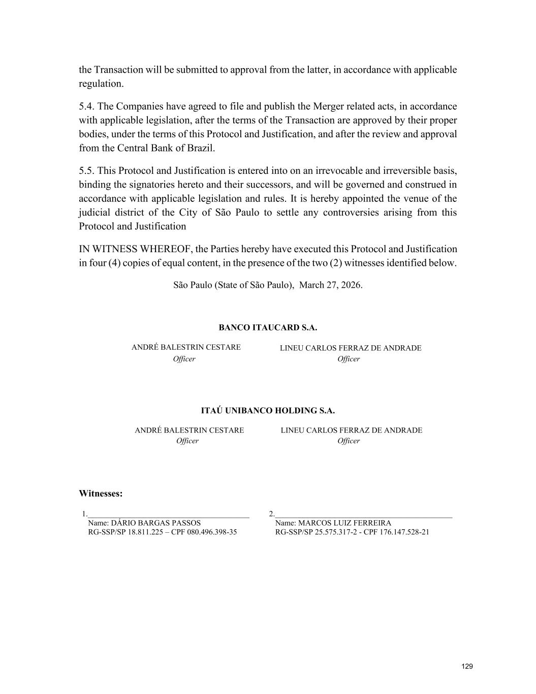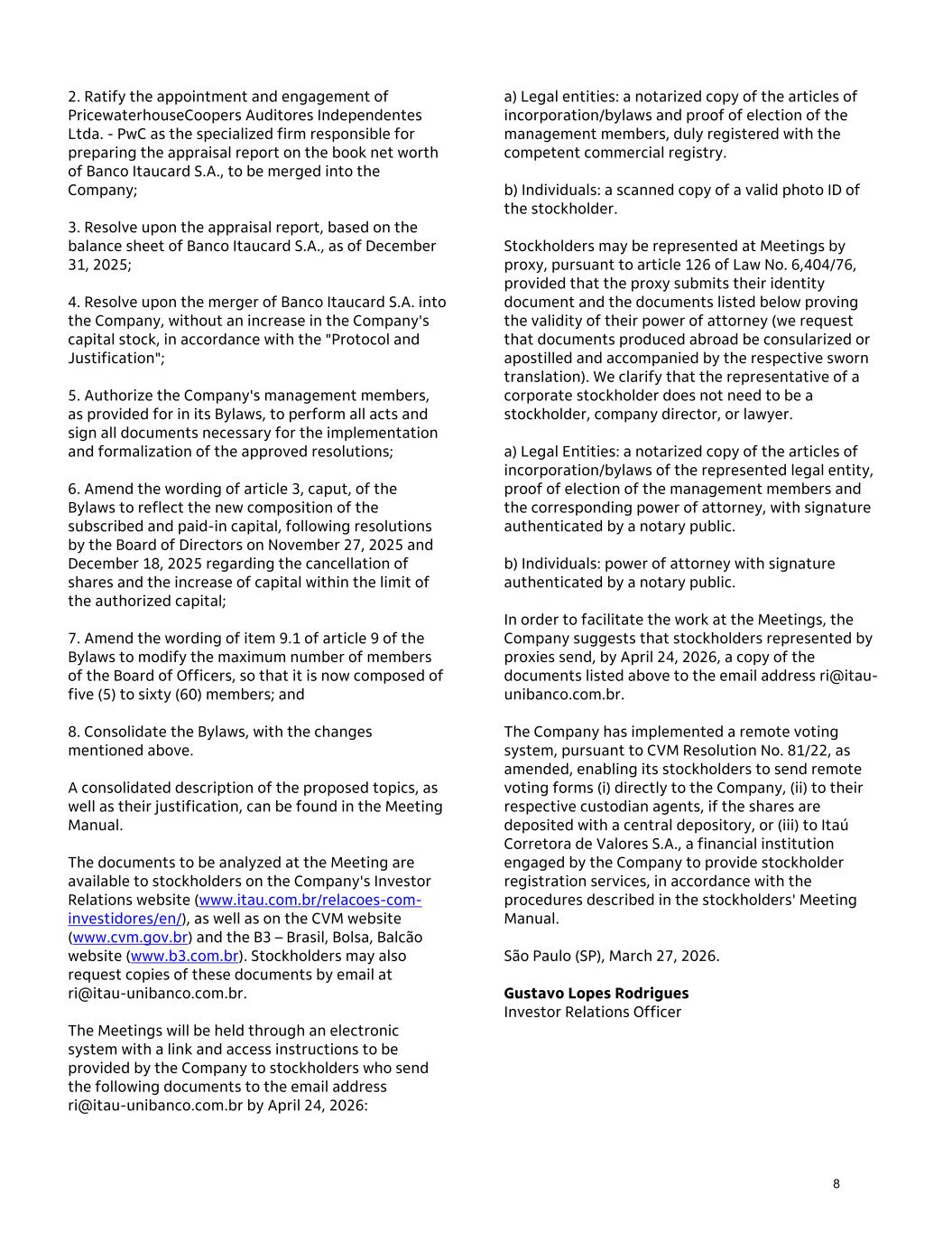 2. Ratify the appointment and engagement of PricewaterhouseCoopers Auditores Independentes Ltda. - PwC as the specialized firm responsible for preparing the appraisal report on the book net worth of Banco Itaucard S.A., to be merged into the Company; 3. Resolve upon the appraisal report, based on the balance sheet of Banco Itaucard S.A., as of December 31, 2025; 4. Resolve upon the merger of Banco Itaucard S.A. into the Company, without an increase in the Company's capital stock, in accordance with the "Protocol and Justification"; 5. Authorize the Company's management members, as provided for in its Bylaws, to perform all acts and sign all documents necessary for the implementation and formalization of the approved resolutions; 6. Amend the wording of article 3, caput, of the Bylaws to reflect the new composition of the subscribed and paid-in capital, following resolutions by the Board of Directors on November 27, 2025 and December 18, 2025 regarding the cancellation of shares and the increase of capital within the limit of the authorized capital; 7. Amend the wording of item 9.1 of article 9 of the Bylaws to modify the maximum number of members of the Board of Officers, so that it is now composed of five (5) to sixty (60) members; and 8. Consolidate the Bylaws, with the changes mentioned above. A consolidated description of the proposed topics, as well as their justification, can be found in the Meeting Manual. The documents to be analyzed at the Meeting are available to stockholders on the Company's Investor Relations website (www.itau.com.br/relacoes-com- investidores/en/), as well as on the CVM website (www.cvm.gov.br) and the B3 – Brasil, Bolsa, Balcão website (www.b3.com.br). Stockholders may also request copies of these documents by email at ri@itau-unibanco.com.br. The Meetings will be held through an electronic system with a link and access instructions to be provided by the Company to stockholders who send the following documents to the email address ri@itau-unibanco.com.br by April 24, 2026: a) Legal entities: a notarized copy of the articles of incorporation/bylaws and proof of election of the management members, duly registered with the competent commercial registry. b) Individuals: a scanned copy of a valid photo ID of the stockholder. Stockholders may be represented at Meetings by proxy, pursuant to article 126 of Law No. 6,404/76, provided that the proxy submits their identity document and the documents listed below proving the validity of their power of attorney (we request that documents produced abroad be consularized or apostilled and accompanied by the respective sworn translation). We clarify that the representative of a corporate stockholder does not need to be a stockholder, company director, or lawyer. a) Legal Entities: a notarized copy of the articles of incorporation/bylaws of the represented legal entity, proof of election of the management members and the corresponding power of attorney, with signature authenticated by a notary public. b) Individuals: power of attorney with signature authenticated by a notary public. In order to facilitate the work at the Meetings, the Company suggests that stockholders represented by proxies send, by April 24, 2026, a copy of the documents listed above to the email address ri@itau- unibanco.com.br. The Company has implemented a remote voting system, pursuant to CVM Resolution No. 81/22, as amended, enabling its stockholders to send remote voting forms (i) directly to the Company, (ii) to their respective custodian agents, if the shares are deposited with a central depository, or (iii) to Itaú Corretora de Valores S.A., a financial institution engaged by the Company to provide stockholder registration services, in accordance with the procedures described in the stockholders' Meeting Manual. São Paulo (SP), March 27, 2026. Gustavo Lopes Rodrigues Investor Relations Officer 8