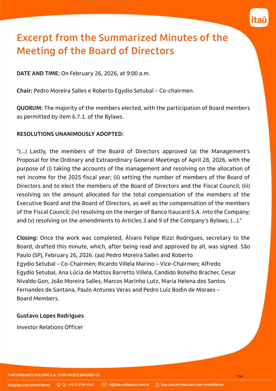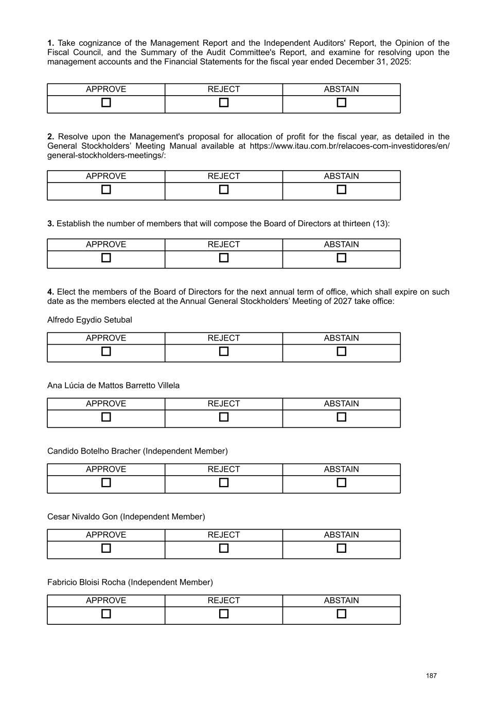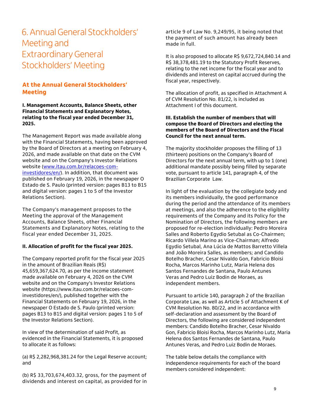 (a) R$ 2,282,968,381.24 for the Legal Reserve account; and (b) R$ 33,703,674,403.32, gross, for the payment of dividends and interest on capital, as provided for in article 9 of Law No. 9,249/95, it being noted that the payment of such amount has already been made in full. It is also proposed to allocate R$ 9,672,724,840.14 and R$ 38,378,481.19 to the Statutory Profit Reserves, relating to the net income for the fiscal year and to dividends and interest on capital accrued during the fiscal year, respectively. The allocation of profit, as specified in Attachment A of CVM Resolution No. 81/22, is included as Attachment I of this document. III. Establish the number of members that will compose the Board of Directors and electing the members of the Board of Directors and the Fiscal Council for the next annual term. The majority stockholder proposes the filling of 13 (thirteen) positions on the Company's Board of Directors for the next annual term, with up to 1 (one) additional mandate possibly being filled by separate vote, pursuant to article 141, paragraph 4, of the Brazilian Corporate Law. In light of the evaluation by the collegiate body and its members individually, the good performance during the period and the attendance of its members at meetings, and also the adherence to the eligibility requirements of the Company and its Policy for the Nomination of Directors, the following members are proposed for re-election individually: Pedro Moreira Salles and Roberto Egydio Setubal as Co-Chairmen; Ricardo Villela Marino as Vice-Chairman; Alfredo Egydio Setubal, Ana Lúcia de Mattos Barretto Villela and João Moreira Salles, as members; and Candido Botelho Bracher, Cesar Nivaldo Gon, Fabricio Bloisi Rocha, Marcos Marinho Lutz, Maria Helena dos Santos Fernandes de Santana, Paulo Antunes Veras and Pedro Luiz Bodin de Moraes, as independent members. Pursuant to article 140, paragraph 2 of the Brazilian Corporate Law, as well as Article 5 of Attachment K of CVM Resolution No. 80/22, and in accordance with self-declaration and assessment by the Board of Directors, the following are considered independent members: Candido Botelho Bracher, Cesar Nivaldo Gon, Fabricio Bloisi Rocha, Marcos Marinho Lutz, Maria Helena dos Santos Fernandes de Santana, Paulo Antunes Veras, and Pedro Luiz Bodin de Moraes. The table below details the compliance with independence requirements for each of the board members considered independent: 6. Annual General Stockholders’ Meeting and Extraordinary General Stockholders’ Meeting At the Annual General Stockholders’ Meeting I. Management Accounts, Balance Sheets, other Financial Statements and Explanatory Notes, relating to the fiscal year ended December 31, 2025. The Management Report was made available along with the Financial Statements, having been approved by the Board of Directors at a meeting on February 4, 2026, and made available on that date on the CVM website and on the Company's Investor Relations website (www.itau.com.br/relacoes-com- investidores/en/). In addition, that document was published on February 19, 2026, in the newspaper O Estado de S. Paulo (printed version: pages B13 to B15 and digital version: pages 1 to 5 of the Investor Relations Section). The Company's management proposes to the Meeting the approval of the Management Accounts, Balance Sheets, other Financial Statements and Explanatory Notes, relating to the fiscal year ended December 31, 2025. II. Allocation of profit for the fiscal year 2025. The Company reported profit for the fiscal year 2025 in the amount of Brazilian Reais (R$) 45,659,367,624.70, as per the income statement made available on February 4, 2026 on the CVM website and on the Company's Investor Relations website (https://www.itau.com.br/relacoes-com- investidores/en/), published together with the Financial Statements on February 19, 2026, in the newspaper O Estado de S. Paulo (printed version: pages B13 to B15 and digital version: pages 1 to 5 of the Investor Relations Section). In view of the determination of said Profit, as evidenced in the Financial Statements, it is proposed to allocate it as follows: 9