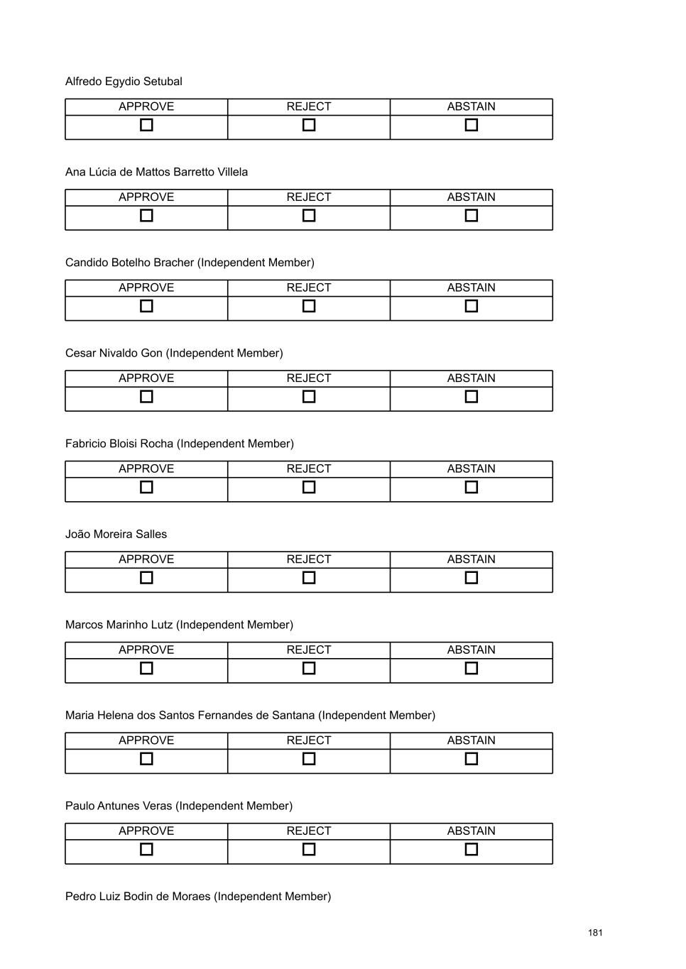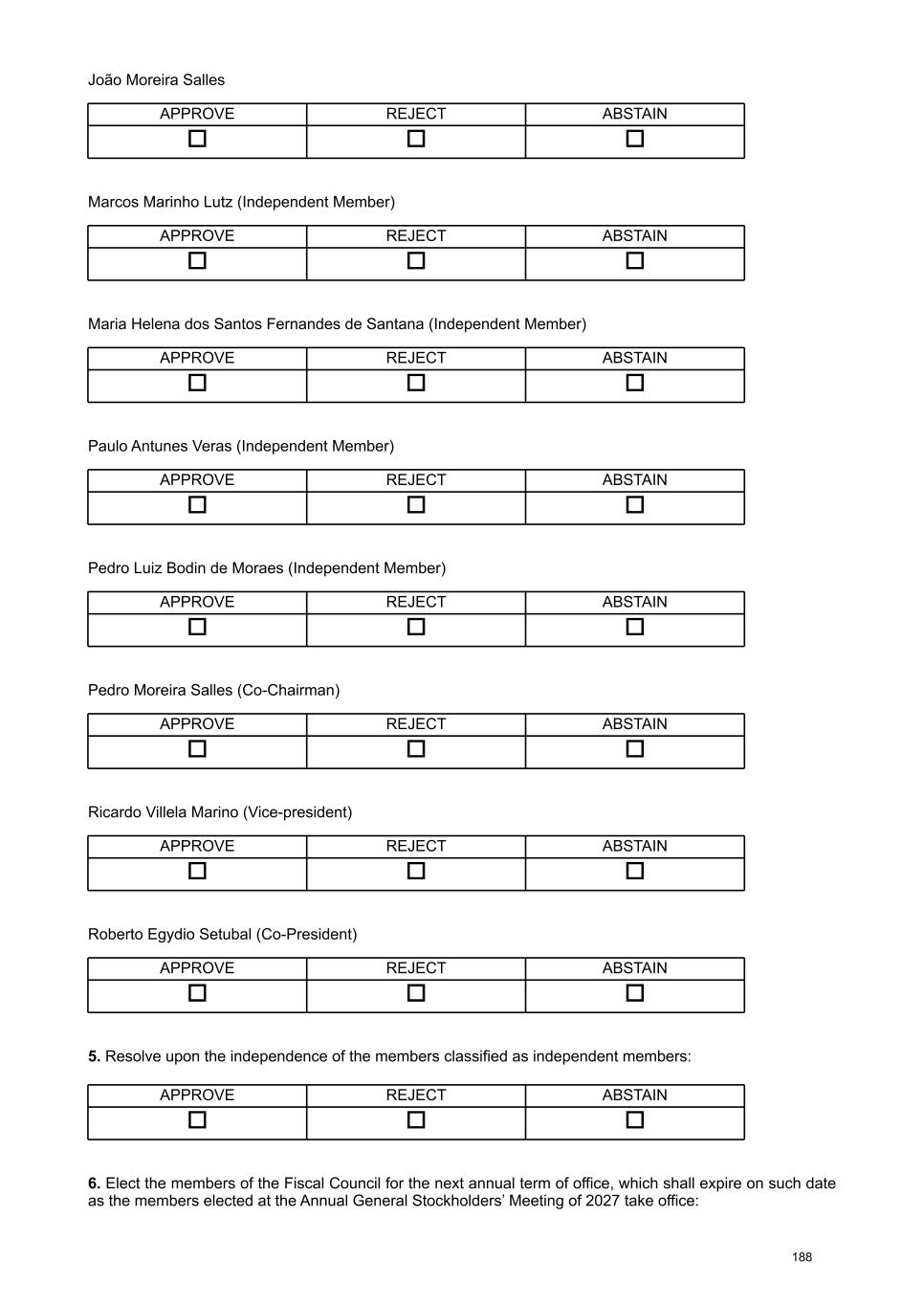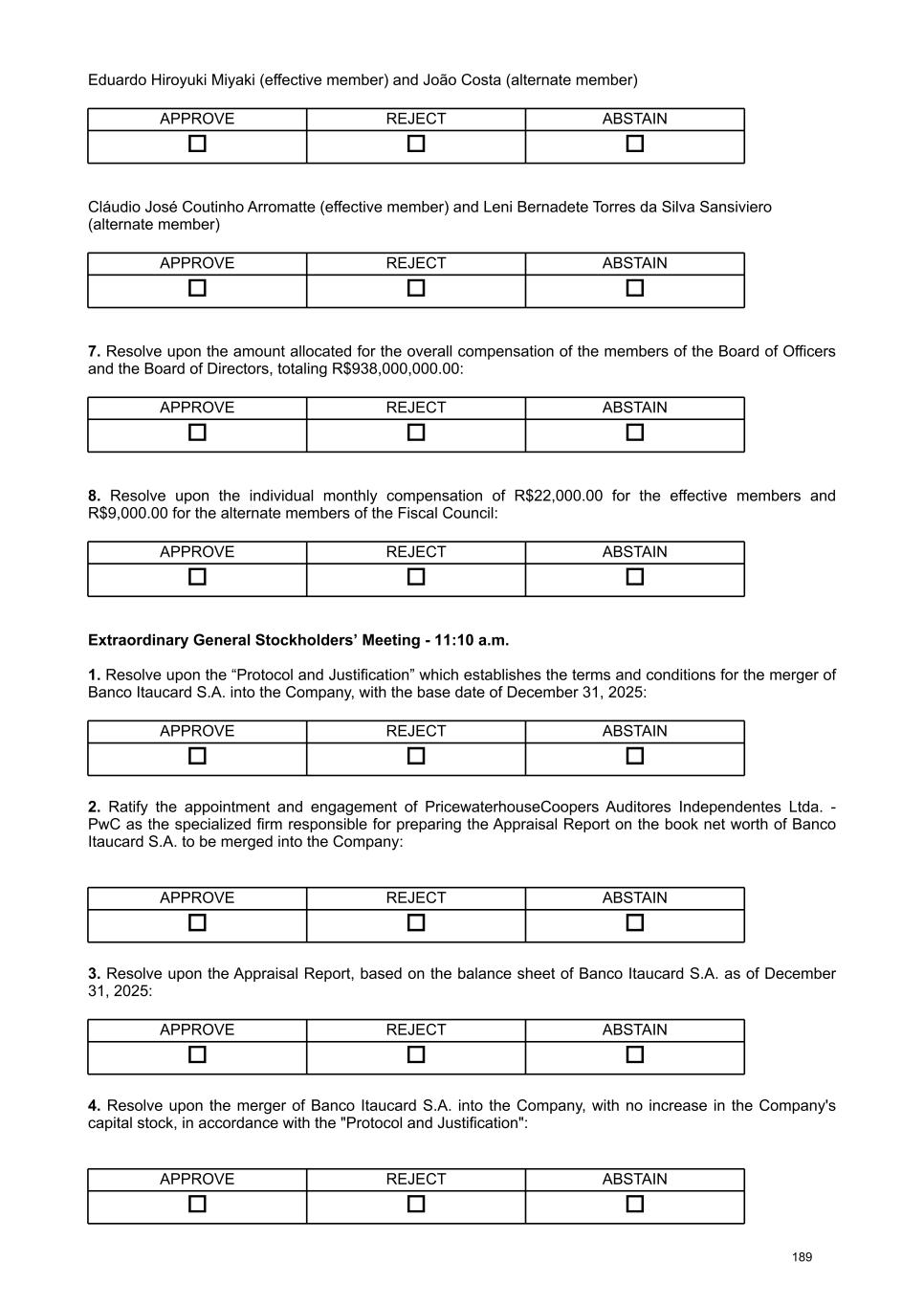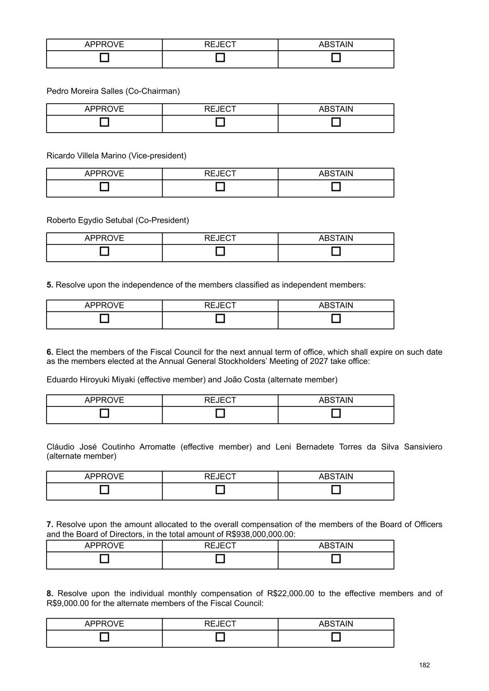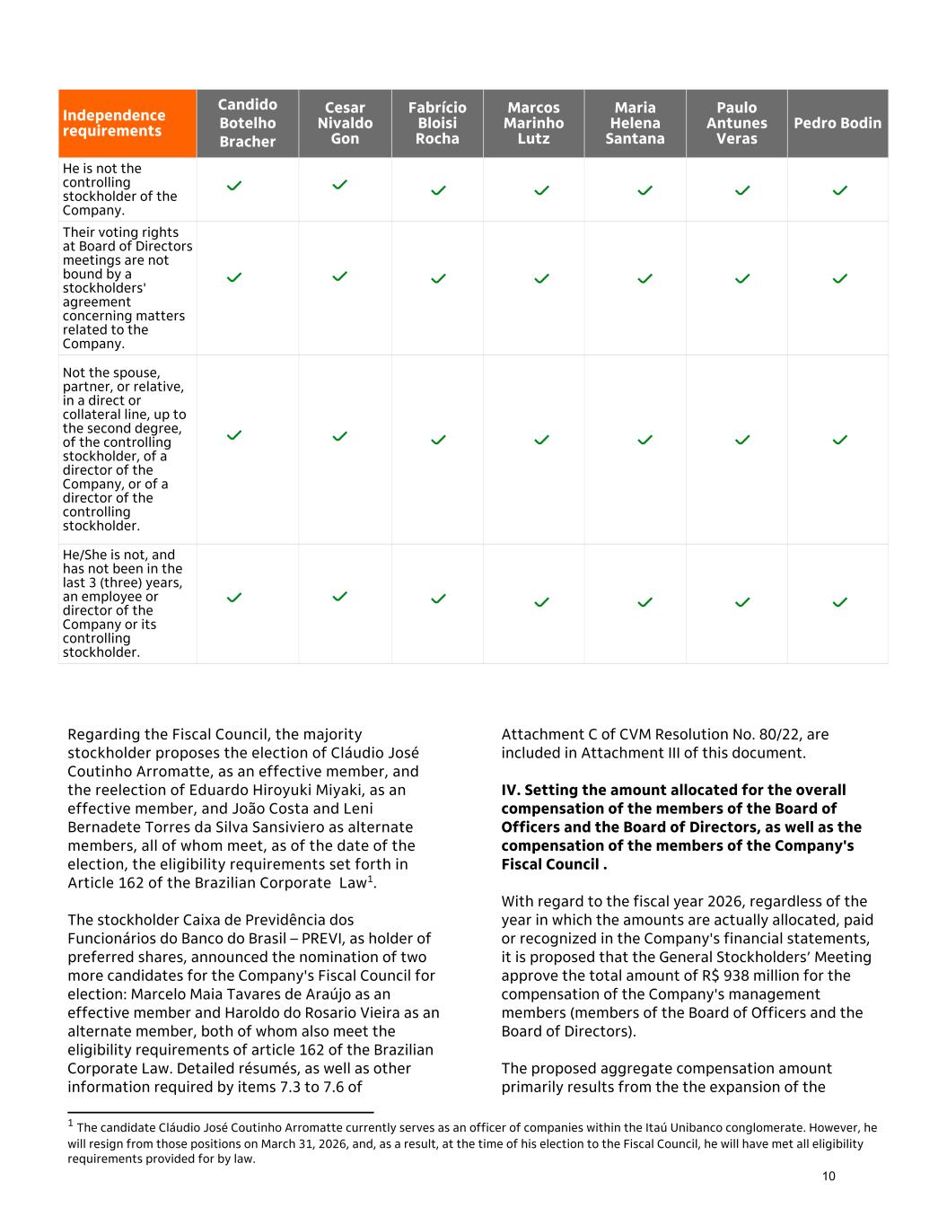 Regarding the Fiscal Council, the majority stockholder proposes the election of Cláudio José Coutinho Arromatte, as an effective member, and the reelection of Eduardo Hiroyuki Miyaki, as an effective member, and João Costa and Leni Bernadete Torres da Silva Sansiviero as alternate members, all of whom meet, as of the date of the election, the eligibility requirements set forth in Article 162 of the Brazilian Corporate Law1. The stockholder Caixa de Previdência dos Funcionários do Banco do Brasil – PREVI, as holder of preferred shares, announced the nomination of two more candidates for the Company's Fiscal Council for election: Marcelo Maia Tavares de Araújo as an effective member and Haroldo do Rosario Vieira as an alternate member, both of whom also meet the eligibility requirements of article 162 of the Brazilian Corporate Law. Detailed résumés, as well as other information required by items 7.3 to 7.6 of Attachment C of CVM Resolution No. 80/22, are included in Attachment III of this document. IV. Setting the amount allocated for the overall compensation of the members of the Board of Officers and the Board of Directors, as well as the compensation of the members of the Company's Fiscal Council . With regard to the fiscal year 2026, regardless of the year in which the amounts are actually allocated, paid or recognized in the Company's financial statements, it is proposed that the General Stockholders’ Meeting approve the total amount of R$ 938 million for the compensation of the Company's management members (members of the Board of Officers and the Board of Directors). The proposed aggregate compensation amount primarily results from the the expansion of the 1 The candidate Cláudio José Coutinho Arromatte currently serves as an officer of companies within the Itaú Unibanco conglomerate. However, he will resign from those positions on March 31, 2026, and, as a result, at the time of his election to the Fiscal Council, he will have met all eligibility requirements provided for by law. Independence requirements Candido Botelho Bracher Cesar Nivaldo Gon Fabrício Bloisi Rocha Marcos Marinho Lutz Maria Helena Santana Paulo Antunes Veras Pedro Bodin He is not the controlling stockholder of the Company. Their voting rights at Board of Directors meetings are not bound by a stockholders' agreement concerning matters related to the Company. Not the spouse, partner, or relative, in a direct or collateral line, up to the second degree, of the controlling stockholder, of a director of the Company, or of a director of the controlling stockholder. He/She is not, and has not been in the last 3 (three) years, an employee or director of the Company or its controlling stockholder. 10