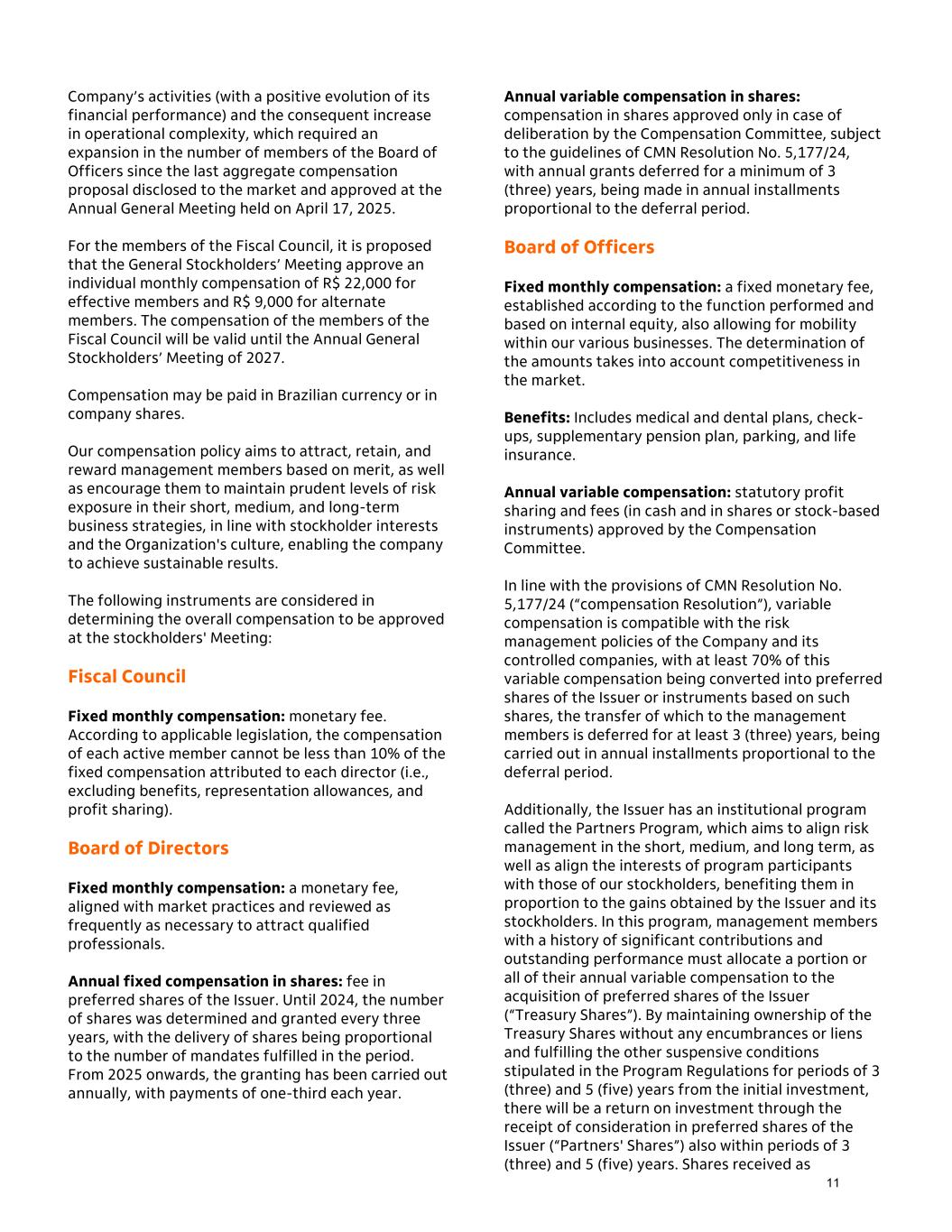Company’s activities (with a positive evolution of its financial performance) and the consequent increase in operational complexity, which required an expansion in the number of members of the Board of Officers since the last aggregate compensation proposal disclosed to the market and approved at the Annual General Meeting held on April 17, 2025. For the members of the Fiscal Council, it is proposed that the General Stockholders’ Meeting approve an individual monthly compensation of R$ 22,000 for effective members and R$ 9,000 for alternate members. The compensation of the members of the Fiscal Council will be valid until the Annual General Stockholders’ Meeting of 2027. Compensation may be paid in Brazilian currency or in company shares. Our compensation policy aims to attract, retain, and reward management members based on merit, as well as encourage them to maintain prudent levels of risk exposure in their short, medium, and long-term business strategies, in line with stockholder interests and the Organization's culture, enabling the company to achieve sustainable results. The following instruments are considered in determining the overall compensation to be approved at the stockholders' Meeting: Fiscal Council Fixed monthly compensation: monetary fee. According to applicable legislation, the compensation of each active member cannot be less than 10% of the fixed compensation attributed to each director (i.e., excluding benefits, representation allowances, and profit sharing). Board of Directors Fixed monthly compensation: a monetary fee, aligned with market practices and reviewed as frequently as necessary to attract qualified professionals. Annual fixed compensation in shares: fee in preferred shares of the Issuer. Until 2024, the number of shares was determined and granted every three years, with the delivery of shares being proportional to the number of mandates fulfilled in the period. From 2025 onwards, the granting has been carried out annually, with payments of one-third each year. Annual variable compensation in shares: compensation in shares approved only in case of deliberation by the Compensation Committee, subject to the guidelines of CMN Resolution No. 5,177/24, with annual grants deferred for a minimum of 3 (three) years, being made in annual installments proportional to the deferral period. Board of Officers Fixed monthly compensation: a fixed monetary fee, established according to the function performed and based on internal equity, also allowing for mobility within our various businesses. The determination of the amounts takes into account competitiveness in the market. Benefits: Includes medical and dental plans, check- ups, supplementary pension plan, parking, and life insurance. Annual variable compensation: statutory profit sharing and fees (in cash and in shares or stock-based instruments) approved by the Compensation Committee. In line with the provisions of CMN Resolution No. 5,177/24 (“compensation Resolution”), variable compensation is compatible with the risk management policies of the Company and its controlled companies, with at least 70% of this variable compensation being converted into preferred shares of the Issuer or instruments based on such shares, the transfer of which to the management members is deferred for at least 3 (three) years, being carried out in annual installments proportional to the deferral period. Additionally, the Issuer has an institutional program called the Partners Program, which aims to align risk management in the short, medium, and long term, as well as align the interests of program participants with those of our stockholders, benefiting them in proportion to the gains obtained by the Issuer and its stockholders. In this program, management members with a history of significant contributions and outstanding performance must allocate a portion or all of their annual variable compensation to the acquisition of preferred shares of the Issuer (“Treasury Shares”). By maintaining ownership of the Treasury Shares without any encumbrances or liens and fulfilling the other suspensive conditions stipulated in the Program Regulations for periods of 3 (three) and 5 (five) years from the initial investment, there will be a return on investment through the receipt of consideration in preferred shares of the Issuer (“Partners' Shares”) also within periods of 3 (three) and 5 (five) years. Shares received as 11