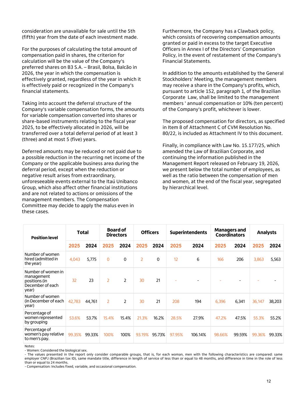 consideration are unavailable for sale until the 5th (fifth) year from the date of each investment made. For the purposes of calculating the total amount of compensation paid in shares, the criterion for calculation will be the value of the Company's preferred shares on B3 S.A. – Brasil, Bolsa, Balcão in 2026, the year in which the compensation is effectively granted, regardless of the year in which it is effectively paid or recognized in the Company's financial statements. Taking into account the deferral structure of the Company's variable compensation forms, the amounts for variable compensation converted into shares or share-based instruments relating to the fiscal year 2025, to be effectively allocated in 2026, will be transferred over a total deferral period of at least 3 (three) and at most 5 (five) years. Deferred amounts may be reduced or not paid due to a possible reduction in the recurring net income of the Company or the applicable business area during the deferral period, except when the reduction or negative result arises from extraordinary, unforeseeable events external to the Itaú Unibanco Group, which also affect other financial institutions and are not related to actions or omissions of the management members. The Compensation Committee may decide to apply the malus even in these cases. Furthermore, the Company has a Clawback policy, which consists of recovering compensation amounts granted or paid in excess to the target Executive Officers in Annex I of the Directors' Compensation Policy, in the event of restatement of the Company's Financial Statements. In addition to the amounts established by the General Stockholders’ Meeting, the management members may receive a share in the Company's profits, which, pursuant to article 152, paragraph 1, of the Brazilian Corporate Law, shall be limited to the management members ' annual compensation or 10% (ten percent) of the Company's profit, whichever is lower. The proposed compensation for directors, as specified in Item 8 of Attachment C of CVM Resolution No. 80/22, is included as Attachment IV to this document. Finally, in compliance with Law No. 15.177/25, which amended the Law of Brazilian Corporate, and continuing the information published in the Management Report released on February 19, 2026, we present below the total number of employees, as well as the ratio between the compensation of men and women, at the end of the fiscal year, segregated by hierarchical level. Position level Total Board of Directors Officers Superintendents Managers and Coordinators Analysts 2025 2024 2025 2024 2025 2024 2025 2024 2025 2024 2025 2024 Number of women hired (admitted in the year) 4,043 5,775 0 0 2 0 12 6 166 206 3,863 5,563 Number of women in management positions (in December of each year) 32 23 2 2 30 21 - - - - - - Number of women (in December of each year) 42,783 44,761 2 2 30 21 208 194 6,396 6,341 36,147 38,203 Percentage of women represented by grouping 53.6% 53.7% 15.4% 15.4% 21.3% 16.2% 28.5% 27.9% 47.2% 47.5% 55.3% 55.2% Percentage of women's pay relative to men's pay. 99.35% 99.33% 100% 100% 93.19% 95.73% 97.95% 106.14% 98.66% 99.59% 99.36% 99.33% Notes: - Women: Considered the biological sex. - The values presented in the report only consider comparable groups, that is, for each woman, men with the following characteristics are compared: same employer CNPJ (Brazilian tax ID), same mandate title, difference in length of service of less than or equal to 48 months, and difference in time in the role of less than or equal to 24 months. - Compensation: Includes fixed, variable, and occasional compensation. 12