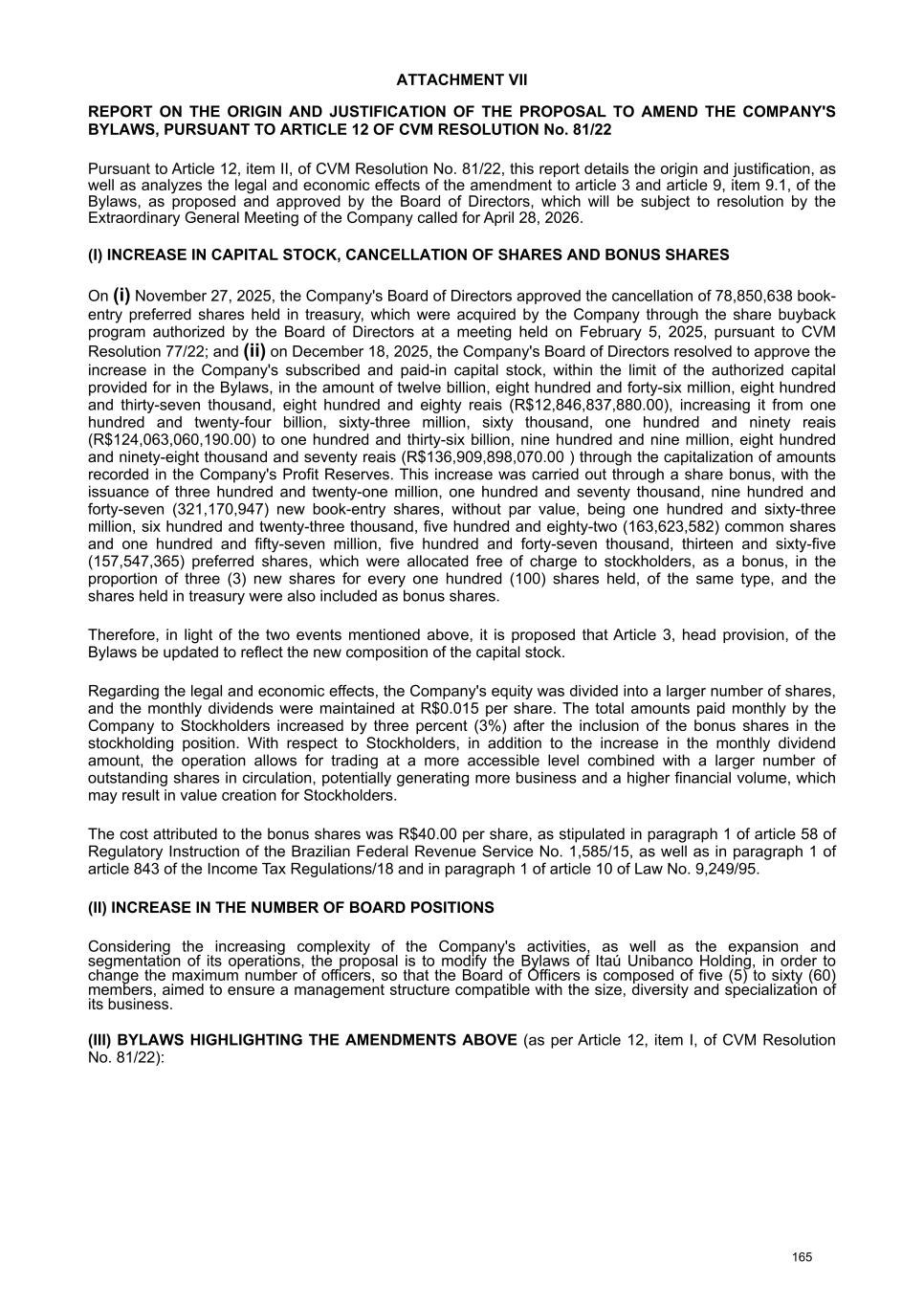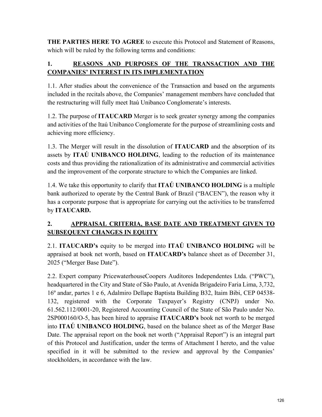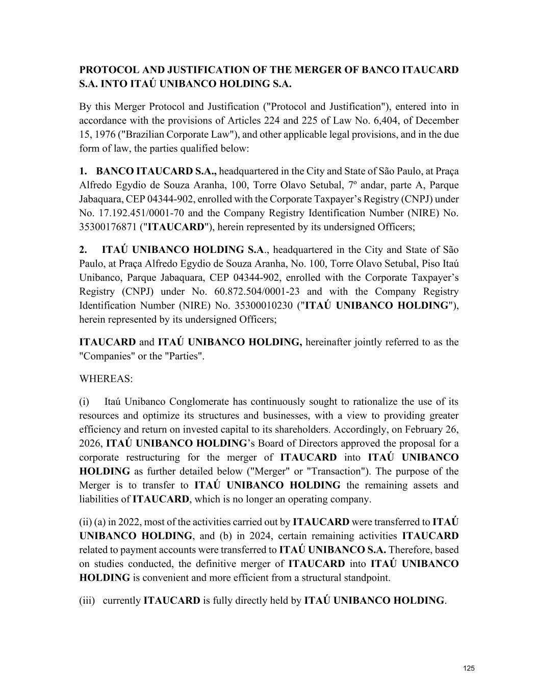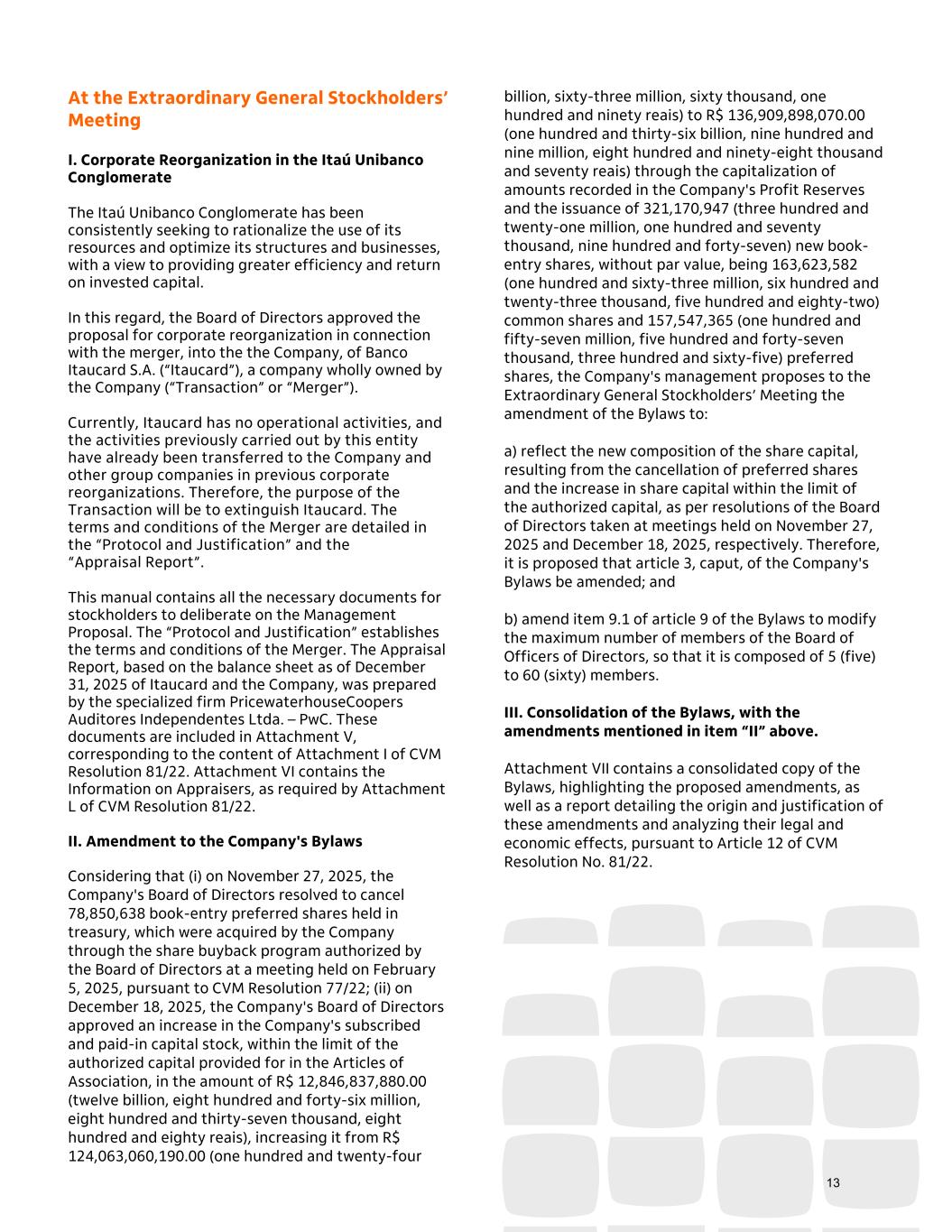 At the Extraordinary General Stockholders’ Meeting I. Corporate Reorganization in the Itaú Unibanco Conglomerate The Itaú Unibanco Conglomerate has been consistently seeking to rationalize the use of its resources and optimize its structures and businesses, with a view to providing greater efficiency and return on invested capital. In this regard, the Board of Directors approved the proposal for corporate reorganization in connection with the merger, into the the Company, of Banco Itaucard S.A. (“Itaucard”), a company wholly owned by the Company (“Transaction” or “Merger”). Currently, Itaucard has no operational activities, and the activities previously carried out by this entity have already been transferred to the Company and other group companies in previous corporate reorganizations. Therefore, the purpose of the Transaction will be to extinguish Itaucard. The terms and conditions of the Merger are detailed in the “Protocol and Justification” and the “Appraisal Report”. This manual contains all the necessary documents for stockholders to deliberate on the Management Proposal. The “Protocol and Justification” establishes the terms and conditions of the Merger. The Appraisal Report, based on the balance sheet as of December 31, 2025 of Itaucard and the Company, was prepared by the specialized firm PricewaterhouseCoopers Auditores Independentes Ltda. – PwC. These documents are included in Attachment V, corresponding to the content of Attachment I of CVM Resolution 81/22. Attachment VI contains the Information on Appraisers, as required by Attachment L of CVM Resolution 81/22. II. Amendment to the Company's Bylaws Considering that (i) on November 27, 2025, the Company's Board of Directors resolved to cancel 78,850,638 book-entry preferred shares held in treasury, which were acquired by the Company through the share buyback program authorized by the Board of Directors at a meeting held on February 5, 2025, pursuant to CVM Resolution 77/22; (ii) on December 18, 2025, the Company's Board of Directors approved an increase in the Company's subscribed and paid-in capital stock, within the limit of the authorized capital provided for in the Articles of Association, in the amount of R$ 12,846,837,880.00 (twelve billion, eight hundred and forty-six million, eight hundred and thirty-seven thousand, eight hundred and eighty reais), increasing it from R$ 124,063,060,190.00 (one hundred and twenty-four billion, sixty-three million, sixty thousand, one hundred and ninety reais) to R$ 136,909,898,070.00 (one hundred and thirty-six billion, nine hundred and nine million, eight hundred and ninety-eight thousand and seventy reais) through the capitalization of amounts recorded in the Company's Profit Reserves and the issuance of 321,170,947 (three hundred and twenty-one million, one hundred and seventy thousand, nine hundred and forty-seven) new book- entry shares, without par value, being 163,623,582 (one hundred and sixty-three million, six hundred and twenty-three thousand, five hundred and eighty-two) common shares and 157,547,365 (one hundred and fifty-seven million, five hundred and forty-seven thousand, three hundred and sixty-five) preferred shares, the Company's management proposes to the Extraordinary General Stockholders’ Meeting the amendment of the Bylaws to: a) reflect the new composition of the share capital, resulting from the cancellation of preferred shares and the increase in share capital within the limit of the authorized capital, as per resolutions of the Board of Directors taken at meetings held on November 27, 2025 and December 18, 2025, respectively. Therefore, it is proposed that article 3, caput, of the Company's Bylaws be amended; and b) amend item 9.1 of article 9 of the Bylaws to modify the maximum number of members of the Board of Officers of Directors, so that it is composed of 5 (five) to 60 (sixty) members. III. Consolidation of the Bylaws, with the amendments mentioned in item “II” above. Attachment VII contains a consolidated copy of the Bylaws, highlighting the proposed amendments, as well as a report detailing the origin and justification of these amendments and analyzing their legal and economic effects, pursuant to Article 12 of CVM Resolution No. 81/22. 13