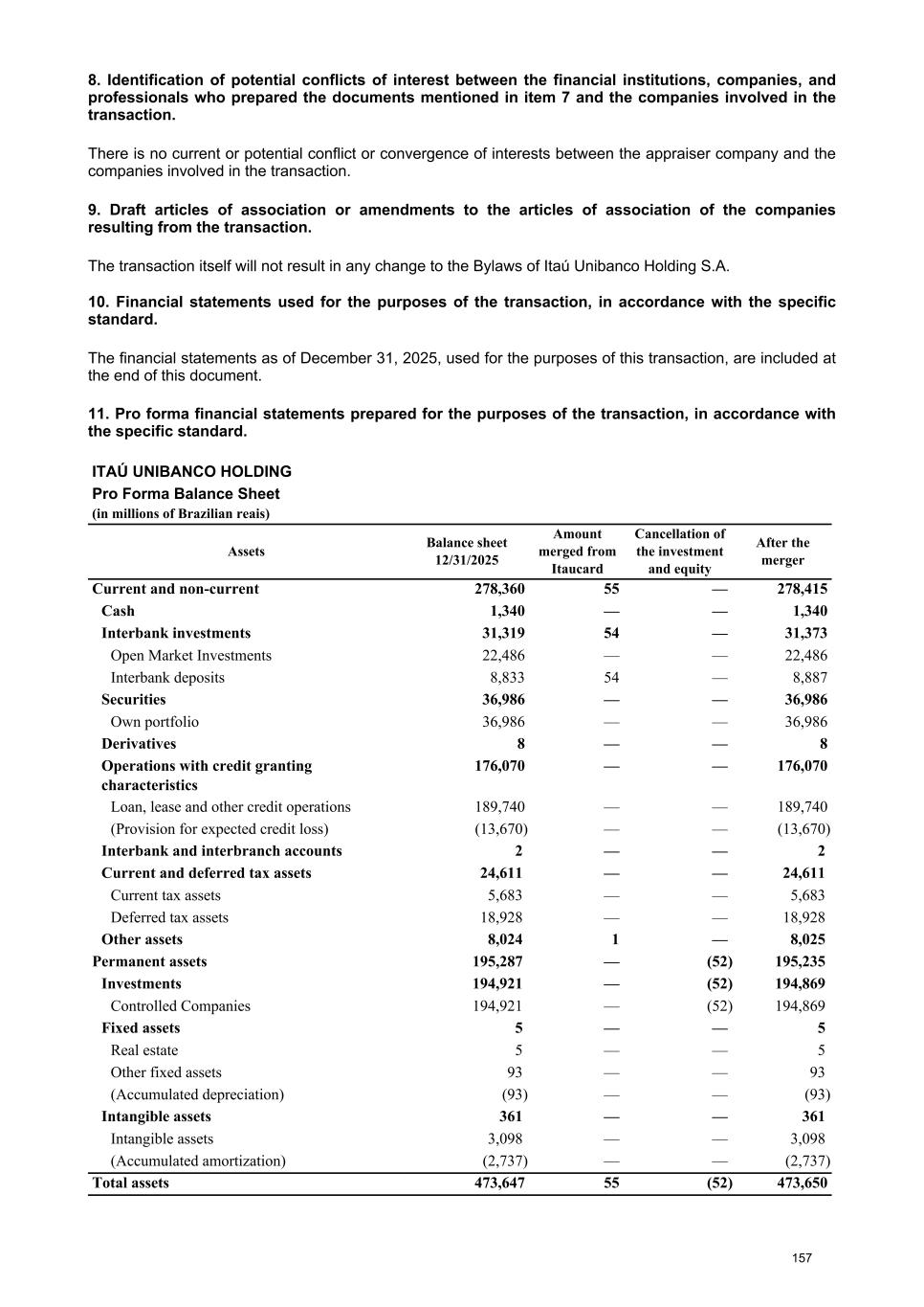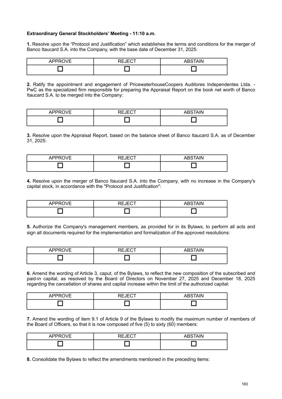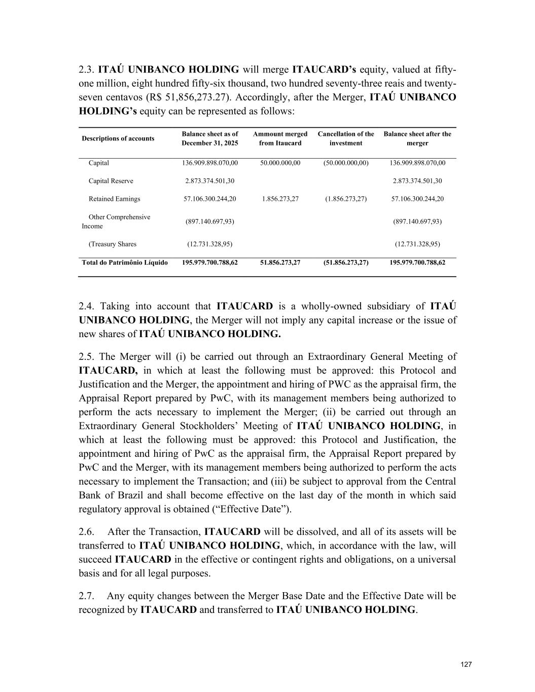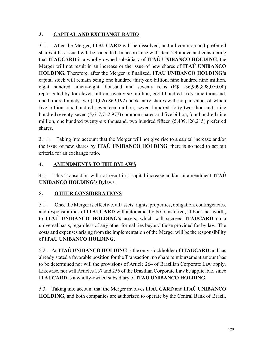 At the Extraordinary General Stockholders’ Meeting I. Corporate Reorganization in the Itaú Unibanco Conglomerate The Itaú Unibanco Conglomerate has been consistently seeking to rationalize the use of its resources and optimize its structures and businesses, with a view to providing greater efficiency and return on invested capital. In this regard, the Board of Directors approved the proposal for corporate reorganization in connection with the merger, into the the Company, of Banco Itaucard S.A. (“Itaucard”), a company wholly owned by the Company (“Transaction” or “Merger”). Currently, Itaucard has no operational activities, and the activities previously carried out by this entity have already been transferred to the Company and other group companies in previous corporate reorganizations. Therefore, the purpose of the Transaction will be to extinguish Itaucard. The terms and conditions of the Merger are detailed in the “Protocol and Justification” and the “Appraisal Report”. This manual contains all the necessary documents for stockholders to deliberate on the Management Proposal. The “Protocol and Justification” establishes the terms and conditions of the Merger. The Appraisal Report, based on the balance sheet as of December 31, 2025 of Itaucard and the Company, was prepared by the specialized firm PricewaterhouseCoopers Auditores Independentes Ltda. – PwC. These documents are included in Attachment V, corresponding to the content of Attachment I of CVM Resolution 81/22. Attachment VI contains the Information on Appraisers, as required by Attachment L of CVM Resolution 81/22. II. Amendment to the Company's Bylaws Considering that (i) on November 27, 2025, the Company's Board of Directors resolved to cancel 78,850,638 book-entry preferred shares held in treasury, which were acquired by the Company through the share buyback program authorized by the Board of Directors at a meeting held on February 5, 2025, pursuant to CVM Resolution 77/22; (ii) on December 18, 2025, the Company's Board of Directors approved an increase in the Company's subscribed and paid-in capital stock, within the limit of the authorized capital provided for in the Articles of Association, in the amount of R$ 12,846,837,880.00 (twelve billion, eight hundred and forty-six million, eight hundred and thirty-seven thousand, eight hundred and eighty reais), increasing it from R$ 124,063,060,190.00 (one hundred and twenty-four billion, sixty-three million, sixty thousand, one hundred and ninety reais) to R$ 136,909,898,070.00 (one hundred and thirty-six billion, nine hundred and nine million, eight hundred and ninety-eight thousand and seventy reais) through the capitalization of amounts recorded in the Company's Profit Reserves and the issuance of 321,170,947 (three hundred and twenty-one million, one hundred and seventy thousand, nine hundred and forty-seven) new book- entry shares, without par value, being 163,623,582 (one hundred and sixty-three million, six hundred and twenty-three thousand, five hundred and eighty-two) common shares and 157,547,365 (one hundred and fifty-seven million, five hundred and forty-seven thousand, three hundred and sixty-five) preferred shares, the Company's management proposes to the Extraordinary General Stockholders’ Meeting the amendment of the Bylaws to: a) reflect the new composition of the share capital, resulting from the cancellation of preferred shares and the increase in share capital within the limit of the authorized capital, as per resolutions of the Board of Directors taken at meetings held on November 27, 2025 and December 18, 2025, respectively. Therefore, it is proposed that article 3, caput, of the Company's Bylaws be amended; and b) amend item 9.1 of article 9 of the Bylaws to modify the maximum number of members of the Board of Officers of Directors, so that it is composed of 5 (five) to 60 (sixty) members. III. Consolidation of the Bylaws, with the amendments mentioned in item “II” above. Attachment VII contains a consolidated copy of the Bylaws, highlighting the proposed amendments, as well as a report detailing the origin and justification of these amendments and analyzing their legal and economic effects, pursuant to Article 12 of CVM Resolution No. 81/22. 13