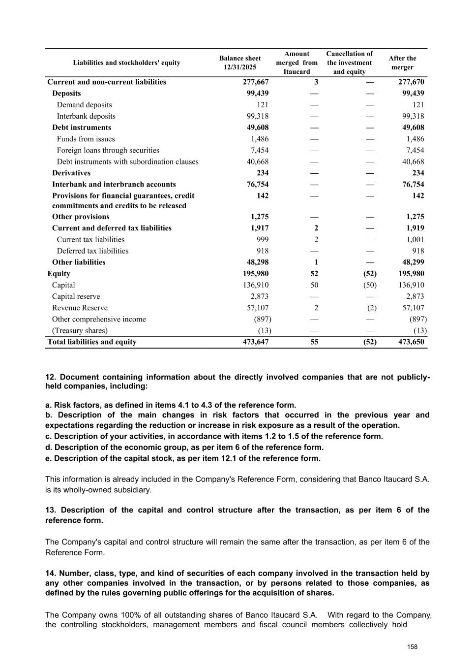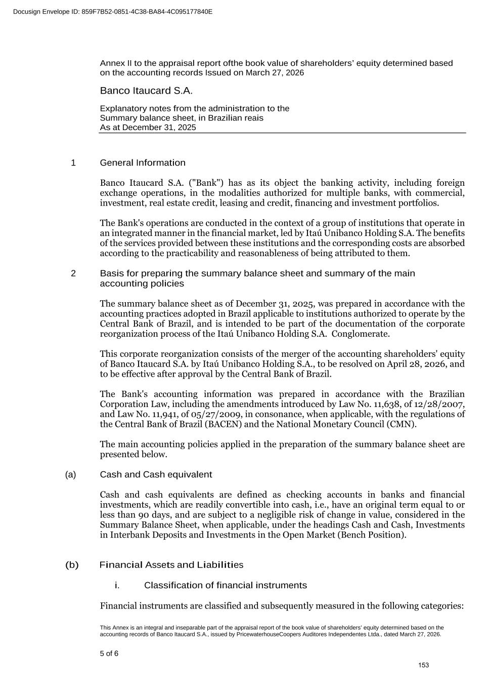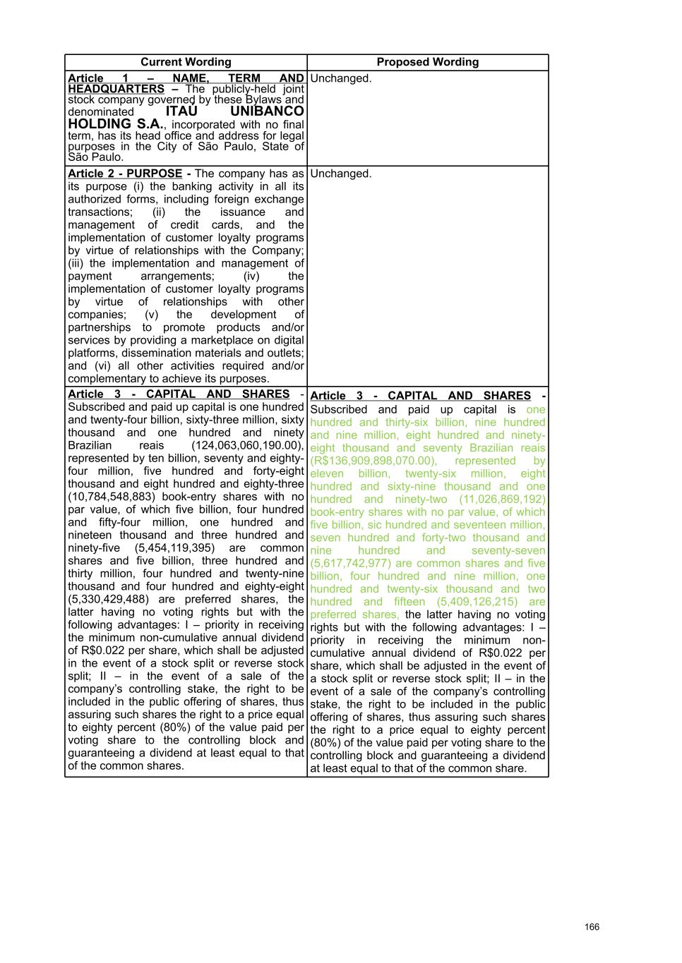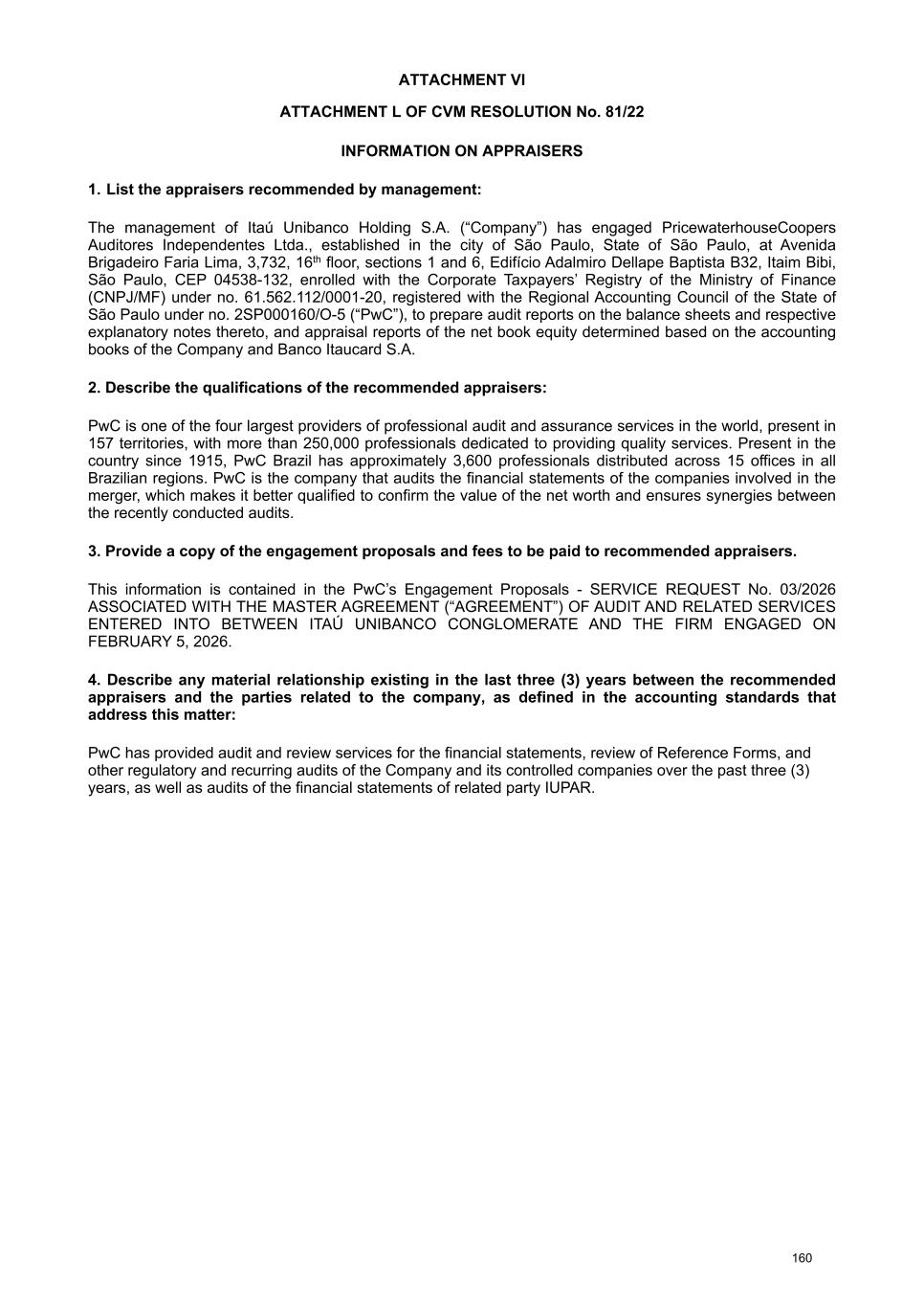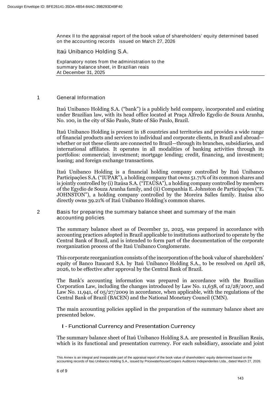 At the Extraordinary General Stockholders’ Meeting I. Corporate Reorganization in the Itaú Unibanco Conglomerate The Itaú Unibanco Conglomerate has been consistently seeking to rationalize the use of its resources and optimize its structures and businesses, with a view to providing greater efficiency and return on invested capital. In this regard, the Board of Directors approved the proposal for corporate reorganization in connection with the merger, into the the Company, of Banco Itaucard S.A. (“Itaucard”), a company wholly owned by the Company (“Transaction” or “Merger”). Currently, Itaucard has no operational activities, and the activities previously carried out by this entity have already been transferred to the Company and other group companies in previous corporate reorganizations. Therefore, the purpose of the Transaction will be to extinguish Itaucard. The terms and conditions of the Merger are detailed in the “Protocol and Justification” and the “Appraisal Report”. This manual contains all the necessary documents for stockholders to deliberate on the Management Proposal. The “Protocol and Justification” establishes the terms and conditions of the Merger. The Appraisal Report, based on the balance sheet as of December 31, 2025 of Itaucard and the Company, was prepared by the specialized firm PricewaterhouseCoopers Auditores Independentes Ltda. – PwC. These documents are included in Attachment V, corresponding to the content of Attachment I of CVM Resolution 81/22. Attachment VI contains the Information on Appraisers, as required by Attachment L of CVM Resolution 81/22. II. Amendment to the Company's Bylaws Considering that (i) on November 27, 2025, the Company's Board of Directors resolved to cancel 78,850,638 book-entry preferred shares held in treasury, which were acquired by the Company through the share buyback program authorized by the Board of Directors at a meeting held on February 5, 2025, pursuant to CVM Resolution 77/22; (ii) on December 18, 2025, the Company's Board of Directors approved an increase in the Company's subscribed and paid-in capital stock, within the limit of the authorized capital provided for in the Articles of Association, in the amount of R$ 12,846,837,880.00 (twelve billion, eight hundred and forty-six million, eight hundred and thirty-seven thousand, eight hundred and eighty reais), increasing it from R$ 124,063,060,190.00 (one hundred and twenty-four billion, sixty-three million, sixty thousand, one hundred and ninety reais) to R$ 136,909,898,070.00 (one hundred and thirty-six billion, nine hundred and nine million, eight hundred and ninety-eight thousand and seventy reais) through the capitalization of amounts recorded in the Company's Profit Reserves and the issuance of 321,170,947 (three hundred and twenty-one million, one hundred and seventy thousand, nine hundred and forty-seven) new book- entry shares, without par value, being 163,623,582 (one hundred and sixty-three million, six hundred and twenty-three thousand, five hundred and eighty-two) common shares and 157,547,365 (one hundred and fifty-seven million, five hundred and forty-seven thousand, three hundred and sixty-five) preferred shares, the Company's management proposes to the Extraordinary General Stockholders’ Meeting the amendment of the Bylaws to: a) reflect the new composition of the share capital, resulting from the cancellation of preferred shares and the increase in share capital within the limit of the authorized capital, as per resolutions of the Board of Directors taken at meetings held on November 27, 2025 and December 18, 2025, respectively. Therefore, it is proposed that article 3, caput, of the Company's Bylaws be amended; and b) amend item 9.1 of article 9 of the Bylaws to modify the maximum number of members of the Board of Officers of Directors, so that it is composed of 5 (five) to 60 (sixty) members. III. Consolidation of the Bylaws, with the amendments mentioned in item “II” above. Attachment VII contains a consolidated copy of the Bylaws, highlighting the proposed amendments, as well as a report detailing the origin and justification of these amendments and analyzing their legal and economic effects, pursuant to Article 12 of CVM Resolution No. 81/22. 13