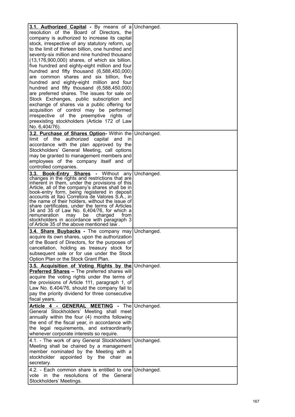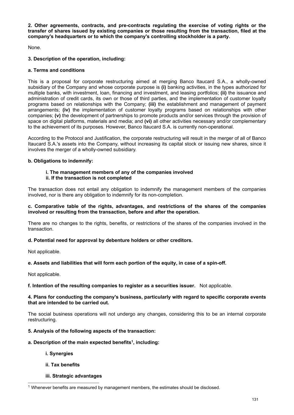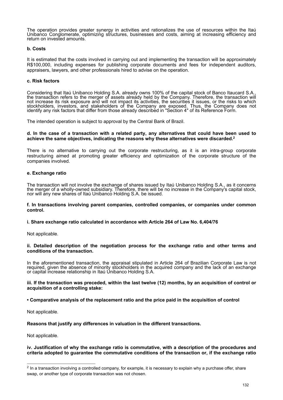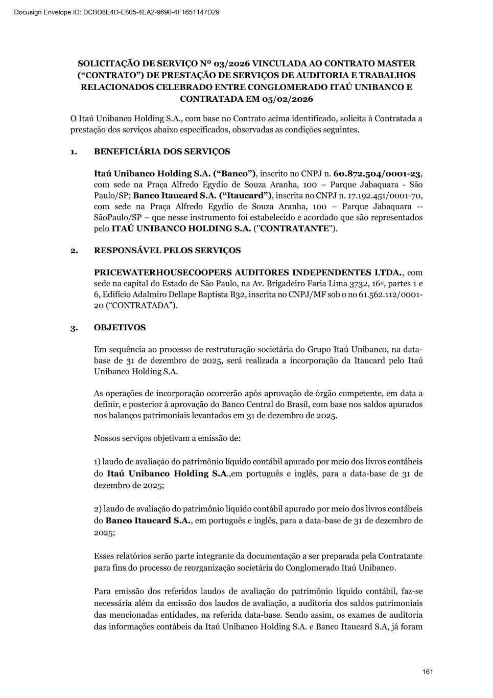 At the Extraordinary General Stockholders’ Meeting I. Corporate Reorganization in the Itaú Unibanco Conglomerate The Itaú Unibanco Conglomerate has been consistently seeking to rationalize the use of its resources and optimize its structures and businesses, with a view to providing greater efficiency and return on invested capital. In this regard, the Board of Directors approved the proposal for corporate reorganization in connection with the merger, into the the Company, of Banco Itaucard S.A. (“Itaucard”), a company wholly owned by the Company (“Transaction” or “Merger”). Currently, Itaucard has no operational activities, and the activities previously carried out by this entity have already been transferred to the Company and other group companies in previous corporate reorganizations. Therefore, the purpose of the Transaction will be to extinguish Itaucard. The terms and conditions of the Merger are detailed in the “Protocol and Justification” and the “Appraisal Report”. This manual contains all the necessary documents for stockholders to deliberate on the Management Proposal. The “Protocol and Justification” establishes the terms and conditions of the Merger. The Appraisal Report, based on the balance sheet as of December 31, 2025 of Itaucard and the Company, was prepared by the specialized firm PricewaterhouseCoopers Auditores Independentes Ltda. – PwC. These documents are included in Attachment V, corresponding to the content of Attachment I of CVM Resolution 81/22. Attachment VI contains the Information on Appraisers, as required by Attachment L of CVM Resolution 81/22. II. Amendment to the Company's Bylaws Considering that (i) on November 27, 2025, the Company's Board of Directors resolved to cancel 78,850,638 book-entry preferred shares held in treasury, which were acquired by the Company through the share buyback program authorized by the Board of Directors at a meeting held on February 5, 2025, pursuant to CVM Resolution 77/22; (ii) on December 18, 2025, the Company's Board of Directors approved an increase in the Company's subscribed and paid-in capital stock, within the limit of the authorized capital provided for in the Articles of Association, in the amount of R$ 12,846,837,880.00 (twelve billion, eight hundred and forty-six million, eight hundred and thirty-seven thousand, eight hundred and eighty reais), increasing it from R$ 124,063,060,190.00 (one hundred and twenty-four billion, sixty-three million, sixty thousand, one hundred and ninety reais) to R$ 136,909,898,070.00 (one hundred and thirty-six billion, nine hundred and nine million, eight hundred and ninety-eight thousand and seventy reais) through the capitalization of amounts recorded in the Company's Profit Reserves and the issuance of 321,170,947 (three hundred and twenty-one million, one hundred and seventy thousand, nine hundred and forty-seven) new book- entry shares, without par value, being 163,623,582 (one hundred and sixty-three million, six hundred and twenty-three thousand, five hundred and eighty-two) common shares and 157,547,365 (one hundred and fifty-seven million, five hundred and forty-seven thousand, three hundred and sixty-five) preferred shares, the Company's management proposes to the Extraordinary General Stockholders’ Meeting the amendment of the Bylaws to: a) reflect the new composition of the share capital, resulting from the cancellation of preferred shares and the increase in share capital within the limit of the authorized capital, as per resolutions of the Board of Directors taken at meetings held on November 27, 2025 and December 18, 2025, respectively. Therefore, it is proposed that article 3, caput, of the Company's Bylaws be amended; and b) amend item 9.1 of article 9 of the Bylaws to modify the maximum number of members of the Board of Officers of Directors, so that it is composed of 5 (five) to 60 (sixty) members. III. Consolidation of the Bylaws, with the amendments mentioned in item “II” above. Attachment VII contains a consolidated copy of the Bylaws, highlighting the proposed amendments, as well as a report detailing the origin and justification of these amendments and analyzing their legal and economic effects, pursuant to Article 12 of CVM Resolution No. 81/22. 13