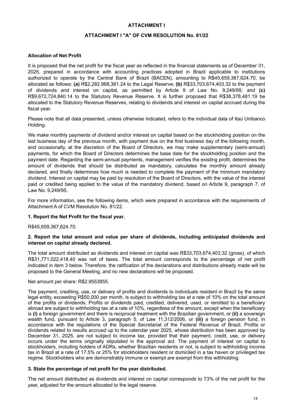 ATTACHMENT I ATTACHMENT I "A" OF CVM RESOLUTION No. 81/22 Allocation of Net Profit It is proposed that the net profit for the fiscal year as reflected in the financial statements as of December 31, 2025, prepared in accordance with accounting practices adopted in Brazil applicable to institutions authorized to operate by the Central Bank of Brazil (BACEN), amounting to R$45,659,367,624.70, be allocated as follows: (a) R$2,282,968,381.24 to the Legal Reserve; (b) R$33,703,674,403.32 to the payment of dividends and interest on capital, as permitted by Article 9 of Law No. 9,249/95; and (c) R$9,672,724,840.14 to the Statutory Revenue Reserve. It is further proposed that R$38,378,481.19 be allocated to the Statutory Revenue Reserves, relating to dividends and interest on capital accrued during the fiscal year. Please note that all data presented, unless otherwise indicated, refers to the individual data of Itaú Unibanco Holding. We make monthly payments of dividend and/or interest on capital based on the stockholding position on the last business day of the previous month, with payment due on the first business day of the following month. and occasionally, at the discretion of the Board of Directors, we may make supplementary (semi-annual) payments, for which the Board of Directors determines the base date for the stockholding position and the payment date. Regarding the semi-annual payments, management verifies the existing profit, determines the amount of dividends that should be distributed as mandatory, calculates the monthly amount already declared, and finally determines how much is needed to complete the payment of the minimum mandatory dividend. Interest on capital may be paid by resolution of the Board of Directors, with the value of the interest paid or credited being applied to the value of the mandatory dividend, based on Article 9, paragraph 7, of Law No. 9,249/95. For more information, see the following items, which were prepared in accordance with the requirements of Attachment A of CVM Resolution No. 81/22. 1. Report the Net Profit for the fiscal year. R$45,659,367,624.70. 2. Report the total amount and value per share of dividends, including anticipated dividends and interest on capital already declared. The total amount distributed as dividends and interest on capital was R$33,703,674,403.32 (gross), of which R$31,771,022,418.40 was net of taxes. The total amount corresponds to the percentage of net profit indicated in item 3 below. Therefore, the ratification of the declarations and distributions already made will be proposed to the General Meeting, and no new declarations will be proposed. Net amount per share: R$2.9553855. The payment, crediting, use, or delivery of profits and dividends to individuals resident in Brazil by the same legal entity, exceeding R$50,000 per month, is subject to withholding tax at a rate of 10% on the total amount of the profits or dividends. Profits or dividends paid, credited, delivered, used, or remitted to a beneficiary abroad are subject to withholding tax at a rate of 10%, regardless of the amount, except when the beneficiary is (i) a foreign government and there is reciprocal treatment with the Brazilian government, or (ii) a sovereign wealth fund, pursuant to Article 3, paragraph 5, of Law 11,312/2006, or (iii) a foreign pension fund, in accordance with the regulations of the Special Secretariat of the Federal Revenue of Brazil. Profits or dividends related to results accrued up to the calendar year 2025, whose distribution has been approved by December 31, 2025, are not subject to income tax, provided that their payment, credit, use, or delivery occurs under the terms originally stipulated in the approval act. The payment of interest on capital to stockholders, including holders of ADRs, whether Brazilian residents or not, is subject to withholding income tax in Brazil at a rate of 17.5% or 25% for stockholders resident or domiciled in a tax haven or privileged tax regime. Stockholders who are demonstrably immune or exempt are exempt from this withholding. 3. State the percentage of net profit for the year distributed. The net amount distributed as dividends and interest on capital corresponds to 73% of the net profit for the year, adjusted for the amount allocated to the legal reserve. 14