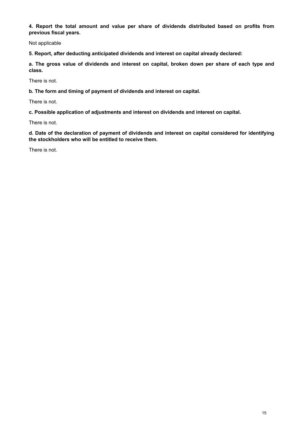 4. Report the total amount and value per share of dividends distributed based on profits from previous fiscal years. Not applicable 5. Report, after deducting anticipated dividends and interest on capital already declared: a. The gross value of dividends and interest on capital, broken down per share of each type and class. There is not. b. The form and timing of payment of dividends and interest on capital. There is not. c. Possible application of adjustments and interest on dividends and interest on capital. There is not. d. Date of the declaration of payment of dividends and interest on capital considered for identifying the stockholders who will be entitled to receive them. There is not. 15