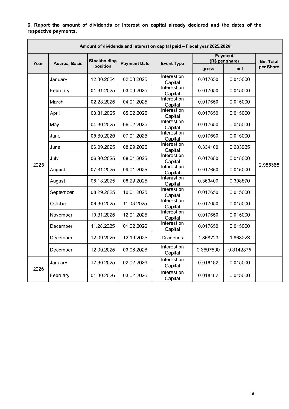 6. Report the amount of dividends or interest on capital already declared and the dates of the respective payments. Amount of dividends and interest on capital paid – Fiscal year 2025/2026 Year Accrual Basis Stockholding position Payment Date Event Type Payment (R$ per share) Net Total per Sharegross net 2025 January 12.30.2024 02.03.2025 Interest on Capital 0.017650 0.015000 2.955386 February 01.31.2025 03.06.2025 Interest on Capital 0.017650 0.015000 March 02.28.2025 04.01.2025 Interest on Capital 0.017650 0.015000 April 03.31.2025 05.02.2025 Interest on Capital 0.017650 0.015000 May 04.30.2025 06.02.2025 Interest on Capital 0.017650 0.015000 June 05.30.2025 07.01.2025 Interest on Capital 0.017650 0.015000 June 06.09.2025 08.29.2025 Interest on Capital 0.334100 0.283985 July 06.30.2025 08.01.2025 Interest on Capital 0.017650 0.015000 August 07.31.2025 09.01.2025 Interest on Capital 0.017650 0.015000 August 08.18.2025 08.29.2025 Interest on Capital 0.363400 0.308890 September 08.29.2025 10.01.2025 Interest on Capital 0.017650 0.015000 October 09.30.2025 11.03.2025 Interest on Capital 0.017650 0.015000 November 10.31.2025 12.01.2025 Interest on Capital 0.017650 0.015000 December 11.28.2025 01.02.2026 Interest on Capital 0.017650 0.015000 December 12.09.2025 12.19.2025 Dividends 1.868223 1.868223 December 12.09.2025 03.06.2026 Interest on Capital 0.3697500 0.3142875 2026 January 12.30.2025 02.02.2026 Interest on Capital 0.018182 0.015000 February 01.30.2026 03.02.2026 Interest on Capital 0.018182 0.015000 16