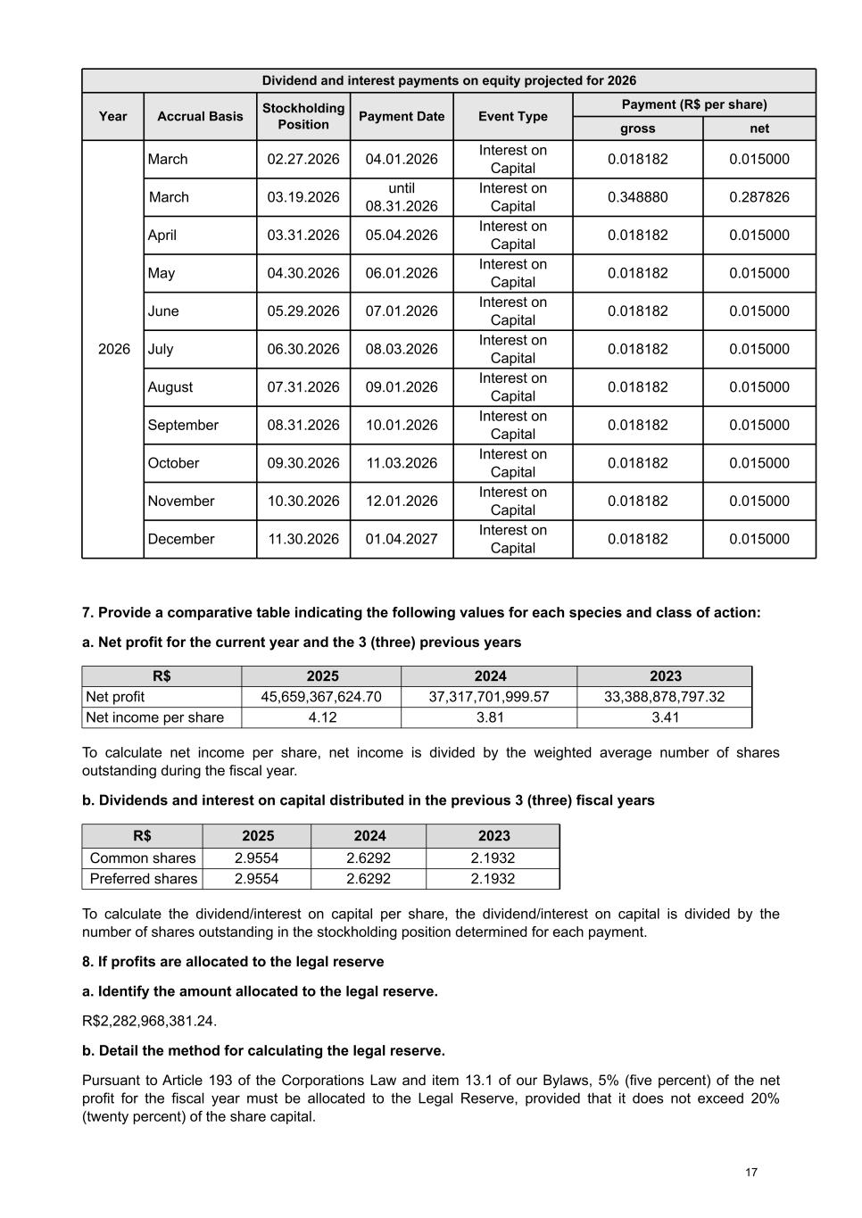 Dividend and interest payments on equity projected for 2026 Year Accrual Basis Stockholding Position Payment Date Event Type Payment (R$ per share) gross net 2026 March 02.27.2026 04.01.2026 Interest on Capital 0.018182 0.015000 March 03.19.2026 until 08.31.2026 Interest on Capital 0.348880 0.287826 April 03.31.2026 05.04.2026 Interest on Capital 0.018182 0.015000 May 04.30.2026 06.01.2026 Interest on Capital 0.018182 0.015000 June 05.29.2026 07.01.2026 Interest on Capital 0.018182 0.015000 July 06.30.2026 08.03.2026 Interest on Capital 0.018182 0.015000 August 07.31.2026 09.01.2026 Interest on Capital 0.018182 0.015000 September 08.31.2026 10.01.2026 Interest on Capital 0.018182 0.015000 October 09.30.2026 11.03.2026 Interest on Capital 0.018182 0.015000 November 10.30.2026 12.01.2026 Interest on Capital 0.018182 0.015000 December 11.30.2026 01.04.2027 Interest on Capital 0.018182 0.015000 7. Provide a comparative table indicating the following values for each species and class of action: a. Net profit for the current year and the 3 (three) previous years R$ 2025 2024 2023 Net profit 45,659,367,624.70 37,317,701,999.57 33,388,878,797.32 Net income per share 4.12 3.81 3.41 To calculate net income per share, net income is divided by the weighted average number of shares outstanding during the fiscal year. b. Dividends and interest on capital distributed in the previous 3 (three) fiscal years R$ 2025 2024 2023 Common shares 2.9554 2.6292 2.1932 Preferred shares 2.9554 2.6292 2.1932 To calculate the dividend/interest on capital per share, the dividend/interest on capital is divided by the number of shares outstanding in the stockholding position determined for each payment. 8. If profits are allocated to the legal reserve a. Identify the amount allocated to the legal reserve. R$2,282,968,381.24. b. Detail the method for calculating the legal reserve. Pursuant to Article 193 of the Corporations Law and item 13.1 of our Bylaws, 5% (five percent) of the net profit for the fiscal year must be allocated to the Legal Reserve, provided that it does not exceed 20% (twenty percent) of the share capital. 17