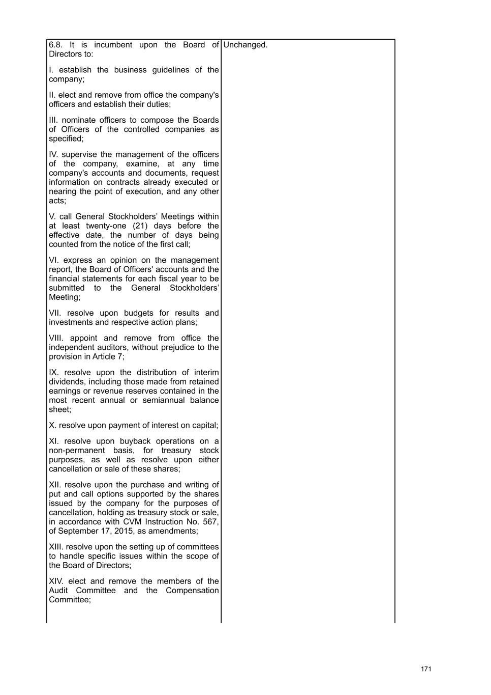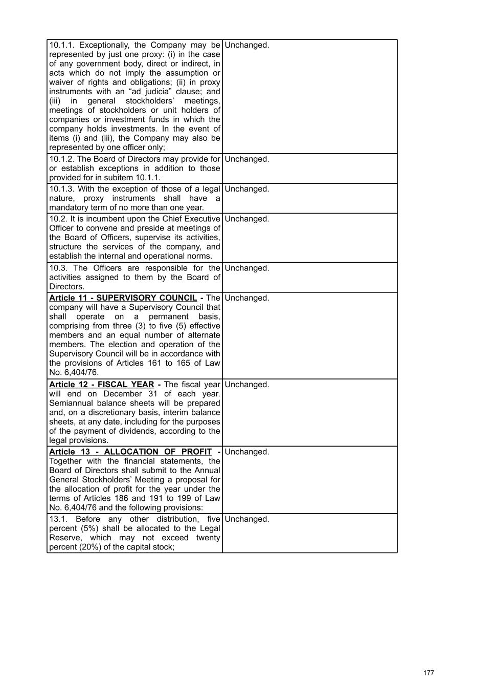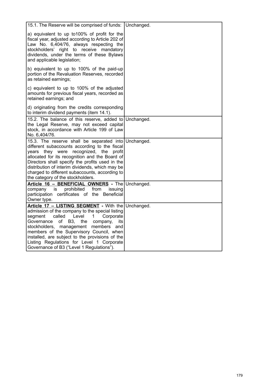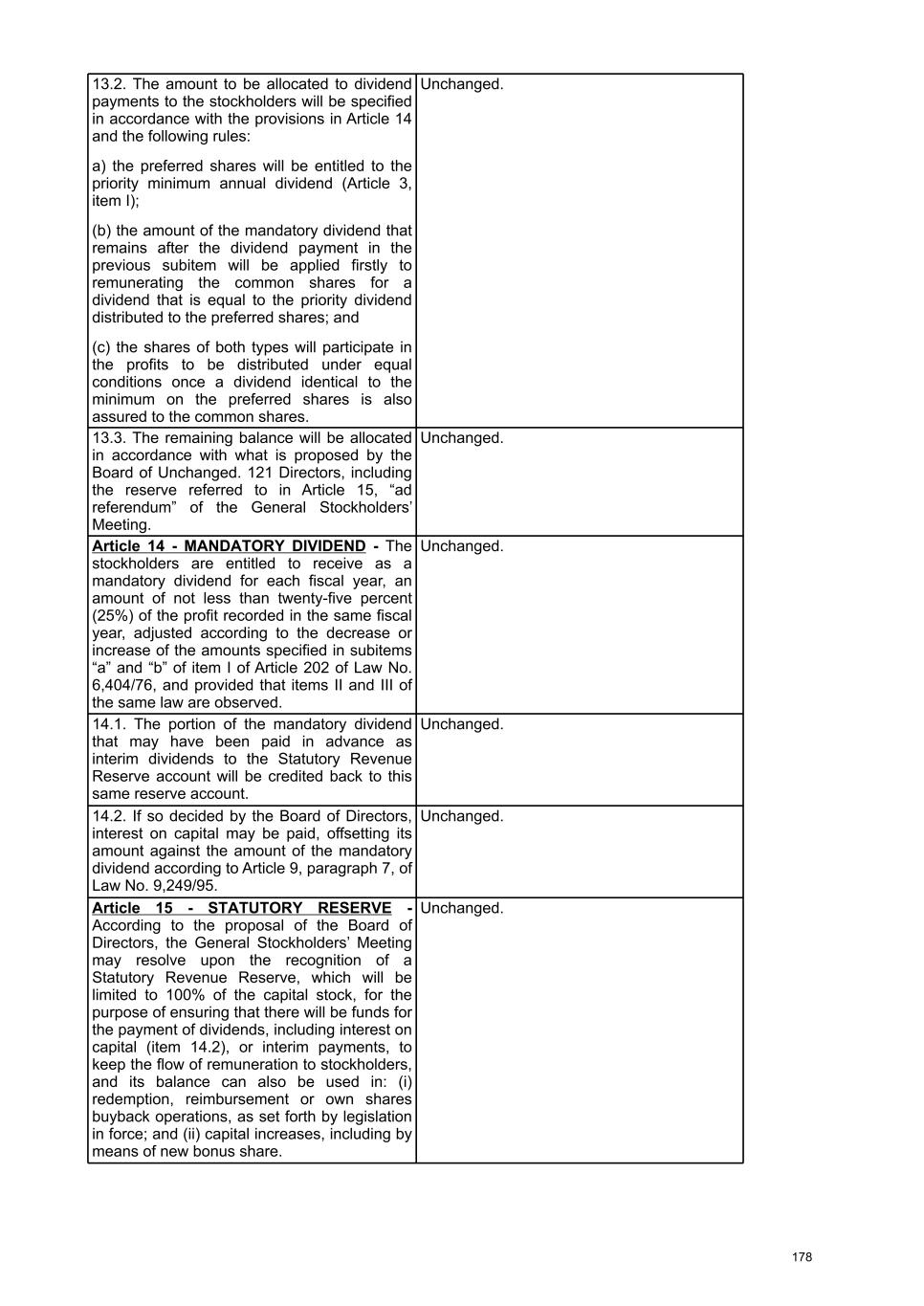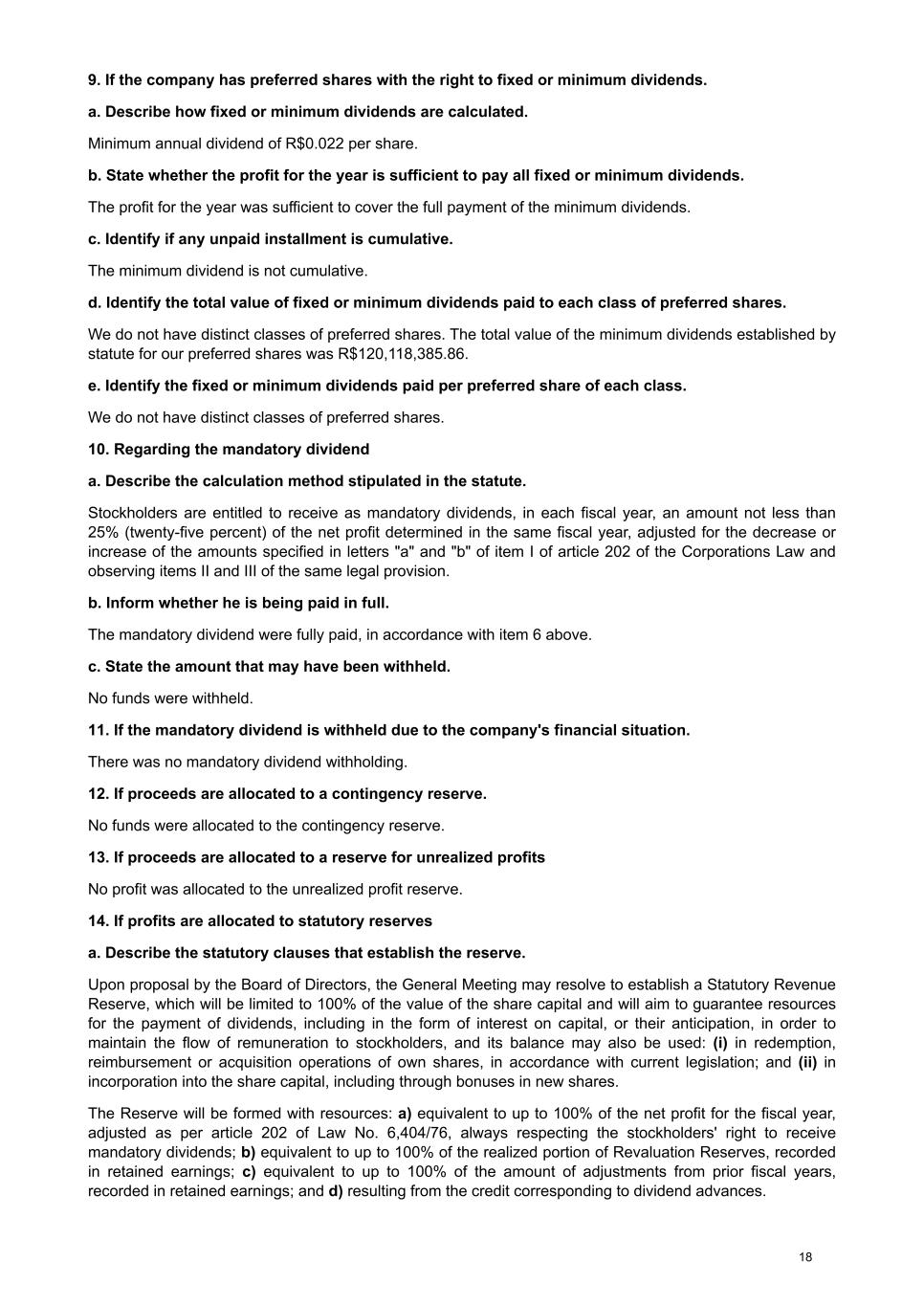 9. If the company has preferred shares with the right to fixed or minimum dividends. a. Describe how fixed or minimum dividends are calculated. Minimum annual dividend of R$0.022 per share. b. State whether the profit for the year is sufficient to pay all fixed or minimum dividends. The profit for the year was sufficient to cover the full payment of the minimum dividends. c. Identify if any unpaid installment is cumulative. The minimum dividend is not cumulative. d. Identify the total value of fixed or minimum dividends paid to each class of preferred shares. We do not have distinct classes of preferred shares. The total value of the minimum dividends established by statute for our preferred shares was R$120,118,385.86. e. Identify the fixed or minimum dividends paid per preferred share of each class. We do not have distinct classes of preferred shares. 10. Regarding the mandatory dividend a. Describe the calculation method stipulated in the statute. Stockholders are entitled to receive as mandatory dividends, in each fiscal year, an amount not less than 25% (twenty-five percent) of the net profit determined in the same fiscal year, adjusted for the decrease or increase of the amounts specified in letters "a" and "b" of item I of article 202 of the Corporations Law and observing items II and III of the same legal provision. b. Inform whether he is being paid in full. The mandatory dividend were fully paid, in accordance with item 6 above. c. State the amount that may have been withheld. No funds were withheld. 11. If the mandatory dividend is withheld due to the company's financial situation. There was no mandatory dividend withholding. 12. If proceeds are allocated to a contingency reserve. No funds were allocated to the contingency reserve. 13. If proceeds are allocated to a reserve for unrealized profits No profit was allocated to the unrealized profit reserve. 14. If profits are allocated to statutory reserves a. Describe the statutory clauses that establish the reserve. Upon proposal by the Board of Directors, the General Meeting may resolve to establish a Statutory Revenue Reserve, which will be limited to 100% of the value of the share capital and will aim to guarantee resources for the payment of dividends, including in the form of interest on capital, or their anticipation, in order to maintain the flow of remuneration to stockholders, and its balance may also be used: (i) in redemption, reimbursement or acquisition operations of own shares, in accordance with current legislation; and (ii) in incorporation into the share capital, including through bonuses in new shares. The Reserve will be formed with resources: a) equivalent to up to 100% of the net profit for the fiscal year, adjusted as per article 202 of Law No. 6,404/76, always respecting the stockholders' right to receive mandatory dividends; b) equivalent to up to 100% of the realized portion of Revaluation Reserves, recorded in retained earnings; c) equivalent to up to 100% of the amount of adjustments from prior fiscal years, recorded in retained earnings; and d) resulting from the credit corresponding to dividend advances. 18