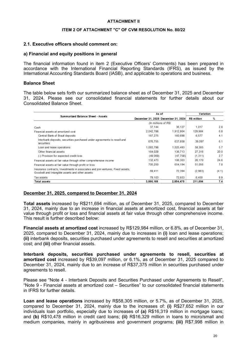 ATTACHMENT II ITEM 2 OF ATTACHMENT "C" OF CVM RESOLUTION No. 80/22 2.1. Executive officers should comment on: a) Financial and equity positions in general The financial information found in item 2 (Executive Officers’ Comments) has been prepared in accordance with the International Financial Reporting Standards (IFRS), as issued by the International Accounting Standards Board (IASB), and applicable to operations and business. Balance Sheet The table below sets forth our summarized balance sheet as of December 31, 2025 and December 31, 2024. Please see our consolidated financial statements for further details about our Consolidated Balance Sheet. December 31, 2025, compared to December 31, 2024 Total assets increased by R$211,694 million, as of December 31, 2025, compared to December 31, 2024, mainly due to an increase in financial assets at amortized cost, financial assets at fair value through profit or loss and financial assets at fair value through other comprehensive income. This result is further described below: Financial assets at amortized cost increased by R$129,984 million, or 6.8%, as of December 31, 2025, compared to December 31, 2024, mainly due to increases in (i) loan and lease operations; (ii) interbank deposits, securities purchased under agreements to resell and securities at amortized cost; and (iii) other financial assets. Interbank deposits, securities purchased under agreements to resell, securities at amortized cost increased by R$39,097 million, or 6.1%, as of December 31, 2025 compared to December 31, 2024, mainly due to an increase of R$37,375 million in securities purchased under agreements to resell. Please see “Note 4 - Interbank Deposits and Securities Purchased under Agreements to Resell”, “Note 9 - Financial assets at amortized cost – Securities” to our consolidated financial statements in IFRS for further details. Loan and lease operations increased by R$58,305 million, or 5.7%, as of December 31, 2025, compared to December 31, 2024, mainly due to the increases of: (i) R$27,652 million in our individuals loan portfolio, especially due to increases of (a) R$16,319 million in mortgage loans; and (b) R$10,478 million in credit card loans; (ii) R$16,329 million in loans to micro/small and medium companies, mainly in agribusiness and government programs; (iii) R$7,998 million in 20