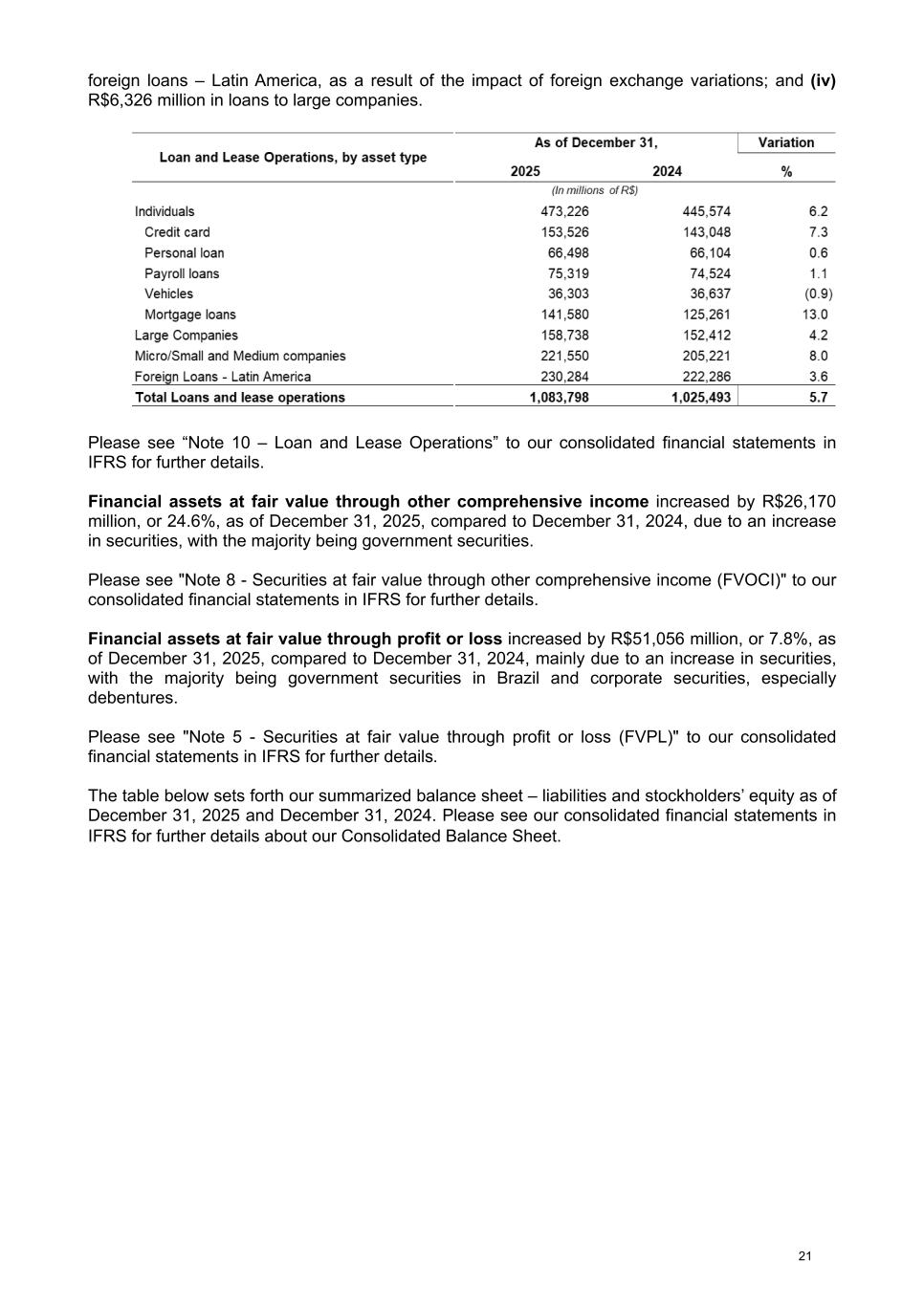 foreign loans – Latin America, as a result of the impact of foreign exchange variations; and (iv) R$6,326 million in loans to large companies. Please see “Note 10 – Loan and Lease Operations” to our consolidated financial statements in IFRS for further details. Financial assets at fair value through other comprehensive income increased by R$26,170 million, or 24.6%, as of December 31, 2025, compared to December 31, 2024, due to an increase in securities, with the majority being government securities. Please see "Note 8 - Securities at fair value through other comprehensive income (FVOCI)" to our consolidated financial statements in IFRS for further details. Financial assets at fair value through profit or loss increased by R$51,056 million, or 7.8%, as of December 31, 2025, compared to December 31, 2024, mainly due to an increase in securities, with the majority being government securities in Brazil and corporate securities, especially debentures. Please see "Note 5 - Securities at fair value through profit or loss (FVPL)" to our consolidated financial statements in IFRS for further details. The table below sets forth our summarized balance sheet – liabilities and stockholders’ equity as of December 31, 2025 and December 31, 2024. Please see our consolidated financial statements in IFRS for further details about our Consolidated Balance Sheet. 21