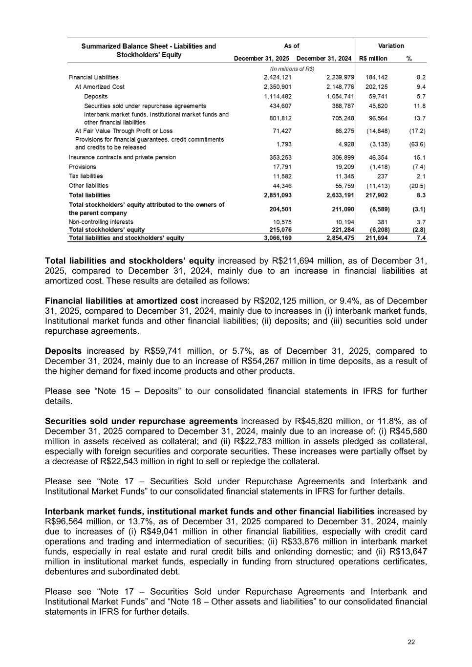Total liabilities and stockholders’ equity increased by R$211,694 million, as of December 31, 2025, compared to December 31, 2024, mainly due to an increase in financial liabilities at amortized cost. These results are detailed as follows: Financial liabilities at amortized cost increased by R$202,125 million, or 9.4%, as of December 31, 2025, compared to December 31, 2024, mainly due to increases in (i) interbank market funds, Institutional market funds and other financial liabilities; (ii) deposits; and (iii) securities sold under repurchase agreements. Deposits increased by R$59,741 million, or 5.7%, as of December 31, 2025, compared to December 31, 2024, mainly due to an increase of R$54,267 million in time deposits, as a result of the higher demand for fixed income products and other products. Please see “Note 15 – Deposits” to our consolidated financial statements in IFRS for further details. Securities sold under repurchase agreements increased by R$45,820 million, or 11.8%, as of December 31, 2025 compared to December 31, 2024, mainly due to an increase of: (i) R$45,580 million in assets received as collateral; and (ii) R$22,783 million in assets pledged as collateral, especially with foreign securities and corporate securities. These increases were partially offset by a decrease of R$22,543 million in right to sell or repledge the collateral. Please see “Note 17 – Securities Sold under Repurchase Agreements and Interbank and Institutional Market Funds” to our consolidated financial statements in IFRS for further details. Interbank market funds, institutional market funds and other financial liabilities increased by R$96,564 million, or 13.7%, as of December 31, 2025 compared to December 31, 2024, mainly due to increases of (i) R$49,041 million in other financial liabilities, especially with credit card operations and trading and intermediation of securities; (ii) R$33,876 million in interbank market funds, especially in real estate and rural credit bills and onlending domestic; and (ii) R$13,647 million in institutional market funds, especially in funding from structured operations certificates, debentures and subordinated debt. Please see “Note 17 – Securities Sold under Repurchase Agreements and Interbank and Institutional Market Funds” and “Note 18 – Other assets and liabilities” to our consolidated financial statements in IFRS for further details. 22