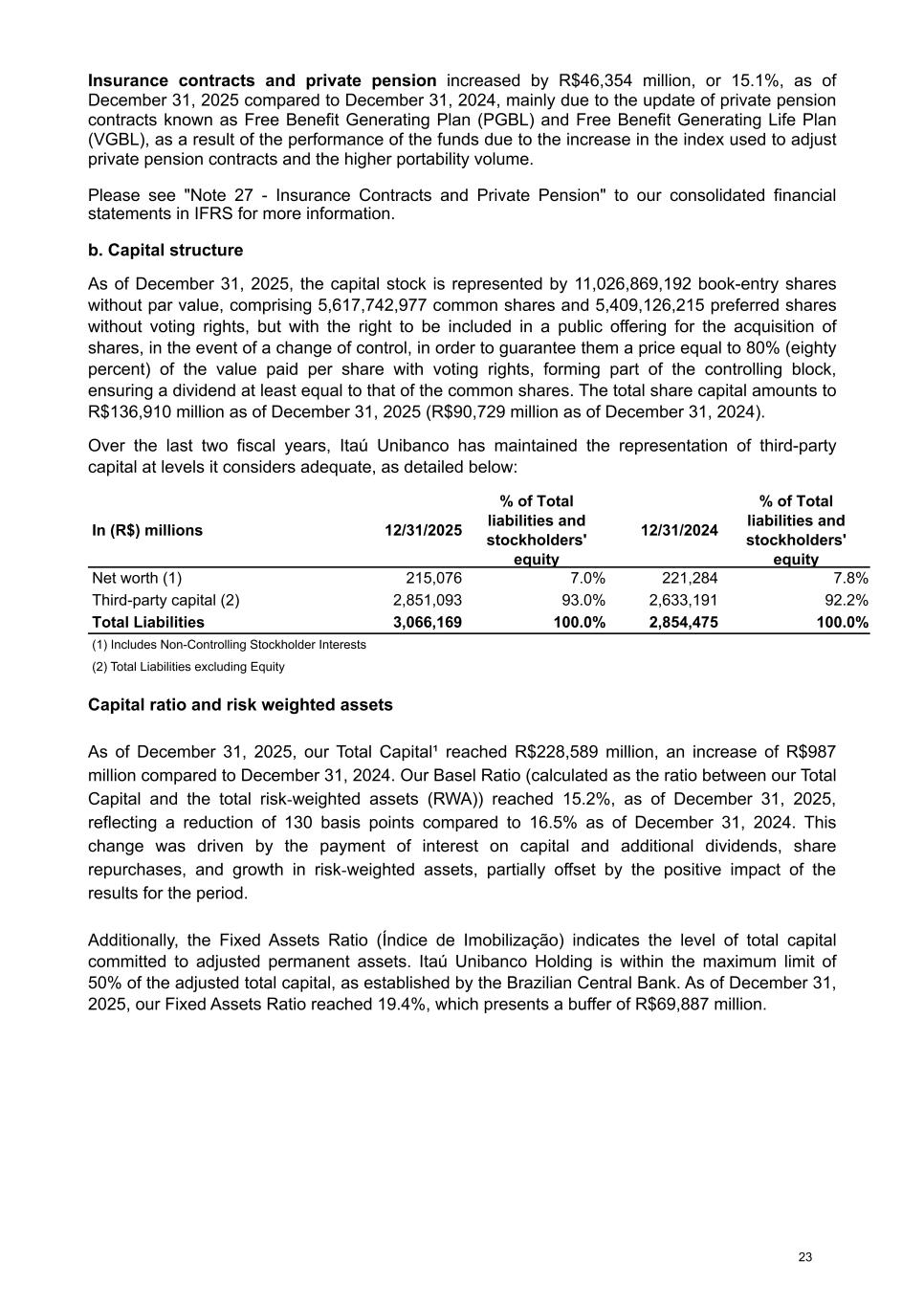 Insurance contracts and private pension increased by R$46,354 million, or 15.1%, as of December 31, 2025 compared to December 31, 2024, mainly due to the update of private pension contracts known as Free Benefit Generating Plan (PGBL) and Free Benefit Generating Life Plan (VGBL), as a result of the performance of the funds due to the increase in the index used to adjust private pension contracts and the higher portability volume. Please see "Note 27 - Insurance Contracts and Private Pension" to our consolidated financial statements in IFRS for more information. b. Capital structure As of December 31, 2025, the capital stock is represented by 11,026,869,192 book-entry shares without par value, comprising 5,617,742,977 common shares and 5,409,126,215 preferred shares without voting rights, but with the right to be included in a public offering for the acquisition of shares, in the event of a change of control, in order to guarantee them a price equal to 80% (eighty percent) of the value paid per share with voting rights, forming part of the controlling block, ensuring a dividend at least equal to that of the common shares. The total share capital amounts to R$136,910 million as of December 31, 2025 (R$90,729 million as of December 31, 2024). Over the last two fiscal years, Itaú Unibanco has maintained the representation of third-party capital at levels it considers adequate, as detailed below: In (R$) millions 12/31/2025 % of Total liabilities and stockholders' equity 12/31/2024 % of Total liabilities and stockholders' equity Net worth (1) 215,076 7.0 % 221,284 7.8 % Third-party capital (2) 2,851,093 93.0 % 2,633,191 92.2 % Total Liabilities 3,066,169 100.0 % 2,854,475 100.0 % (1) Includes Non-Controlling Stockholder Interests (2) Total Liabilities excluding Equity Capital ratio and risk weighted assets As of December 31, 2025, our Total Capital¹ reached R$228,589 million, an increase of R$987 million compared to December 31, 2024. Our Basel Ratio (calculated as the ratio between our Total Capital and the total risk-weighted assets (RWA)) reached 15.2%, as of December 31, 2025, reflecting a reduction of 130 basis points compared to 16.5% as of December 31, 2024. This change was driven by the payment of interest on capital and additional dividends, share repurchases, and growth in risk-weighted assets, partially offset by the positive impact of the results for the period. Additionally, the Fixed Assets Ratio (Índice de Imobilização) indicates the level of total capital committed to adjusted permanent assets. Itaú Unibanco Holding is within the maximum limit of 50% of the adjusted total capital, as established by the Brazilian Central Bank. As of December 31, 2025, our Fixed Assets Ratio reached 19.4%, which presents a buffer of R$69,887 million. 23