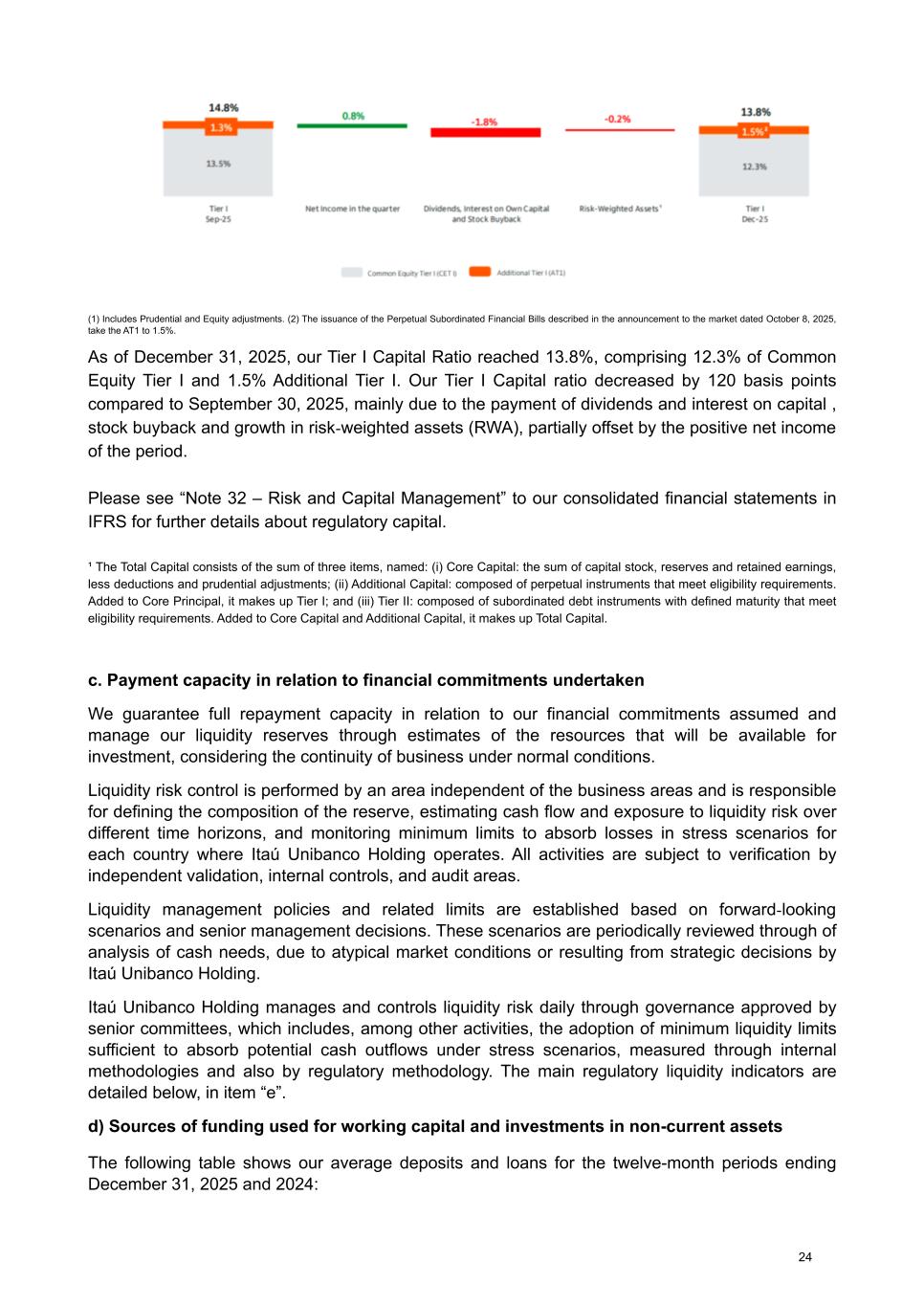 (1) Includes Prudential and Equity adjustments. (2) The issuance of the Perpetual Subordinated Financial Bills described in the announcement to the market dated October 8, 2025, take the AT1 to 1.5%. As of December 31, 2025, our Tier I Capital Ratio reached 13.8%, comprising 12.3% of Common Equity Tier I and 1.5% Additional Tier I. Our Tier I Capital ratio decreased by 120 basis points compared to September 30, 2025, mainly due to the payment of dividends and interest on capital , stock buyback and growth in risk-weighted assets (RWA), partially offset by the positive net income of the period. Please see “Note 32 – Risk and Capital Management” to our consolidated financial statements in IFRS for further details about regulatory capital. ¹ The Total Capital consists of the sum of three items, named: (i) Core Capital: the sum of capital stock, reserves and retained earnings, less deductions and prudential adjustments; (ii) Additional Capital: composed of perpetual instruments that meet eligibility requirements. Added to Core Principal, it makes up Tier I; and (iii) Tier II: composed of subordinated debt instruments with defined maturity that meet eligibility requirements. Added to Core Capital and Additional Capital, it makes up Total Capital. c. Payment capacity in relation to financial commitments undertaken We guarantee full repayment capacity in relation to our financial commitments assumed and manage our liquidity reserves through estimates of the resources that will be available for investment, considering the continuity of business under normal conditions. Liquidity risk control is performed by an area independent of the business areas and is responsible for defining the composition of the reserve, estimating cash flow and exposure to liquidity risk over different time horizons, and monitoring minimum limits to absorb losses in stress scenarios for each country where Itaú Unibanco Holding operates. All activities are subject to verification by independent validation, internal controls, and audit areas. Liquidity management policies and related limits are established based on forward-looking scenarios and senior management decisions. These scenarios are periodically reviewed through of analysis of cash needs, due to atypical market conditions or resulting from strategic decisions by Itaú Unibanco Holding. Itaú Unibanco Holding manages and controls liquidity risk daily through governance approved by senior committees, which includes, among other activities, the adoption of minimum liquidity limits sufficient to absorb potential cash outflows under stress scenarios, measured through internal methodologies and also by regulatory methodology. The main regulatory liquidity indicators are detailed below, in item “e”. d) Sources of funding used for working capital and investments in non-current assets The following table shows our average deposits and loans for the twelve-month periods ending December 31, 2025 and 2024: 24