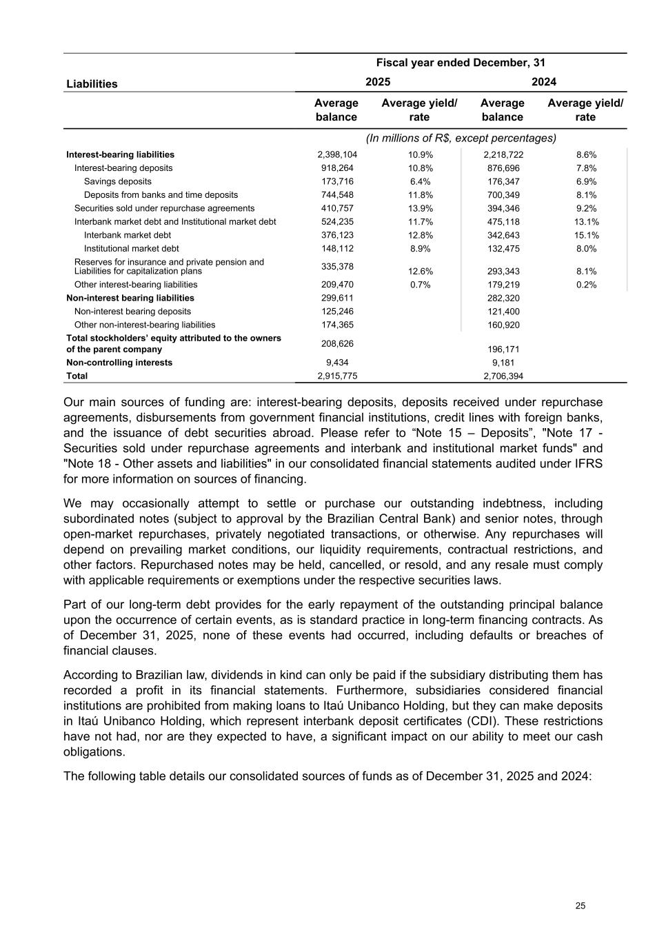 Liabilities Fiscal year ended December, 31 2025 2024 Average balance Average yield/ rate Average balance Average yield/ rate (In millions of R$, except percentages) Interest-bearing liabilities 2,398,104 10.9% 2,218,722 8.6% Interest-bearing deposits 918,264 10.8% 876,696 7.8% Savings deposits 173,716 6.4% 176,347 6.9% Deposits from banks and time deposits 744,548 11.8% 700,349 8.1% Securities sold under repurchase agreements 410,757 13.9% 394,346 9.2% Interbank market debt and Institutional market debt 524,235 11.7% 475,118 13.1% Interbank market debt 376,123 12.8% 342,643 15.1% Institutional market debt 148,112 8.9% 132,475 8.0% Reserves for insurance and private pension and Liabilities for capitalization plans 335,378 12.6% 293,343 8.1% Other interest-bearing liabilities 209,470 0.7% 179,219 0.2% Non-interest bearing liabilities 299,611 282,320 Non-interest bearing deposits 125,246 121,400 Other non-interest-bearing liabilities 174,365 160,920 Total stockholders’ equity attributed to the owners of the parent company 208,626 196,171 Non-controlling interests 9,434 9,181 Total 2,915,775 2,706,394 Our main sources of funding are: interest-bearing deposits, deposits received under repurchase agreements, disbursements from government financial institutions, credit lines with foreign banks, and the issuance of debt securities abroad. Please refer to “Note 15 – Deposits”, "Note 17 - Securities sold under repurchase agreements and interbank and institutional market funds" and "Note 18 - Other assets and liabilities" in our consolidated financial statements audited under IFRS for more information on sources of financing. We may occasionally attempt to settle or purchase our outstanding indebtness, including subordinated notes (subject to approval by the Brazilian Central Bank) and senior notes, through open-market repurchases, privately negotiated transactions, or otherwise. Any repurchases will depend on prevailing market conditions, our liquidity requirements, contractual restrictions, and other factors. Repurchased notes may be held, cancelled, or resold, and any resale must comply with applicable requirements or exemptions under the respective securities laws. Part of our long-term debt provides for the early repayment of the outstanding principal balance upon the occurrence of certain events, as is standard practice in long-term financing contracts. As of December 31, 2025, none of these events had occurred, including defaults or breaches of financial clauses. According to Brazilian law, dividends in kind can only be paid if the subsidiary distributing them has recorded a profit in its financial statements. Furthermore, subsidiaries considered financial institutions are prohibited from making loans to Itaú Unibanco Holding, but they can make deposits in Itaú Unibanco Holding, which represent interbank deposit certificates (CDI). These restrictions have not had, nor are they expected to have, a significant impact on our ability to meet our cash obligations. The following table details our consolidated sources of funds as of December 31, 2025 and 2024: 25