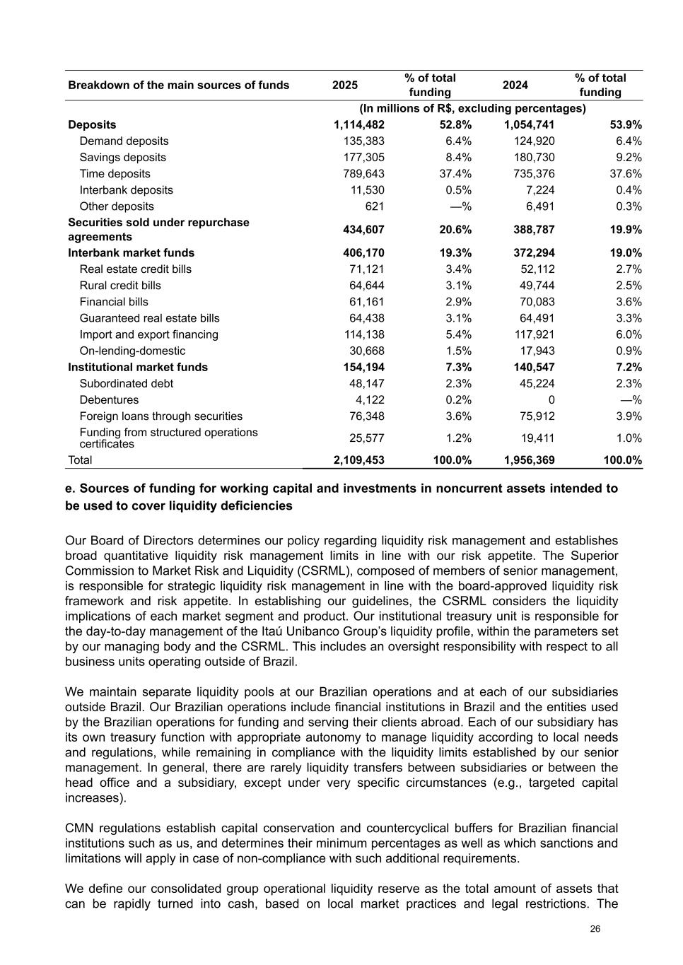 Breakdown of the main sources of funds 2025 % of total funding 2024 % of total funding (In millions of R$, excluding percentages) Deposits 1,114,482 52.8 % 1,054,741 53.9 % Demand deposits 135,383 6.4 % 124,920 6.4 % Savings deposits 177,305 8.4 % 180,730 9.2 % Time deposits 789,643 37.4 % 735,376 37.6 % Interbank deposits 11,530 0.5 % 7,224 0.4 % Other deposits 621 — % 6,491 0.3 % Securities sold under repurchase agreements 434,607 20.6 % 388,787 19.9 % Interbank market funds 406,170 19.3 % 372,294 19.0 % Real estate credit bills 71,121 3.4 % 52,112 2.7 % Rural credit bills 64,644 3.1 % 49,744 2.5 % Financial bills 61,161 2.9 % 70,083 3.6 % Guaranteed real estate bills 64,438 3.1 % 64,491 3.3 % Import and export financing 114,138 5.4 % 117,921 6.0 % On-lending-domestic 30,668 1.5 % 17,943 0.9 % Institutional market funds 154,194 7.3 % 140,547 7.2 % Subordinated debt 48,147 2.3 % 45,224 2.3 % Debentures 4,122 0.2 % 0 — % Foreign loans through securities 76,348 3.6 % 75,912 3.9 % Funding from structured operations certificates 25,577 1.2 % 19,411 1.0 % Total 2,109,453 100.0 % 1,956,369 100.0 % e. Sources of funding for working capital and investments in noncurrent assets intended to be used to cover liquidity deficiencies Our Board of Directors determines our policy regarding liquidity risk management and establishes broad quantitative liquidity risk management limits in line with our risk appetite. The Superior Commission to Market Risk and Liquidity (CSRML), composed of members of senior management, is responsible for strategic liquidity risk management in line with the board-approved liquidity risk framework and risk appetite. In establishing our guidelines, the CSRML considers the liquidity implications of each market segment and product. Our institutional treasury unit is responsible for the day-to-day management of the Itaú Unibanco Group’s liquidity profile, within the parameters set by our managing body and the CSRML. This includes an oversight responsibility with respect to all business units operating outside of Brazil. We maintain separate liquidity pools at our Brazilian operations and at each of our subsidiaries outside Brazil. Our Brazilian operations include financial institutions in Brazil and the entities used by the Brazilian operations for funding and serving their clients abroad. Each of our subsidiary has its own treasury function with appropriate autonomy to manage liquidity according to local needs and regulations, while remaining in compliance with the liquidity limits established by our senior management. In general, there are rarely liquidity transfers between subsidiaries or between the head office and a subsidiary, except under very specific circumstances (e.g., targeted capital increases). CMN regulations establish capital conservation and countercyclical buffers for Brazilian financial institutions such as us, and determines their minimum percentages as well as which sanctions and limitations will apply in case of non-compliance with such additional requirements. We define our consolidated group operational liquidity reserve as the total amount of assets that can be rapidly turned into cash, based on local market practices and legal restrictions. The 26