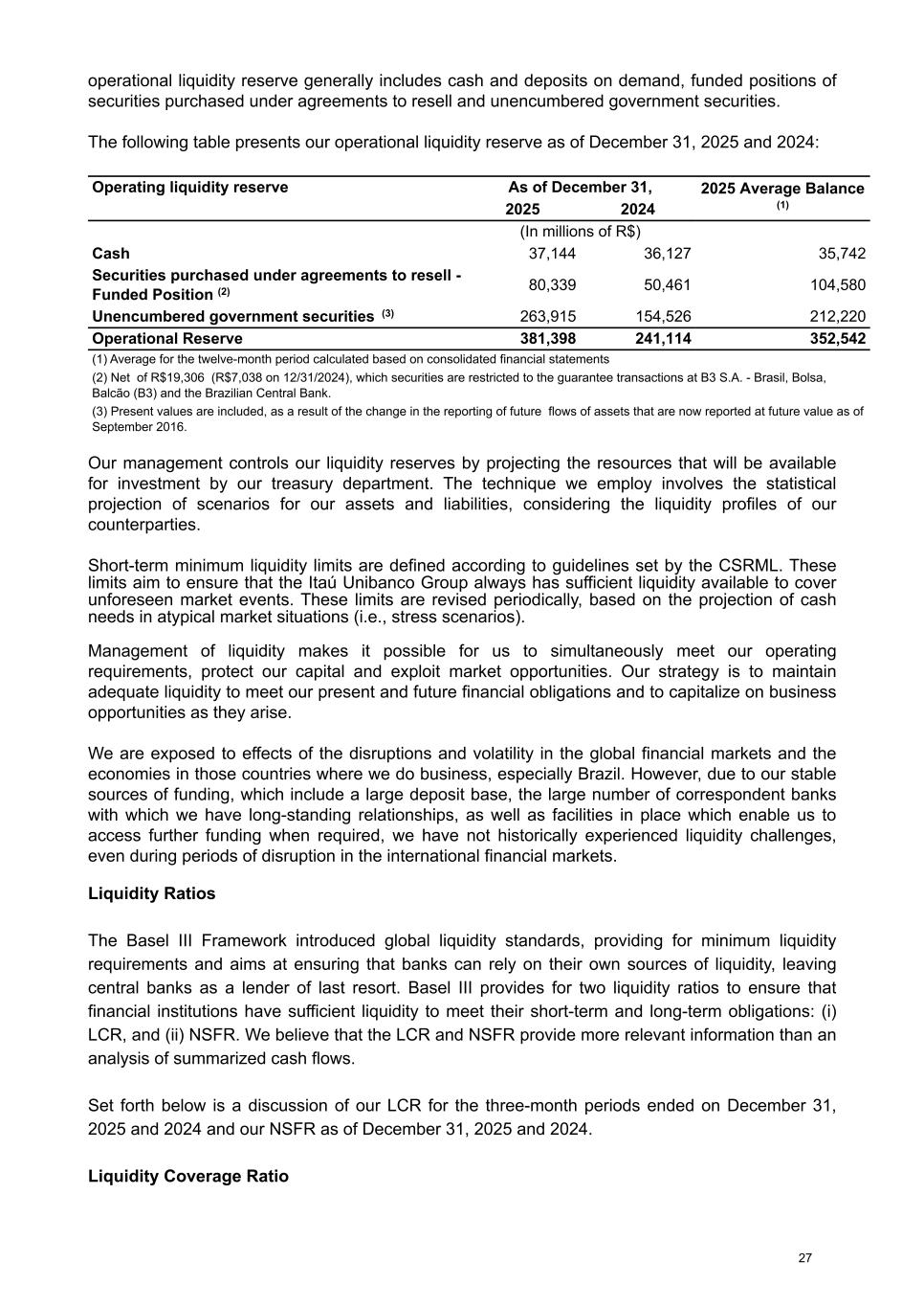 operational liquidity reserve generally includes cash and deposits on demand, funded positions of securities purchased under agreements to resell and unencumbered government securities. The following table presents our operational liquidity reserve as of December 31, 2025 and 2024: Operating liquidity reserve As of December 31, 2025 Average Balance (1)2025 2024 (In millions of R$) Cash 37,144 36,127 35,742 Securities purchased under agreements to resell - Funded Position (2) 80,339 50,461 104,580 Unencumbered government securities (3) 263,915 154,526 212,220 Operational Reserve 381,398 241,114 352,542 (1) Average for the twelve-month period calculated based on consolidated financial statements (2) Net of R$19,306 (R$7,038 on 12/31/2024), which securities are restricted to the guarantee transactions at B3 S.A. - Brasil, Bolsa, Balcão (B3) and the Brazilian Central Bank. (3) Present values are included, as a result of the change in the reporting of future flows of assets that are now reported at future value as of September 2016. Our management controls our liquidity reserves by projecting the resources that will be available for investment by our treasury department. The technique we employ involves the statistical projection of scenarios for our assets and liabilities, considering the liquidity profiles of our counterparties. Short-term minimum liquidity limits are defined according to guidelines set by the CSRML. These limits aim to ensure that the Itaú Unibanco Group always has sufficient liquidity available to cover unforeseen market events. These limits are revised periodically, based on the projection of cash needs in atypical market situations (i.e., stress scenarios). Management of liquidity makes it possible for us to simultaneously meet our operating requirements, protect our capital and exploit market opportunities. Our strategy is to maintain adequate liquidity to meet our present and future financial obligations and to capitalize on business opportunities as they arise. We are exposed to effects of the disruptions and volatility in the global financial markets and the economies in those countries where we do business, especially Brazil. However, due to our stable sources of funding, which include a large deposit base, the large number of correspondent banks with which we have long-standing relationships, as well as facilities in place which enable us to access further funding when required, we have not historically experienced liquidity challenges, even during periods of disruption in the international financial markets. Liquidity Ratios The Basel III Framework introduced global liquidity standards, providing for minimum liquidity requirements and aims at ensuring that banks can rely on their own sources of liquidity, leaving central banks as a lender of last resort. Basel III provides for two liquidity ratios to ensure that financial institutions have sufficient liquidity to meet their short-term and long-term obligations: (i) LCR, and (ii) NSFR. We believe that the LCR and NSFR provide more relevant information than an analysis of summarized cash flows. Set forth below is a discussion of our LCR for the three-month periods ended on December 31, 2025 and 2024 and our NSFR as of December 31, 2025 and 2024. Liquidity Coverage Ratio 27