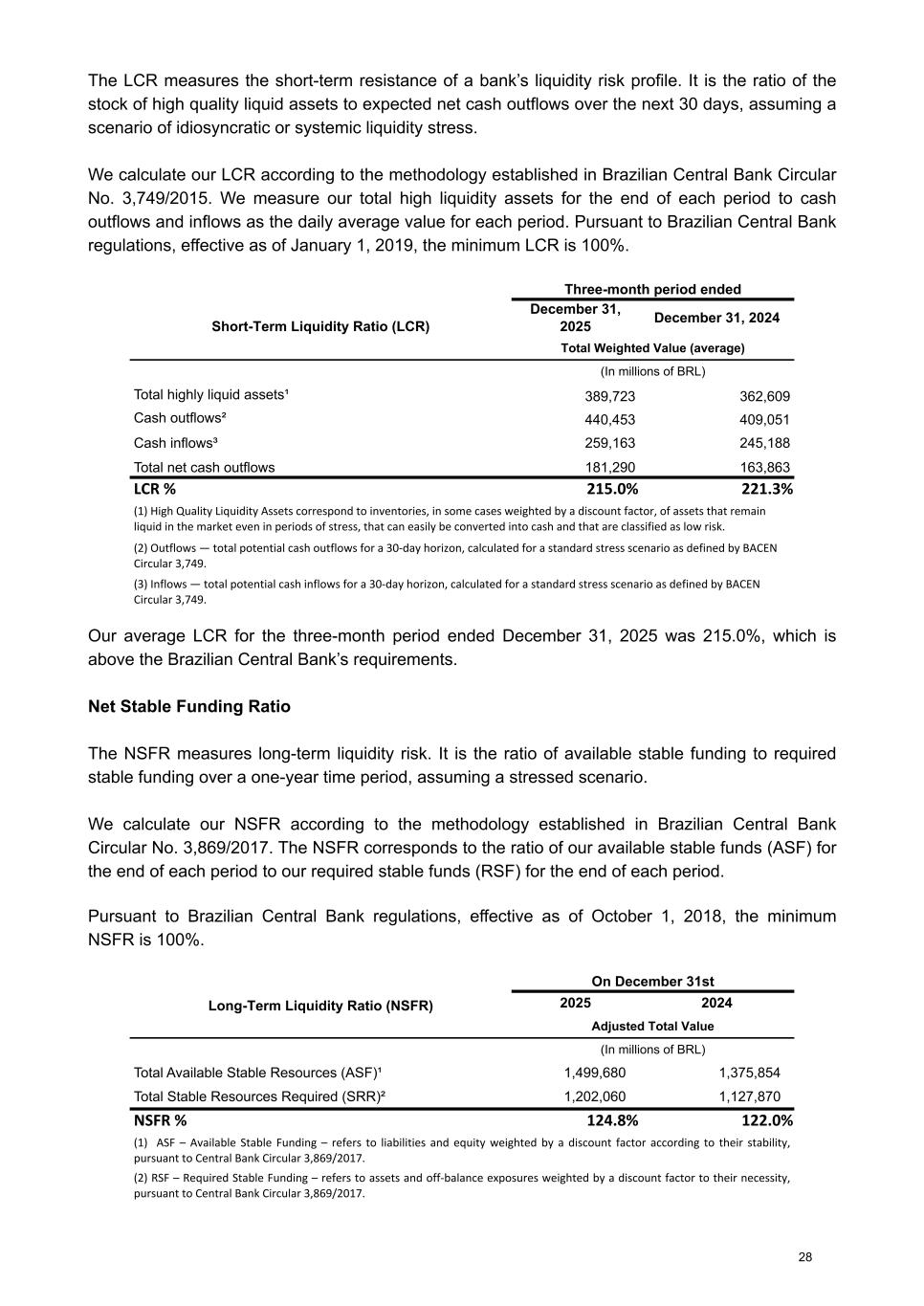 The LCR measures the short-term resistance of a bank’s liquidity risk profile. It is the ratio of the stock of high quality liquid assets to expected net cash outflows over the next 30 days, assuming a scenario of idiosyncratic or systemic liquidity stress. We calculate our LCR according to the methodology established in Brazilian Central Bank Circular No. 3,749/2015. We measure our total high liquidity assets for the end of each period to cash outflows and inflows as the daily average value for each period. Pursuant to Brazilian Central Bank regulations, effective as of January 1, 2019, the minimum LCR is 100%. Three-month period ended Short-Term Liquidity Ratio (LCR) December 31, 2025 December 31, 2024 Total Weighted Value (average) (In millions of BRL) Total highly liquid assets¹ 389,723 362,609 Cash outflows² 440,453 409,051 Cash inflows³ 259,163 245,188 Total net cash outflows 181,290 163,863 LCR % 215.0 % 221.3 % (1) High Quality Liquidity Assets correspond to inventories, in some cases weighted by a discount factor, of assets that remain liquid in the market even in periods of stress, that can easily be converted into cash and that are classified as low risk. (2) Outflows — total potential cash outflows for a 30-day horizon, calculated for a standard stress scenario as defined by BACEN Circular 3,749. (3) Inflows — total potential cash inflows for a 30-day horizon, calculated for a standard stress scenario as defined by BACEN Circular 3,749. Our average LCR for the three-month period ended December 31, 2025 was 215.0%, which is above the Brazilian Central Bank’s requirements. Net Stable Funding Ratio The NSFR measures long-term liquidity risk. It is the ratio of available stable funding to required stable funding over a one-year time period, assuming a stressed scenario. We calculate our NSFR according to the methodology established in Brazilian Central Bank Circular No. 3,869/2017. The NSFR corresponds to the ratio of our available stable funds (ASF) for the end of each period to our required stable funds (RSF) for the end of each period. Pursuant to Brazilian Central Bank regulations, effective as of October 1, 2018, the minimum NSFR is 100%. On December 31st Long-Term Liquidity Ratio (NSFR) 2025 2024 Adjusted Total Value (In millions of BRL) Total Available Stable Resources (ASF)¹ 1,499,680 1,375,854 Total Stable Resources Required (SRR)² 1,202,060 1,127,870 NSFR % 124.8 % 122.0 % (1) ASF – Available Stable Funding – refers to liabilities and equity weighted by a discount factor according to their stability, pursuant to Central Bank Circular 3,869/2017. (2) RSF – Required Stable Funding – refers to assets and off-balance exposures weighted by a discount factor to their necessity, pursuant to Central Bank Circular 3,869/2017. 28