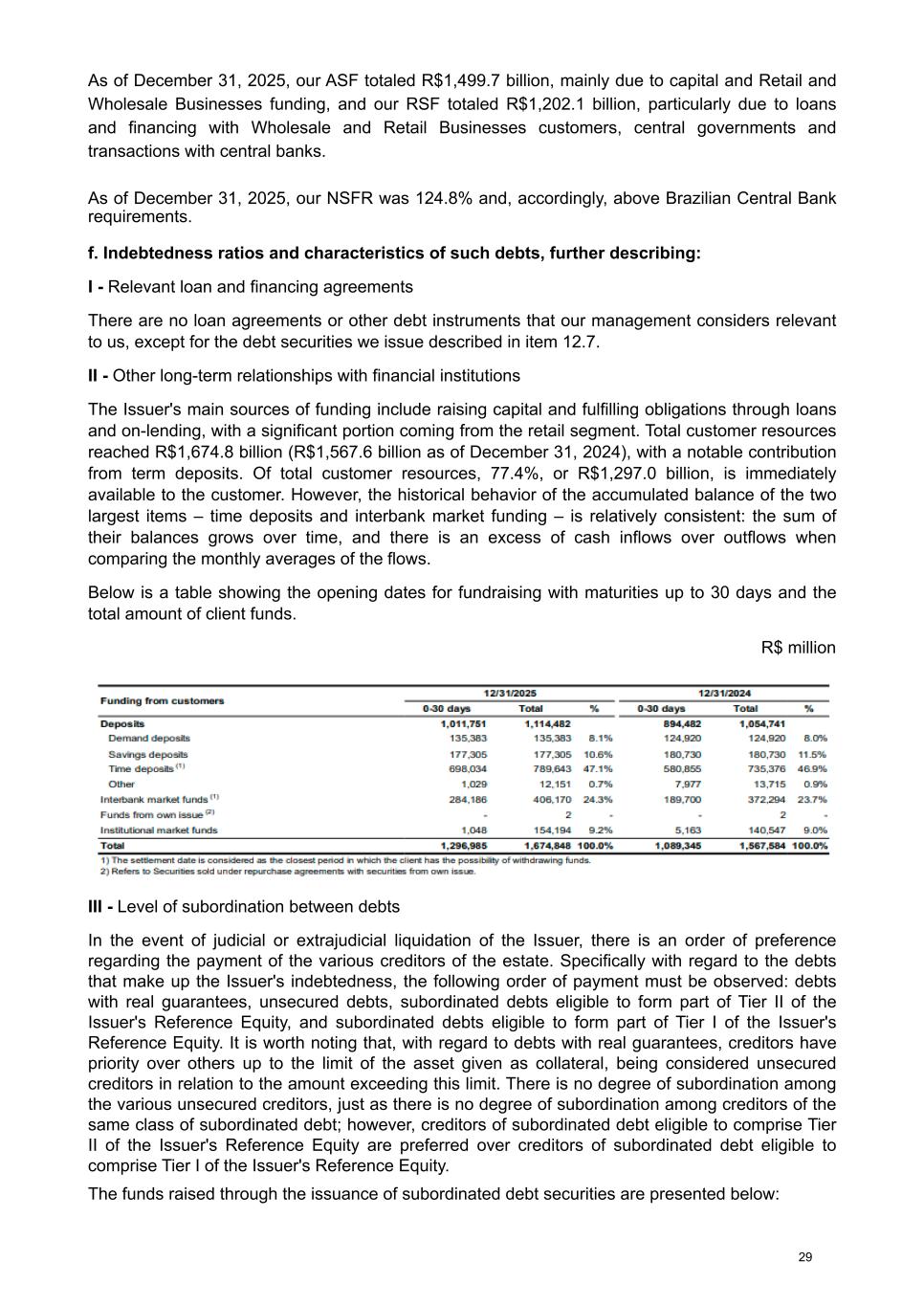 As of December 31, 2025, our ASF totaled R$1,499.7 billion, mainly due to capital and Retail and Wholesale Businesses funding, and our RSF totaled R$1,202.1 billion, particularly due to loans and financing with Wholesale and Retail Businesses customers, central governments and transactions with central banks. As of December 31, 2025, our NSFR was 124.8% and, accordingly, above Brazilian Central Bank requirements. f. Indebtedness ratios and characteristics of such debts, further describing: I - Relevant loan and financing agreements There are no loan agreements or other debt instruments that our management considers relevant to us, except for the debt securities we issue described in item 12.7. II - Other long-term relationships with financial institutions The Issuer's main sources of funding include raising capital and fulfilling obligations through loans and on-lending, with a significant portion coming from the retail segment. Total customer resources reached R$1,674.8 billion (R$1,567.6 billion as of December 31, 2024), with a notable contribution from term deposits. Of total customer resources, 77.4%, or R$1,297.0 billion, is immediately available to the customer. However, the historical behavior of the accumulated balance of the two largest items – time deposits and interbank market funding – is relatively consistent: the sum of their balances grows over time, and there is an excess of cash inflows over outflows when comparing the monthly averages of the flows. Below is a table showing the opening dates for fundraising with maturities up to 30 days and the total amount of client funds. R$ million III - Level of subordination between debts In the event of judicial or extrajudicial liquidation of the Issuer, there is an order of preference regarding the payment of the various creditors of the estate. Specifically with regard to the debts that make up the Issuer's indebtedness, the following order of payment must be observed: debts with real guarantees, unsecured debts, subordinated debts eligible to form part of Tier II of the Issuer's Reference Equity, and subordinated debts eligible to form part of Tier I of the Issuer's Reference Equity. It is worth noting that, with regard to debts with real guarantees, creditors have priority over others up to the limit of the asset given as collateral, being considered unsecured creditors in relation to the amount exceeding this limit. There is no degree of subordination among the various unsecured creditors, just as there is no degree of subordination among creditors of the same class of subordinated debt; however, creditors of subordinated debt eligible to comprise Tier II of the Issuer's Reference Equity are preferred over creditors of subordinated debt eligible to comprise Tier I of the Issuer's Reference Equity. The funds raised through the issuance of subordinated debt securities are presented below: 29