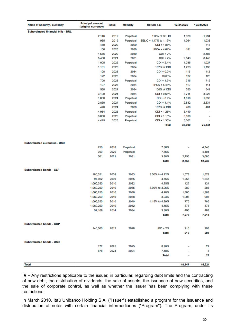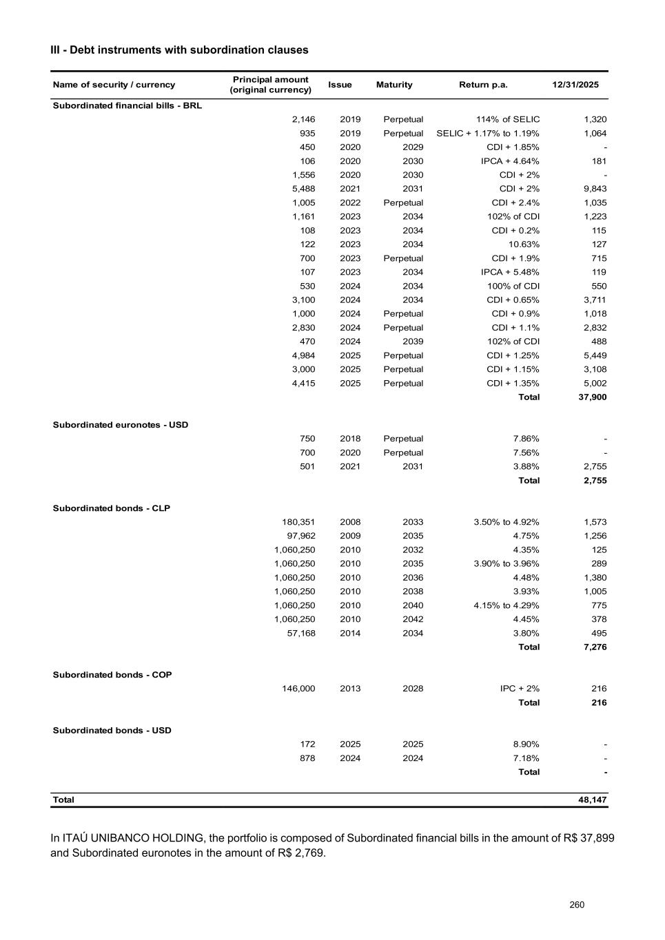 III - Debt instruments with subordination clauses Name of security / currency Principal amount (original currency) Issue Maturity Return p.a. 12/31/2025 Subordinated financial bills - BRL 2,146 2019 Perpetual 114% of SELIC 1,320 935 2019 Perpetual SELIC + 1.17% to 1.19% 1,064 450 2020 2029 CDI + 1.85% - 106 2020 2030 IPCA + 4.64% 181 1,556 2020 2030 CDI + 2% - 5,488 2021 2031 CDI + 2% 9,843 1,005 2022 Perpetual CDI + 2.4% 1,035 1,161 2023 2034 102% of CDI 1,223 108 2023 2034 CDI + 0.2% 115 122 2023 2034 10.63% 127 700 2023 Perpetual CDI + 1.9% 715 107 2023 2034 IPCA + 5.48% 119 530 2024 2034 100% of CDI 550 3,100 2024 2034 CDI + 0.65% 3,711 1,000 2024 Perpetual CDI + 0.9% 1,018 2,830 2024 Perpetual CDI + 1.1% 2,832 470 2024 2039 102% of CDI 488 4,984 2025 Perpetual CDI + 1.25% 5,449 3,000 2025 Perpetual CDI + 1.15% 3,108 4,415 2025 Perpetual CDI + 1.35% 5,002 Total 37,900 Subordinated euronotes - USD 750 2018 Perpetual 7.86% - 700 2020 Perpetual 7.56% - 501 2021 2031 3.88% 2,755 Total 2,755 Subordinated bonds - CLP 180,351 2008 2033 3.50% to 4.92% 1,573 97,962 2009 2035 4.75% 1,256 1,060,250 2010 2032 4.35% 125 1,060,250 2010 2035 3.90% to 3.96% 289 1,060,250 2010 2036 4.48% 1,380 1,060,250 2010 2038 3.93% 1,005 1,060,250 2010 2040 4.15% to 4.29% 775 1,060,250 2010 2042 4.45% 378 57,168 2014 2034 3.80% 495 Total 7,276 Subordinated bonds - COP 146,000 2013 2028 IPC + 2% 216 Total 216 Subordinated bonds - USD 172 2025 2025 8.90% - 878 2024 2024 7.18% - 1 Total - Total 48,147 In ITAÚ UNIBANCO HOLDING, the portfolio is composed of Subordinated financial bills in the amount of R$ 37,899 and Subordinated euronotes in the amount of R$ 2,769. 260