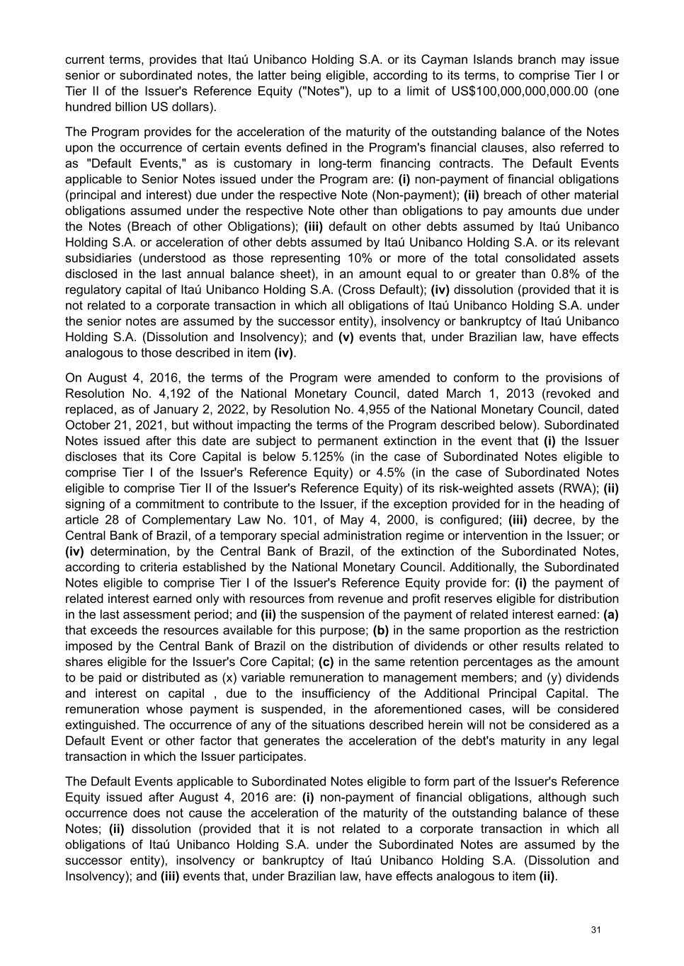 current terms, provides that Itaú Unibanco Holding S.A. or its Cayman Islands branch may issue senior or subordinated notes, the latter being eligible, according to its terms, to comprise Tier I or Tier II of the Issuer's Reference Equity ("Notes"), up to a limit of US$100,000,000,000.00 (one hundred billion US dollars). The Program provides for the acceleration of the maturity of the outstanding balance of the Notes upon the occurrence of certain events defined in the Program's financial clauses, also referred to as "Default Events," as is customary in long-term financing contracts. The Default Events applicable to Senior Notes issued under the Program are: (i) non-payment of financial obligations (principal and interest) due under the respective Note (Non-payment); (ii) breach of other material obligations assumed under the respective Note other than obligations to pay amounts due under the Notes (Breach of other Obligations); (iii) default on other debts assumed by Itaú Unibanco Holding S.A. or acceleration of other debts assumed by Itaú Unibanco Holding S.A. or its relevant subsidiaries (understood as those representing 10% or more of the total consolidated assets disclosed in the last annual balance sheet), in an amount equal to or greater than 0.8% of the regulatory capital of Itaú Unibanco Holding S.A. (Cross Default); (iv) dissolution (provided that it is not related to a corporate transaction in which all obligations of Itaú Unibanco Holding S.A. under the senior notes are assumed by the successor entity), insolvency or bankruptcy of Itaú Unibanco Holding S.A. (Dissolution and Insolvency); and (v) events that, under Brazilian law, have effects analogous to those described in item (iv). On August 4, 2016, the terms of the Program were amended to conform to the provisions of Resolution No. 4,192 of the National Monetary Council, dated March 1, 2013 (revoked and replaced, as of January 2, 2022, by Resolution No. 4,955 of the National Monetary Council, dated October 21, 2021, but without impacting the terms of the Program described below). Subordinated Notes issued after this date are subject to permanent extinction in the event that (i) the Issuer discloses that its Core Capital is below 5.125% (in the case of Subordinated Notes eligible to comprise Tier I of the Issuer's Reference Equity) or 4.5% (in the case of Subordinated Notes eligible to comprise Tier II of the Issuer's Reference Equity) of its risk-weighted assets (RWA); (ii) signing of a commitment to contribute to the Issuer, if the exception provided for in the heading of article 28 of Complementary Law No. 101, of May 4, 2000, is configured; (iii) decree, by the Central Bank of Brazil, of a temporary special administration regime or intervention in the Issuer; or (iv) determination, by the Central Bank of Brazil, of the extinction of the Subordinated Notes, according to criteria established by the National Monetary Council. Additionally, the Subordinated Notes eligible to comprise Tier I of the Issuer's Reference Equity provide for: (i) the payment of related interest earned only with resources from revenue and profit reserves eligible for distribution in the last assessment period; and (ii) the suspension of the payment of related interest earned: (a) that exceeds the resources available for this purpose; (b) in the same proportion as the restriction imposed by the Central Bank of Brazil on the distribution of dividends or other results related to shares eligible for the Issuer's Core Capital; (c) in the same retention percentages as the amount to be paid or distributed as (x) variable remuneration to management members; and (y) dividends and interest on capital , due to the insufficiency of the Additional Principal Capital. The remuneration whose payment is suspended, in the aforementioned cases, will be considered extinguished. The occurrence of any of the situations described herein will not be considered as a Default Event or other factor that generates the acceleration of the debt's maturity in any legal transaction in which the Issuer participates. The Default Events applicable to Subordinated Notes eligible to form part of the Issuer's Reference Equity issued after August 4, 2016 are: (i) non-payment of financial obligations, although such occurrence does not cause the acceleration of the maturity of the outstanding balance of these Notes; (ii) dissolution (provided that it is not related to a corporate transaction in which all obligations of Itaú Unibanco Holding S.A. under the Subordinated Notes are assumed by the successor entity), insolvency or bankruptcy of Itaú Unibanco Holding S.A. (Dissolution and Insolvency); and (iii) events that, under Brazilian law, have effects analogous to item (ii). 31