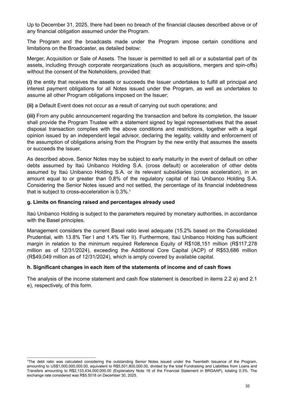 Up to December 31, 2025, there had been no breach of the financial clauses described above or of any financial obligation assumed under the Program. The Program and the broadcasts made under the Program impose certain conditions and limitations on the Broadcaster, as detailed below: Merger, Acquisition or Sale of Assets. The Issuer is permitted to sell all or a substantial part of its assets, including through corporate reorganizations (such as acquisitions, mergers and spin-offs) without the consent of the Noteholders, provided that: (i) the entity that receives the assets or succeeds the Issuer undertakes to fulfill all principal and interest payment obligations for all Notes issued under the Program, as well as undertakes to assume all other Program obligations imposed on the Issuer; (ii) a Default Event does not occur as a result of carrying out such operations; and (iii) From any public announcement regarding the transaction and before its completion, the Issuer shall provide the Program Trustee with a statement signed by legal representatives that the asset disposal transaction complies with the above conditions and restrictions, together with a legal opinion issued by an independent legal advisor, declaring the legality, validity and enforcement of the assumption of obligations arising from the Program by the new entity that assumes the assets or succeeds the Issuer. As described above, Senior Notes may be subject to early maturity in the event of default on other debts assumed by Itaú Unibanco Holding S.A. (cross default) or acceleration of other debts assumed by Itaú Unibanco Holding S.A. or its relevant subsidiaries (cross acceleration), in an amount equal to or greater than 0.8% of the regulatory capital of Itaú Unibanco Holding S.A. Considering the Senior Notes issued and not settled, the percentage of its financial indebtedness that is subject to cross-acceleration is 0.3%.1 g. Limits on financing raised and percentages already used Itaú Unibanco Holding is subject to the parameters required by monetary authorities, in accordance with the Basel principles. Management considers the current Basel ratio level adequate (15.2% based on the Consolidated Prudential, with 13.8% Tier I and 1.4% Tier II). Furthermore, Itaú Unibanco Holding has sufficient margin in relation to the minimum required Reference Equity of R$108,151 million (R$117,278 million as of 12/31/2024), exceeding the Additional Core Capital (ACP) of R$53,686 million (R$49,049 million as of 12/31/2024), which is amply covered by available capital. h. Significant changes in each item of the statements of income and of cash flows The analysis of the income statement and cash flow statement is described in items 2.2 a) and 2.1 e), respectively, of this form. 1The debt ratio was calculated considering the outstanding Senior Notes issued under the Twentieth Issuance of the Program, amounting to US$1,000,000,000.00, equivalent to R$5,501,800,000.00, divided by the total Fundraising and Liabilities from Loans and Transfers amounting to R$2,133,434,000,000.00 (Explanatory Note 16 of the Financial Statement in BRGAAP), totaling 0.3%. The exchange rate considered was R$5.5018 on December 30, 2025. 32