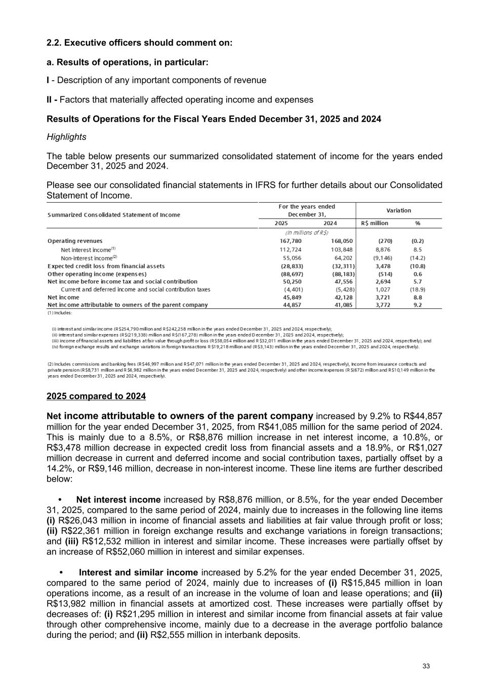 2.2. Executive officers should comment on: a. Results of operations, in particular: I - Description of any important components of revenue II - Factors that materially affected operating income and expenses Results of Operations for the Fiscal Years Ended December 31, 2025 and 2024 Highlights The table below presents our summarized consolidated statement of income for the years ended December 31, 2025 and 2024. Please see our consolidated financial statements in IFRS for further details about our Consolidated Statement of Income. 2025 compared to 2024 Net income attributable to owners of the parent company increased by 9.2% to R$44,857 million for the year ended December 31, 2025, from R$41,085 million for the same period of 2024. This is mainly due to a 8.5%, or R$8,876 million increase in net interest income, a 10.8%, or R$3,478 million decrease in expected credit loss from financial assets and a 18.9%, or R$1,027 million decrease in current and deferred income and social contribution taxes, partially offset by a 14.2%, or R$9,146 million, decrease in non-interest income. These line items are further described below: • Net interest income increased by R$8,876 million, or 8.5%, for the year ended December 31, 2025, compared to the same period of 2024, mainly due to increases in the following line items (i) R$26,043 million in income of financial assets and liabilities at fair value through profit or loss; (ii) R$22,361 million in foreign exchange results and exchange variations in foreign transactions; and (iii) R$12,532 million in interest and similar income. These increases were partially offset by an increase of R$52,060 million in interest and similar expenses. • Interest and similar income increased by 5.2% for the year ended December 31, 2025, compared to the same period of 2024, mainly due to increases of (i) R$15,845 million in loan operations income, as a result of an increase in the volume of loan and lease operations; and (ii) R$13,982 million in financial assets at amortized cost. These increases were partially offset by decreases of: (i) R$21,295 million in interest and similar income from financial assets at fair value through other comprehensive income, mainly due to a decrease in the average portfolio balance during the period; and (ii) R$2,555 million in interbank deposits. 33