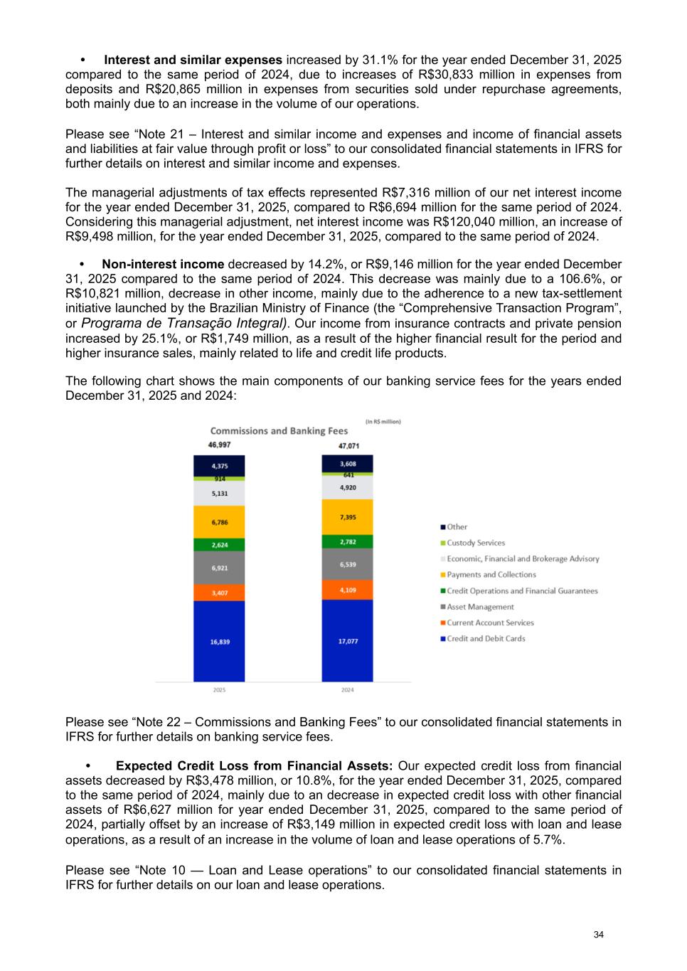 • Interest and similar expenses increased by 31.1% for the year ended December 31, 2025 compared to the same period of 2024, due to increases of R$30,833 million in expenses from deposits and R$20,865 million in expenses from securities sold under repurchase agreements, both mainly due to an increase in the volume of our operations. Please see “Note 21 – Interest and similar income and expenses and income of financial assets and liabilities at fair value through profit or loss” to our consolidated financial statements in IFRS for further details on interest and similar income and expenses. The managerial adjustments of tax effects represented R$7,316 million of our net interest income for the year ended December 31, 2025, compared to R$6,694 million for the same period of 2024. Considering this managerial adjustment, net interest income was R$120,040 million, an increase of R$9,498 million, for the year ended December 31, 2025, compared to the same period of 2024. • Non-interest income decreased by 14.2%, or R$9,146 million for the year ended December 31, 2025 compared to the same period of 2024. This decrease was mainly due to a 106.6%, or R$10,821 million, decrease in other income, mainly due to the adherence to a new tax-settlement initiative launched by the Brazilian Ministry of Finance (the “Comprehensive Transaction Program”, or Programa de Transação Integral). Our income from insurance contracts and private pension increased by 25.1%, or R$1,749 million, as a result of the higher financial result for the period and higher insurance sales, mainly related to life and credit life products. The following chart shows the main components of our banking service fees for the years ended December 31, 2025 and 2024: Please see “Note 22 – Commissions and Banking Fees” to our consolidated financial statements in IFRS for further details on banking service fees. • Expected Credit Loss from Financial Assets: Our expected credit loss from financial assets decreased by R$3,478 million, or 10.8%, for the year ended December 31, 2025, compared to the same period of 2024, mainly due to an decrease in expected credit loss with other financial assets of R$6,627 million for year ended December 31, 2025, compared to the same period of 2024, partially offset by an increase of R$3,149 million in expected credit loss with loan and lease operations, as a result of an increase in the volume of loan and lease operations of 5.7%. Please see “Note 10 — Loan and Lease operations” to our consolidated financial statements in IFRS for further details on our loan and lease operations. 34