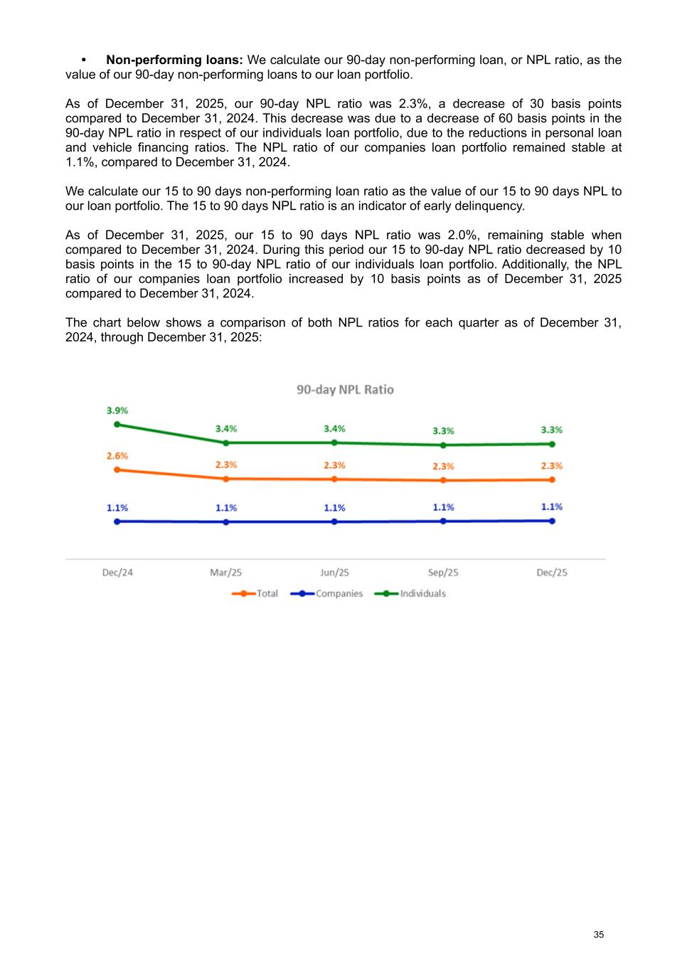 • Non-performing loans: We calculate our 90-day non-performing loan, or NPL ratio, as the value of our 90-day non-performing loans to our loan portfolio. As of December 31, 2025, our 90-day NPL ratio was 2.3%, a decrease of 30 basis points compared to December 31, 2024. This decrease was due to a decrease of 60 basis points in the 90-day NPL ratio in respect of our individuals loan portfolio, due to the reductions in personal loan and vehicle financing ratios. The NPL ratio of our companies loan portfolio remained stable at 1.1%, compared to December 31, 2024. We calculate our 15 to 90 days non-performing loan ratio as the value of our 15 to 90 days NPL to our loan portfolio. The 15 to 90 days NPL ratio is an indicator of early delinquency. As of December 31, 2025, our 15 to 90 days NPL ratio was 2.0%, remaining stable when compared to December 31, 2024. During this period our 15 to 90-day NPL ratio decreased by 10 basis points in the 15 to 90-day NPL ratio of our individuals loan portfolio. Additionally, the NPL ratio of our companies loan portfolio increased by 10 basis points as of December 31, 2025 compared to December 31, 2024. The chart below shows a comparison of both NPL ratios for each quarter as of December 31, 2024, through December 31, 2025: 35