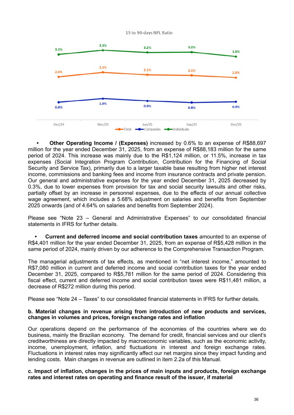 • Other Operating Income / (Expenses) increased by 0.6% to an expense of R$88,697 million for the year ended December 31, 2025, from an expense of R$88,183 million for the same period of 2024. This increase was mainly due to the R$1,124 million, or 11.5%, increase in tax expenses (Social Integration Program Contribution, Contribution for the Financing of Social Security and Service Tax), primarily due to a larger taxable base resulting from higher net interest income, commissions and banking fees and income from insurance contracts and private pension. Our general and administrative expenses for the year ended December 31, 2025 decreased by 0.3%, due to lower expenses from provision for tax and social security lawsuits and other risks, partially offset by an increase in personnel expenses, due to the effects of our annual collective wage agreement, which includes a 5.68% adjustment on salaries and benefits from September 2025 onwards (and of 4.64% on salaries and benefits from September 2024). Please see “Note 23 – General and Administrative Expenses” to our consolidated financial statements in IFRS for further details. • Current and deferred income and social contribution taxes amounted to an expense of R$4,401 million for the year ended December 31, 2025, from an expense of R$5,428 million in the same period of 2024, mainly driven by our adherence to the Comprehensive Transaction Program. The managerial adjustments of tax effects, as mentioned in “net interest income,” amounted to R$7,080 million in current and deferred income and social contribution taxes for the year ended December 31, 2025, compared to R$5,781 million for the same period of 2024. Considering this fiscal effect, current and deferred income and social contribution taxes were R$11,481 million, a decrease of R$272 million during this period. Please see “Note 24 – Taxes” to our consolidated financial statements in IFRS for further details. b. Material changes in revenue arising from introduction of new products and services, changes in volumes and prices, foreign exchange rates and inflation Our operations depend on the performance of the economies of the countries where we do business, mainly the Brazilian economy. The demand for credit, financial services and our client’s creditworthiness are directly impacted by macroeconomic variables, such as the economic activity, income, unemployment, inflation, and fluctuations in interest and foreign exchange rates. Fluctuations in interest rates may significantly affect our net margins since they impact funding and lending costs. Main changes in revenue are outlined in item 2.2a of this Manual. c. Impact of inflation, changes in the prices of main inputs and products, foreign exchange rates and interest rates on operating and finance result of the issuer, if material 36