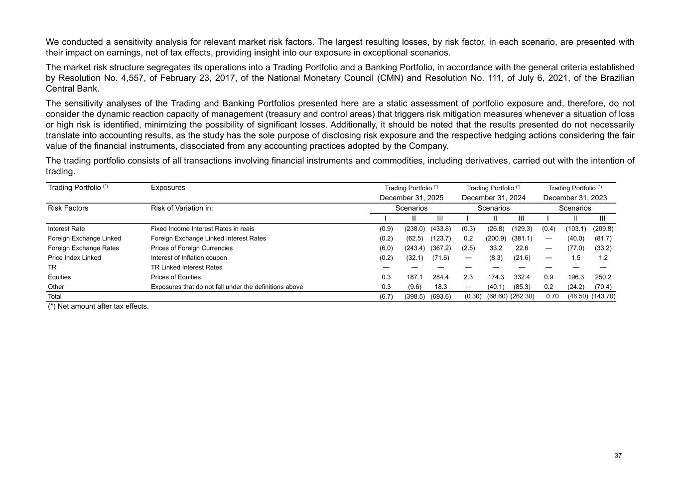 We conducted a sensitivity analysis for relevant market risk factors. The largest resulting losses, by risk factor, in each scenario, are presented with their impact on earnings, net of tax effects, providing insight into our exposure in exceptional scenarios. The market risk structure segregates its operations into a Trading Portfolio and a Banking Portfolio, in accordance with the general criteria established by Resolution No. 4,557, of February 23, 2017, of the National Monetary Council (CMN) and Resolution No. 111, of July 6, 2021, of the Brazilian Central Bank. The sensitivity analyses of the Trading and Banking Portfolios presented here are a static assessment of portfolio exposure and, therefore, do not consider the dynamic reaction capacity of management (treasury and control areas) that triggers risk mitigation measures whenever a situation of loss or high risk is identified, minimizing the possibility of significant losses. Additionally, it should be noted that the results presented do not necessarily translate into accounting results, as the study has the sole purpose of disclosing risk exposure and the respective hedging actions considering the fair value of the financial instruments, dissociated from any accounting practices adopted by the Company. The trading portfolio consists of all transactions involving financial instruments and commodities, including derivatives, carried out with the intention of trading. Trading Portfolio (*) Exposures Trading Portfolio (*) Trading Portfolio (*) Trading Portfolio (*) December 31, 2025 December 31, 2024 December 31, 2023 Risk Factors Risk of Variation in: Scenarios Scenarios Scenarios I II III I II III I II III Interest Rate Fixed Income Interest Rates in reais (0.9) (238.0) (433.8) (0.3) (26.8) (129.3) (0.4) (103.1) (209.8) Foreign Exchange Linked Foreign Exchange Linked Interest Rates (0.2) (62.5) (123.7) 0.2 (200.9) (381.1) — (40.0) (81.7) Foreign Exchange Rates Prices of Foreign Currencies (6.0) (243.4) (367.2) (2.5) 33.2 22.6 — (77.0) (33.2) Price Index Linked Interest of Inflation coupon (0.2) (32.1) (71.6) — (8.3) (21.6) — 1.5 1.2 TR TR Linked Interest Rates — — — — — — — — — Equities Prices of Equities 0.3 187.1 284.4 2.3 174.3 332.4 0.9 196.3 250.2 Other Exposures that do not fall under the definitions above 0.3 (9.6) 18.3 — (40.1) (85.3) 0.2 (24.2) (70.4) Total (6.7) (398.5) (693.6) (0.30) (68.60) (262.30) 0.70 (46.50) (143.70) (*) Net amount after tax effects. 37