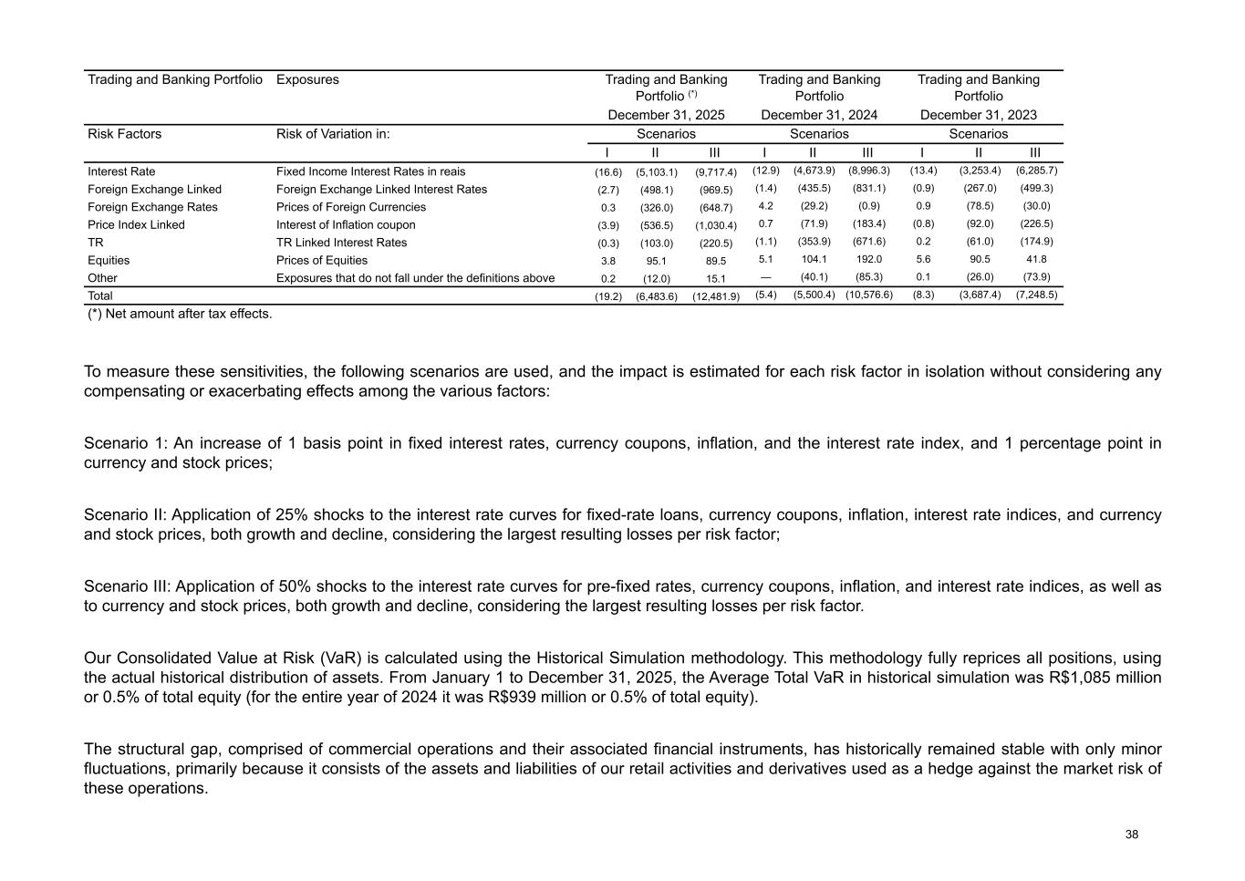 Trading and Banking Portfolio Exposures Trading and Banking Portfolio (*) Trading and Banking Portfolio Trading and Banking Portfolio December 31, 2025 December 31, 2024 December 31, 2023 Risk Factors Risk of Variation in: Scenarios Scenarios Scenarios I II III I II III I II III Interest Rate Fixed Income Interest Rates in reais (16.6) (5,103.1) (9,717.4) (12.9) (4,673.9) (8,996.3) (13.4) (3,253.4) (6,285.7) Foreign Exchange Linked Foreign Exchange Linked Interest Rates (2.7) (498.1) (969.5) (1.4) (435.5) (831.1) (0.9) (267.0) (499.3) Foreign Exchange Rates Prices of Foreign Currencies 0.3 (326.0) (648.7) 4.2 (29.2) (0.9) 0.9 (78.5) (30.0) Price Index Linked Interest of Inflation coupon (3.9) (536.5) (1,030.4) 0.7 (71.9) (183.4) (0.8) (92.0) (226.5) TR TR Linked Interest Rates (0.3) (103.0) (220.5) (1.1) (353.9) (671.6) 0.2 (61.0) (174.9) Equities Prices of Equities 3.8 95.1 89.5 5.1 104.1 192.0 5.6 90.5 41.8 Other Exposures that do not fall under the definitions above 0.2 (12.0) 15.1 — (40.1) (85.3) 0.1 (26.0) (73.9) Total (19.2) (6,483.6) (12,481.9) (5.4) (5,500.4) (10,576.6) (8.3) (3,687.4) (7,248.5) (*) Net amount after tax effects. To measure these sensitivities, the following scenarios are used, and the impact is estimated for each risk factor in isolation without considering any compensating or exacerbating effects among the various factors: Scenario 1: An increase of 1 basis point in fixed interest rates, currency coupons, inflation, and the interest rate index, and 1 percentage point in currency and stock prices; Scenario II: Application of 25% shocks to the interest rate curves for fixed-rate loans, currency coupons, inflation, interest rate indices, and currency and stock prices, both growth and decline, considering the largest resulting losses per risk factor; Scenario III: Application of 50% shocks to the interest rate curves for pre-fixed rates, currency coupons, inflation, and interest rate indices, as well as to currency and stock prices, both growth and decline, considering the largest resulting losses per risk factor. Our Consolidated Value at Risk (VaR) is calculated using the Historical Simulation methodology. This methodology fully reprices all positions, using the actual historical distribution of assets. From January 1 to December 31, 2025, the Average Total VaR in historical simulation was R$1,085 million or 0.5% of total equity (for the entire year of 2024 it was R$939 million or 0.5% of total equity). The structural gap, comprised of commercial operations and their associated financial instruments, has historically remained stable with only minor fluctuations, primarily because it consists of the assets and liabilities of our retail activities and derivatives used as a hedge against the market risk of these operations. 38