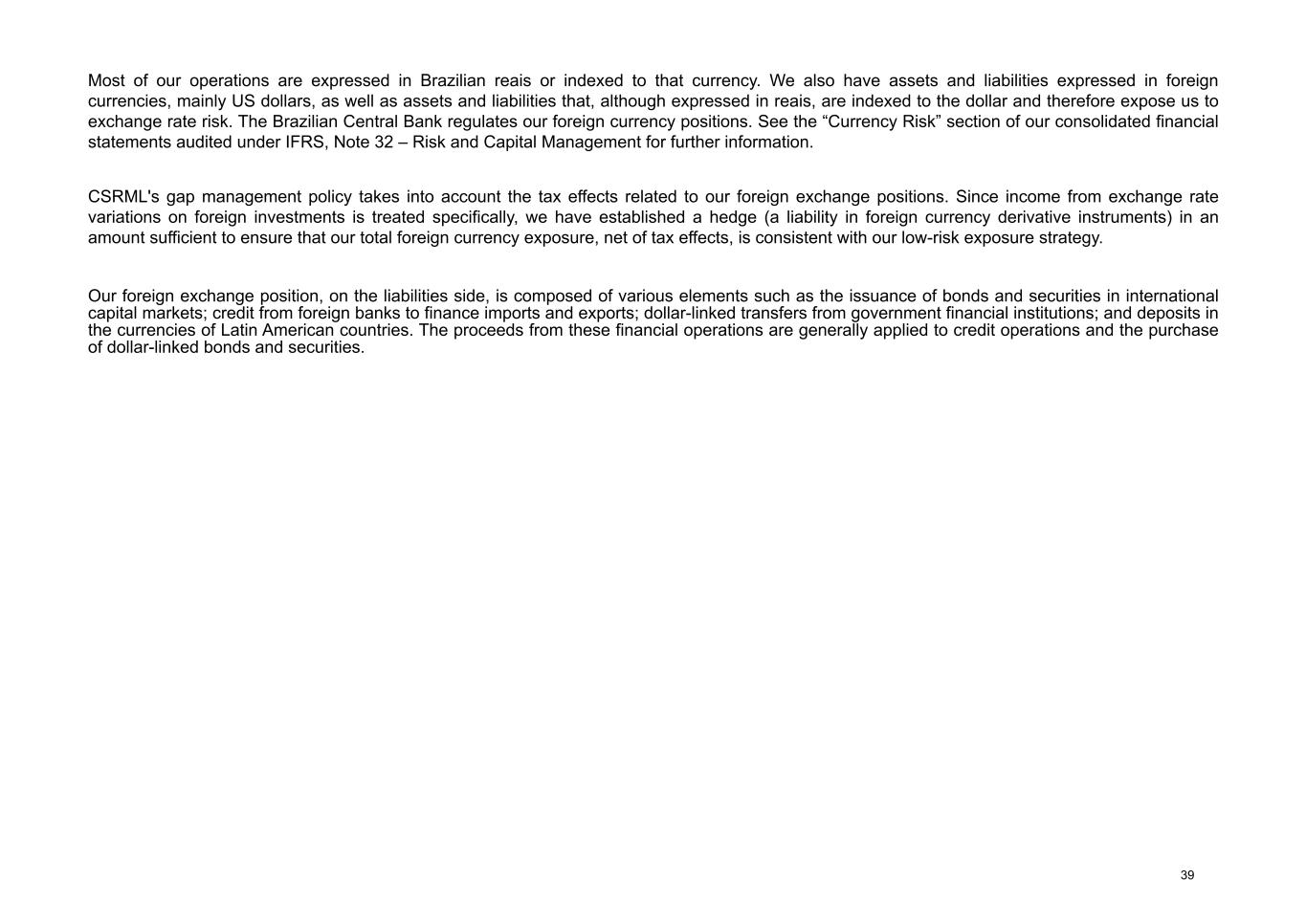 Most of our operations are expressed in Brazilian reais or indexed to that currency. We also have assets and liabilities expressed in foreign currencies, mainly US dollars, as well as assets and liabilities that, although expressed in reais, are indexed to the dollar and therefore expose us to exchange rate risk. The Brazilian Central Bank regulates our foreign currency positions. See the “Currency Risk” section of our consolidated financial statements audited under IFRS, Note 32 – Risk and Capital Management for further information. CSRML's gap management policy takes into account the tax effects related to our foreign exchange positions. Since income from exchange rate variations on foreign investments is treated specifically, we have established a hedge (a liability in foreign currency derivative instruments) in an amount sufficient to ensure that our total foreign currency exposure, net of tax effects, is consistent with our low-risk exposure strategy. Our foreign exchange position, on the liabilities side, is composed of various elements such as the issuance of bonds and securities in international capital markets; credit from foreign banks to finance imports and exports; dollar-linked transfers from government financial institutions; and deposits in the currencies of Latin American countries. The proceeds from these financial operations are generally applied to credit operations and the purchase of dollar-linked bonds and securities. 39