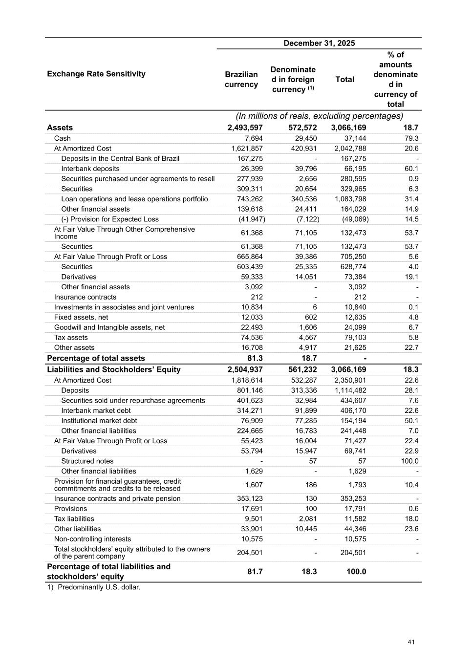 Exchange Rate Sensitivity December 31, 2025 Brazilian currency Denominate d in foreign currency (1) Total % of amounts denominate d in currency of total (In millions of reais, excluding percentages) Assets 2,493,597 572,572 3,066,169 18.7 Cash 7,694 29,450 37,144 79.3 At Amortized Cost 1,621,857 420,931 2,042,788 20.6 Deposits in the Central Bank of Brazil 167,275 - 167,275 - Interbank deposits 26,399 39,796 66,195 60.1 Securities purchased under agreements to resell 277,939 2,656 280,595 0.9 Securities 309,311 20,654 329,965 6.3 Loan operations and lease operations portfolio 743,262 340,536 1,083,798 31.4 Other financial assets 139,618 24,411 164,029 14.9 (-) Provision for Expected Loss (41,947) (7,122) (49,069) 14.5 At Fair Value Through Other Comprehensive Income 61,368 71,105 132,473 53.7 Securities 61,368 71,105 132,473 53.7 At Fair Value Through Profit or Loss 665,864 39,386 705,250 5.6 Securities 603,439 25,335 628,774 4.0 Derivatives 59,333 14,051 73,384 19.1 Other financial assets 3,092 - 3,092 - Insurance contracts 212 - 212 - Investments in associates and joint ventures 10,834 6 10,840 0.1 Fixed assets, net 12,033 602 12,635 4.8 Goodwill and Intangible assets, net 22,493 1,606 24,099 6.7 Tax assets 74,536 4,567 79,103 5.8 Other assets 16,708 4,917 21,625 22.7 Percentage of total assets 81.3 18.7 - Liabilities and Stockholders’ Equity 2,504,937 561,232 3,066,169 18.3 At Amortized Cost 1,818,614 532,287 2,350,901 22.6 Deposits 801,146 313,336 1,114,482 28.1 Securities sold under repurchase agreements 401,623 32,984 434,607 7.6 Interbank market debt 314,271 91,899 406,170 22.6 Institutional market debt 76,909 77,285 154,194 50.1 Other financial liabilities 224,665 16,783 241,448 7.0 At Fair Value Through Profit or Loss 55,423 16,004 71,427 22.4 Derivatives 53,794 15,947 69,741 22.9 Structured notes - 57 57 100.0 Other financial liabilities 1,629 - 1,629 - Provision for financial guarantees, credit commitments and credits to be released 1,607 186 1,793 10.4 Insurance contracts and private pension 353,123 130 353,253 - Provisions 17,691 100 17,791 0.6 Tax liabilities 9,501 2,081 11,582 18.0 Other liabilities 33,901 10,445 44,346 23.6 Non-controlling interests 10,575 - 10,575 - Total stockholders’ equity attributed to the owners of the parent company 204,501 - 204,501 - Percentage of total liabilities and stockholders’ equity 81.7 18.3 100.0 1) Predominantly U.S. dollar. 41