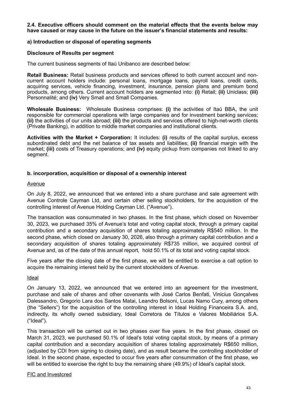 2.4. Executive officers should comment on the material effects that the events below may have caused or may cause in the future on the issuer’s financial statements and results: a) Introduction or disposal of operating segments Disclosure of Results per segment The current business segments of Itaú Unibanco are described below: Retail Business: Retail business products and services offered to both current account and non- current account holders include: personal loans, mortgage loans, payroll loans, credit cards, acquiring services, vehicle financing, investment, insurance, pension plans and premium bond products, among others. Current account holders are segmented into: (i) Retail; (ii) Uniclass; (iii) Personnalité; and (iv) Very Small and Small Companies. Wholesale Business: Wholesale Business comprises: (i) the activities of Itaú BBA, the unit responsible for commercial operations with large companies and for investment banking services; (ii) the activities of our units abroad; (iii) the products and services offered to high-net-worth clients (Private Banking), in addition to middle market companies and institutional clients. Activities with the Market + Corporation: It includes: (i) results of the capital surplus, excess subordinated debt and the net balance of tax assets and liabilities; (ii) financial margin with the market; (iii) costs of Treasury operations; and (iv) equity pickup from companies not linked to any segment. b. incorporation, acquisition or disposal of a ownership interest Avenue On July 8, 2022, we announced that we entered into a share purchase and sale agreement with Avenue Controle Cayman Ltd, and certain other selling stockholders, for the acquisition of the controlling interest of Avenue Holding Cayman Ltd. (“Avenue”). The transaction was consummated in two phases. In the first phase, which closed on November 30, 2023, we purchased 35% of Avenue’s total and voting capital stock, through a primary capital contribution and a secondary acquisition of shares totaling approximately R$540 million. In the second phase, which closed on January 30, 2026, also through a primary capital contribution and a secondary acquisition of shares totaling approximately R$735 million, we acquired control of Avenue and, as of the date of this annual report, hold 50.1% of its total and voting capital stock. Five years after the closing date of the first phase, we will be entitled to exercise a call option to acquire the remaining interest held by the current stockholders of Avenue. Ideal On January 13, 2022, we announced that we entered into an agreement for the investment, purchase and sale of shares and other covenants with José Carlos Benfati, Vinicius Gonçalves Dalessandro, Gregorio Lara dos Santos Matai, Leandro Bolsoni, Lucas Namo Cury, among others (the “Sellers”) for the acquisition of the controlling interest in Ideal Holding Financeira S.A. and, indirectly, its wholly owned subsidiary, Ideal Corretora de Títulos e Valores Mobiliários S.A. (“Ideal”). This transaction will be carried out in two phases over five years. In the first phase, closed on March 31, 2023, we purchased 50.1% of Ideal’s total voting capital stock, by means of a primary capital contribution and a secondary acquisition of shares totaling approximately R$650 million, (adjusted by CDI from signing to closing date), and as result became the controlling stockholder of Ideal. In the second phase, expected to occur five years after consummation of the first phase, we will be entitled to exercise the right to buy the remaining share (49.9%) of Ideal’s capital stock. FIC and Investcred 43