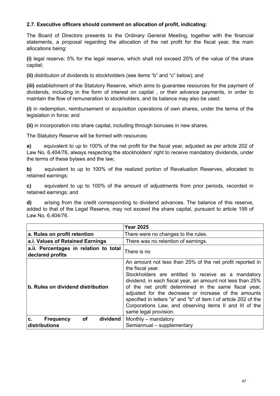 2.7. Executive officers should comment on allocation of profit, indicating: The Board of Directors presents to the Ordinary General Meeting, together with the financial statements, a proposal regarding the allocation of the net profit for the fiscal year, the main allocations being: (i) legal reserve: 5% for the legal reserve, which shall not exceed 20% of the value of the share capital; (ii) distribution of dividends to stockholders (see items “b” and “c” below); and (iii) establishment of the Statutory Reserve, which aims to guarantee resources for the payment of dividends, including in the form of interest on capital , or their advance payments, in order to maintain the flow of remuneration to stockholders, and its balance may also be used: (i) in redemption, reimbursement or acquisition operations of own shares, under the terms of the legislation in force; and (ii) in incorporation into share capital, including through bonuses in new shares. The Statutory Reserve will be formed with resources: a) equivalent to up to 100% of the net profit for the fiscal year, adjusted as per article 202 of Law No. 6,404/76, always respecting the stockholders' right to receive mandatory dividends, under the terms of these bylaws and the law; b) equivalent to up to 100% of the realized portion of Revaluation Reserves, allocated to retained earnings; c) equivalent to up to 100% of the amount of adjustments from prior periods, recorded in retained earnings; and d) arising from the credit corresponding to dividend advances. The balance of this reserve, added to that of the Legal Reserve, may not exceed the share capital, pursuant to article 199 of Law No. 6,404/76. Year 2025 a. Rules on profit retention There were no changes to the rules. a.i. Values of Retained Earnings There was no retention of earnings. a.ii. Percentages in relation to total declared profits There is no b. Rules on dividend distribution An amount not less than 25% of the net profit reported in the fiscal year. Stockholders are entitled to receive as a mandatory dividend, in each fiscal year, an amount not less than 25% of the net profit determined in the same fiscal year, adjusted for the decrease or increase of the amounts specified in letters "a" and "b" of item I of article 202 of the Corporations Law, and observing items II and III of the same legal provision. c. Frequency of dividend distributions Monthly – mandatory Semiannual – supplementary 47