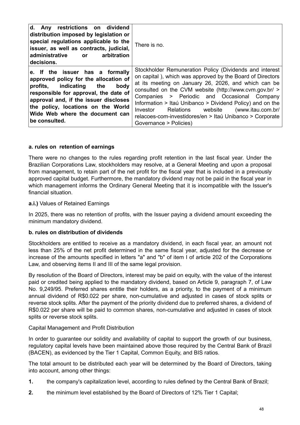d. Any restrictions on dividend distribution imposed by legislation or special regulations applicable to the issuer, as well as contracts, judicial, administrative or arbitration decisions. There is no. e. If the issuer has a formally approved policy for the allocation of profits, indicating the body responsible for approval, the date of approval and, if the issuer discloses the policy, locations on the World Wide Web where the document can be consulted. Stockholder Remuneration Policy (Dividends and interest on capital ), which was approved by the Board of Directors at its meeting on January 26, 2026, and which can be consulted on the CVM website (http://www.cvm.gov.br/ > Companies > Periodic and Occasional Company Information > Itaú Unibanco > Dividend Policy) and on the Investor Relations website (www.itau.com.br/ relacoes-com-investidores/en > Itaú Unibanco > Corporate Governance > Policies) a. rules on retention of earnings There were no changes to the rules regarding profit retention in the last fiscal year. Under the Brazilian Corporations Law, stockholders may resolve, at a General Meeting and upon a proposal from management, to retain part of the net profit for the fiscal year that is included in a previously approved capital budget. Furthermore, the mandatory dividend may not be paid in the fiscal year in which management informs the Ordinary General Meeting that it is incompatible with the Issuer's financial situation. a.i.) Values of Retained Earnings In 2025, there was no retention of profits, with the Issuer paying a dividend amount exceeding the minimum mandatory dividend. b. rules on distribution of dividends Stockholders are entitled to receive as a mandatory dividend, in each fiscal year, an amount not less than 25% of the net profit determined in the same fiscal year, adjusted for the decrease or increase of the amounts specified in letters "a" and "b" of item I of article 202 of the Corporations Law, and observing items II and III of the same legal provision. By resolution of the Board of Directors, interest may be paid on equity, with the value of the interest paid or credited being applied to the mandatory dividend, based on Article 9, paragraph 7, of Law No. 9,249/95. Preferred shares entitle their holders, as a priority, to the payment of a minimum annual dividend of R$0.022 per share, non-cumulative and adjusted in cases of stock splits or reverse stock splits. After the payment of the priority dividend due to preferred shares, a dividend of R$0.022 per share will be paid to common shares, non-cumulative and adjusted in cases of stock splits or reverse stock splits. Capital Management and Profit Distribution In order to guarantee our solidity and availability of capital to support the growth of our business, regulatory capital levels have been maintained above those required by the Central Bank of Brazil (BACEN), as evidenced by the Tier 1 Capital, Common Equity, and BIS ratios. The total amount to be distributed each year will be determined by the Board of Directors, taking into account, among other things: 1. the company's capitalization level, according to rules defined by the Central Bank of Brazil; 2. the minimum level established by the Board of Directors of 12% Tier 1 Capital; 48