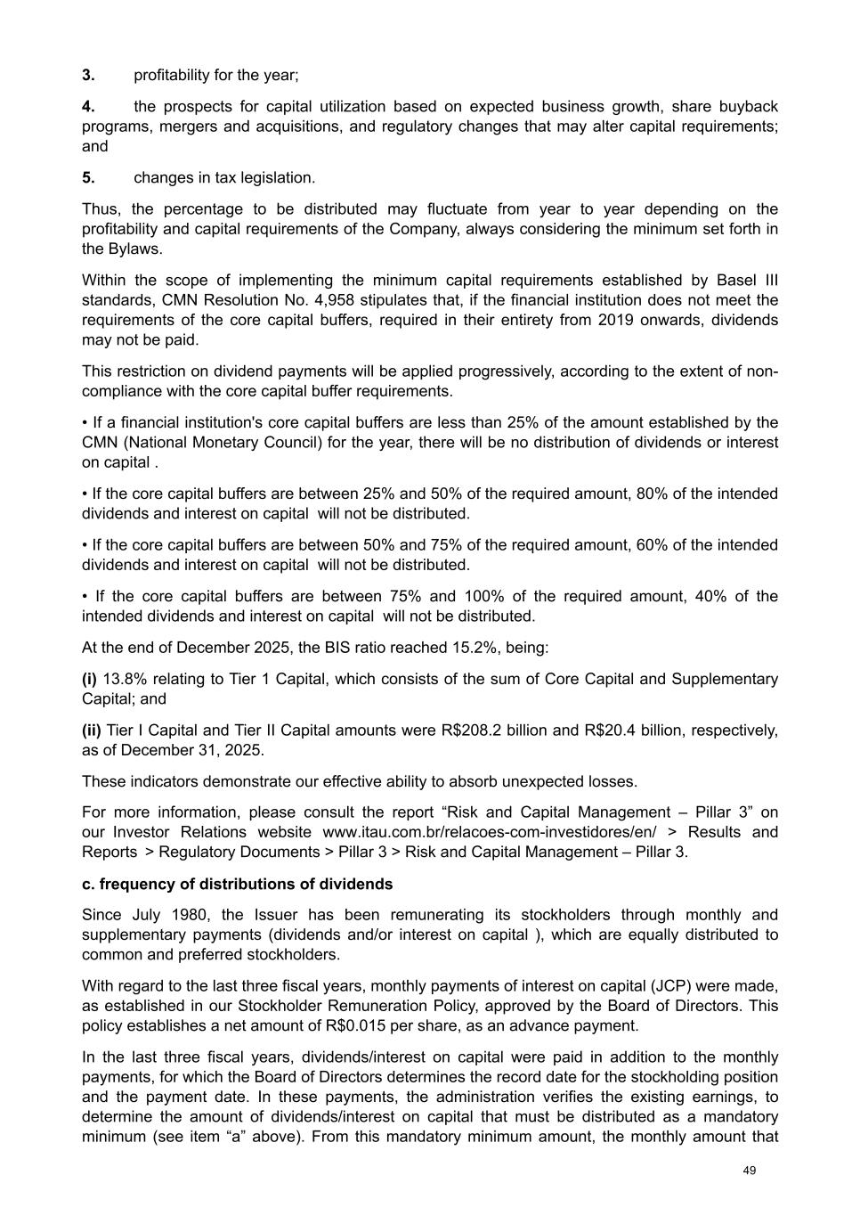 3. profitability for the year; 4. the prospects for capital utilization based on expected business growth, share buyback programs, mergers and acquisitions, and regulatory changes that may alter capital requirements; and 5. changes in tax legislation. Thus, the percentage to be distributed may fluctuate from year to year depending on the profitability and capital requirements of the Company, always considering the minimum set forth in the Bylaws. Within the scope of implementing the minimum capital requirements established by Basel III standards, CMN Resolution No. 4,958 stipulates that, if the financial institution does not meet the requirements of the core capital buffers, required in their entirety from 2019 onwards, dividends may not be paid. This restriction on dividend payments will be applied progressively, according to the extent of non- compliance with the core capital buffer requirements. • If a financial institution's core capital buffers are less than 25% of the amount established by the CMN (National Monetary Council) for the year, there will be no distribution of dividends or interest on capital . • If the core capital buffers are between 25% and 50% of the required amount, 80% of the intended dividends and interest on capital will not be distributed. • If the core capital buffers are between 50% and 75% of the required amount, 60% of the intended dividends and interest on capital will not be distributed. • If the core capital buffers are between 75% and 100% of the required amount, 40% of the intended dividends and interest on capital will not be distributed. At the end of December 2025, the BIS ratio reached 15.2%, being: (i) 13.8% relating to Tier 1 Capital, which consists of the sum of Core Capital and Supplementary Capital; and (ii) Tier I Capital and Tier II Capital amounts were R$208.2 billion and R$20.4 billion, respectively, as of December 31, 2025. These indicators demonstrate our effective ability to absorb unexpected losses. For more information, please consult the report “Risk and Capital Management – Pillar 3” on our Investor Relations website www.itau.com.br/relacoes-com-investidores/en/ > Results and Reports > Regulatory Documents > Pillar 3 > Risk and Capital Management – Pillar 3. c. frequency of distributions of dividends Since July 1980, the Issuer has been remunerating its stockholders through monthly and supplementary payments (dividends and/or interest on capital ), which are equally distributed to common and preferred stockholders. With regard to the last three fiscal years, monthly payments of interest on capital (JCP) were made, as established in our Stockholder Remuneration Policy, approved by the Board of Directors. This policy establishes a net amount of R$0.015 per share, as an advance payment. In the last three fiscal years, dividends/interest on capital were paid in addition to the monthly payments, for which the Board of Directors determines the record date for the stockholding position and the payment date. In these payments, the administration verifies the existing earnings, to determine the amount of dividends/interest on capital that must be distributed as a mandatory minimum (see item “a” above). From this mandatory minimum amount, the monthly amount that 49