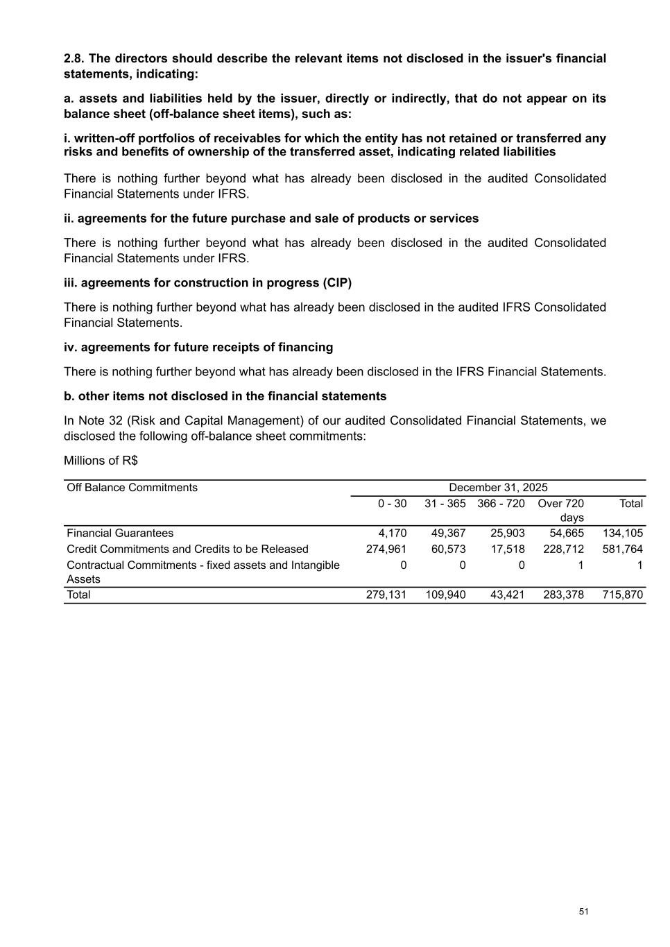 2.8. The directors should describe the relevant items not disclosed in the issuer's financial statements, indicating: a. assets and liabilities held by the issuer, directly or indirectly, that do not appear on its balance sheet (off-balance sheet items), such as: i. written-off portfolios of receivables for which the entity has not retained or transferred any risks and benefits of ownership of the transferred asset, indicating related liabilities There is nothing further beyond what has already been disclosed in the audited Consolidated Financial Statements under IFRS. ii. agreements for the future purchase and sale of products or services There is nothing further beyond what has already been disclosed in the audited Consolidated Financial Statements under IFRS. iii. agreements for construction in progress (CIP) There is nothing further beyond what has already been disclosed in the audited IFRS Consolidated Financial Statements. iv. agreements for future receipts of financing There is nothing further beyond what has already been disclosed in the IFRS Financial Statements. b. other items not disclosed in the financial statements In Note 32 (Risk and Capital Management) of our audited Consolidated Financial Statements, we disclosed the following off-balance sheet commitments: Millions of R$ Off Balance Commitments December 31, 2025 0 - 30 31 - 365 366 - 720 Over 720 days Total Financial Guarantees 4,170 49,367 25,903 54,665 134,105 Credit Commitments and Credits to be Released 274,961 60,573 17,518 228,712 581,764 Contractual Commitments - fixed assets and Intangible Assets 0 0 0 1 1 Total 279,131 109,940 43,421 283,378 715,870 51