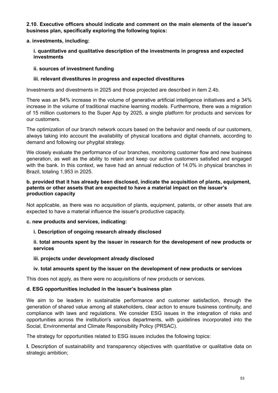 2.10. Executive officers should indicate and comment on the main elements of the issuer's business plan, specifically exploring the following topics: a. investments, including: i. quantitative and qualitative description of the investments in progress and expected investments ii. sources of investment funding iii. relevant divestitures in progress and expected divestitures Investments and divestments in 2025 and those projected are described in item 2.4b. There was an 84% increase in the volume of generative artificial intelligence initiatives and a 34% increase in the volume of traditional machine learning models. Furthermore, there was a migration of 15 million customers to the Super App by 2025, a single platform for products and services for our customers. The optimization of our branch network occurs based on the behavior and needs of our customers, always taking into account the availability of physical locations and digital channels, according to demand and following our phygital strategy. We closely evaluate the performance of our branches, monitoring customer flow and new business generation, as well as the ability to retain and keep our active customers satisfied and engaged with the bank. In this context, we have had an annual reduction of 14.0% in physical branches in Brazil, totaling 1,953 in 2025. b. provided that it has already been disclosed, indicate the acquisition of plants, equipment, patents or other assets that are expected to have a material impact on the issuer’s production capacity Not applicable, as there was no acquisition of plants, equipment, patents, or other assets that are expected to have a material influence the issuer's productive capacity. c. new products and services, indicating: i. Description of ongoing research already disclosed ii. total amounts spent by the issuer in research for the development of new products or services iii. projects under development already disclosed iv. total amounts spent by the issuer on the development of new products or services This does not apply, as there were no acquisitions of new products or services. d. ESG opportunities included in the issuer’s business plan We aim to be leaders in sustainable performance and customer satisfaction, through the generation of shared value among all stakeholders, clear action to ensure business continuity, and compliance with laws and regulations. We consider ESG issues in the integration of risks and opportunities across the institution's various departments, with guidelines incorporated into the Social, Environmental and Climate Responsibility Policy (PRSAC). The strategy for opportunities related to ESG issues includes the following topics: I. Description of sustainability and transparency objectives with quantitative or qualitative data on strategic ambition; 53