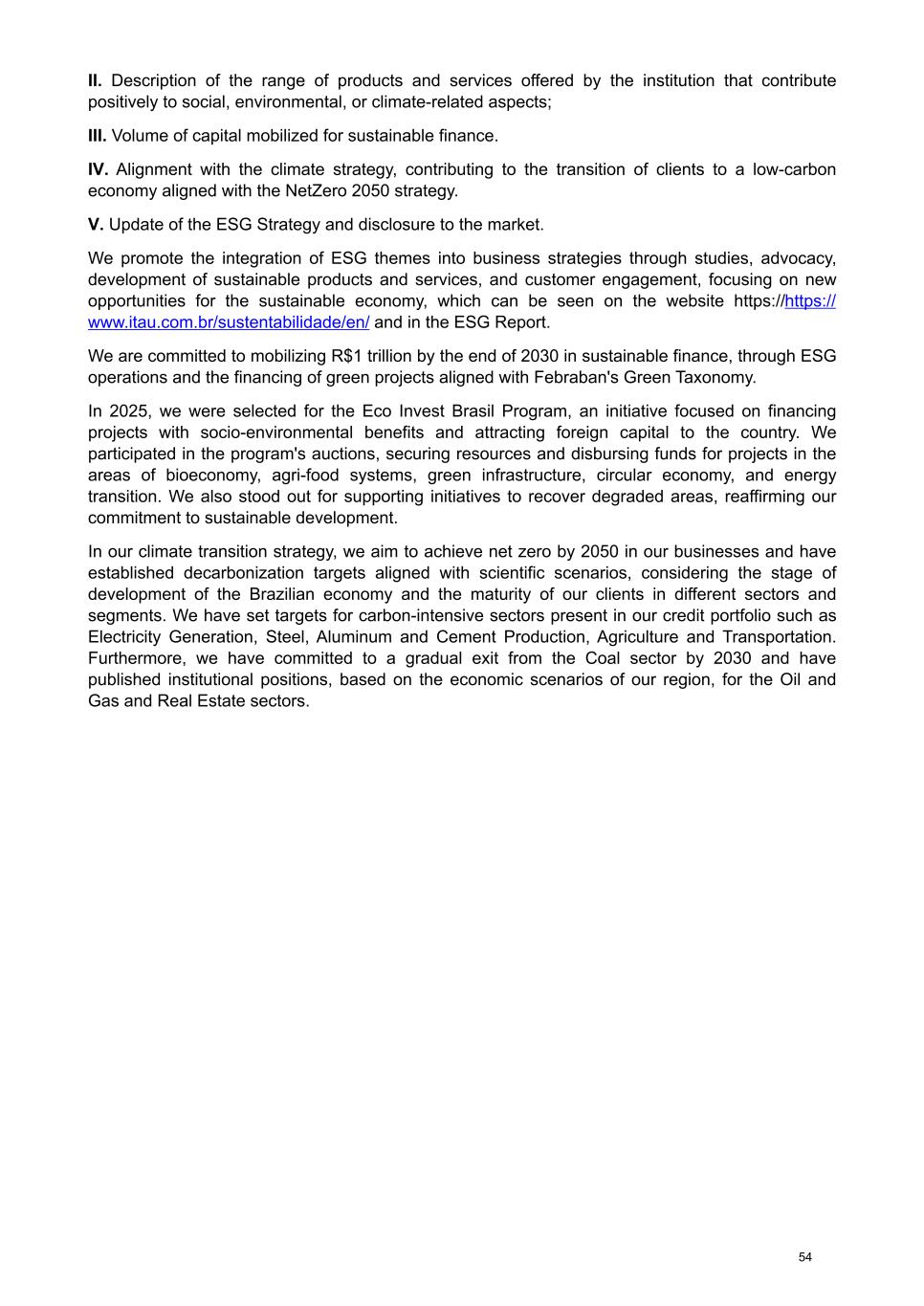 II. Description of the range of products and services offered by the institution that contribute positively to social, environmental, or climate-related aspects; III. Volume of capital mobilized for sustainable finance. IV. Alignment with the climate strategy, contributing to the transition of clients to a low-carbon economy aligned with the NetZero 2050 strategy. V. Update of the ESG Strategy and disclosure to the market. We promote the integration of ESG themes into business strategies through studies, advocacy, development of sustainable products and services, and customer engagement, focusing on new opportunities for the sustainable economy, which can be seen on the website https://https:// www.itau.com.br/sustentabilidade/en/ and in the ESG Report. We are committed to mobilizing R$1 trillion by the end of 2030 in sustainable finance, through ESG operations and the financing of green projects aligned with Febraban's Green Taxonomy. In 2025, we were selected for the Eco Invest Brasil Program, an initiative focused on financing projects with socio-environmental benefits and attracting foreign capital to the country. We participated in the program's auctions, securing resources and disbursing funds for projects in the areas of bioeconomy, agri-food systems, green infrastructure, circular economy, and energy transition. We also stood out for supporting initiatives to recover degraded areas, reaffirming our commitment to sustainable development. In our climate transition strategy, we aim to achieve net zero by 2050 in our businesses and have established decarbonization targets aligned with scientific scenarios, considering the stage of development of the Brazilian economy and the maturity of our clients in different sectors and segments. We have set targets for carbon-intensive sectors present in our credit portfolio such as Electricity Generation, Steel, Aluminum and Cement Production, Agriculture and Transportation. Furthermore, we have committed to a gradual exit from the Coal sector by 2030 and have published institutional positions, based on the economic scenarios of our region, for the Oil and Gas and Real Estate sectors. 54