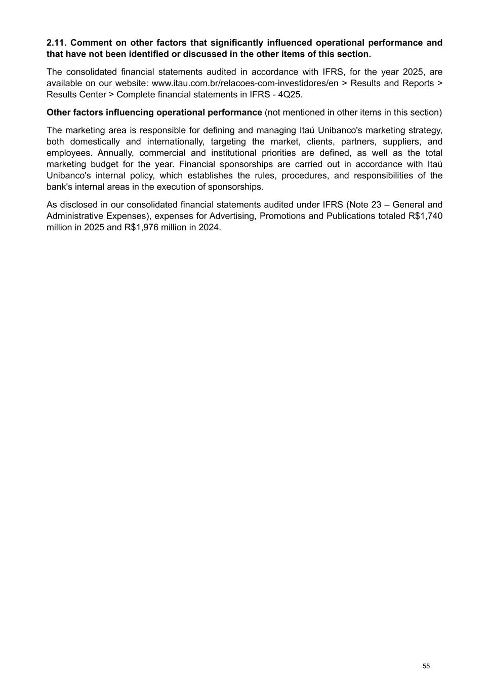 2.11. Comment on other factors that significantly influenced operational performance and that have not been identified or discussed in the other items of this section. The consolidated financial statements audited in accordance with IFRS, for the year 2025, are available on our website: www.itau.com.br/relacoes-com-investidores/en > Results and Reports > Results Center > Complete financial statements in IFRS - 4Q25. Other factors influencing operational performance (not mentioned in other items in this section) The marketing area is responsible for defining and managing Itaú Unibanco's marketing strategy, both domestically and internationally, targeting the market, clients, partners, suppliers, and employees. Annually, commercial and institutional priorities are defined, as well as the total marketing budget for the year. Financial sponsorships are carried out in accordance with Itaú Unibanco's internal policy, which establishes the rules, procedures, and responsibilities of the bank's internal areas in the execution of sponsorships. As disclosed in our consolidated financial statements audited under IFRS (Note 23 – General and Administrative Expenses), expenses for Advertising, Promotions and Publications totaled R$1,740 million in 2025 and R$1,976 million in 2024. 55