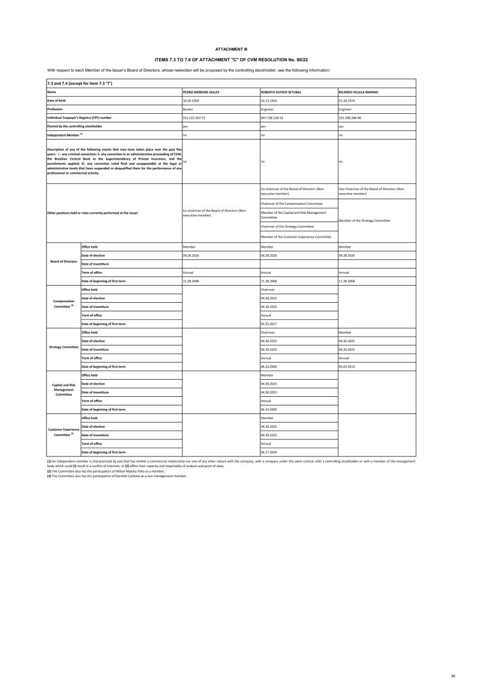 With respect to each Member of the Issuer’s Board of Directors, whose reelection will be proposed by the controlling stockholder, see the following information: PEDRO MOREIRA SALLES ROBERTO EGYDIO SETUBAL RICARDO VILLELA MARINO 10.20.1959 10.13.1954 01.28.1974 Banker Engineer Engineer 551.222.567-72 007.738.228-52 252.398.288-90 yes yes yes no no no no no no Co-chairman of the Board of Directors (Non- executive member) Vice Chairman of the Board of Directors (Non- executive member) Chairman of the Compensation Committee Member of the Capital and Risk Management Committee Chairman of the Strategy Committee Member of the Customer Experience Committee Office held Member Member Member Date of election 04.28.2026 04.28.2026 04.28.2026 Date of investiture Term of office Annual Annual Annual Date of beginning of first term 11.28.2008 11.28.2008 11.28.2008 Office held Chairman Date of election 04.30.2025 Date of investiture 04.30.2025 Term of office Annual Date of beginning of first term 05.25.2017 Office held Chairman Member Date of election 04.30.2025 04.30.2025 Date of investiture 04.30.2025 04.30.2025 Term of office Annual Annual Date of beginning of first term 06.24.2009 05.03.2010 Office held Member Date of election 04.30.2025 Date of investiture 04.30.2025 Term of office Annual Date of beginning of first term 06.24.2009 Office held Member Date of election 04.30.2025 Date of investiture 04.30.2025 Term of office Annual Date of beginning of first term 06.27.2024 (2) The Committee also has the participation of Milton Maluhy Filho as a member; (3) The Committee also has the participation of Geraldo Carbone as a non‐management member. (1) An independent member is characterized by one that has neither a commercial relationship nor one of any other nature with the company, with a company under the same control, with a controlling stockholder or with a member of the management body which could (i) result in a conflict of interests; or (ii) affect their capacity and impartiality of analysis and point of view; Capital and Risk Management Committee ATTACHMENT III ITEMS 7.3 TO 7.6 OF ATTACHMENT "C" OF CVM RESOLUTION No. 80/22 Independent Member (1) Description of any of the following events that may have taken place over the past five years: i - any criminal conviction; ii. any conviction in an administrative proceeding of CVM, the Brazilian Central Bank or the Superintendency of Private Insurance, and the punishments applied; iii. any conviction ruled final and unappealable at the legal or administrative levels that have suspended or disqualified them for the performance of any professional or commercial activity. Other positions held or roles currently performed at the Issuer 7.3 and 7.4 (except for item 7.3 "l") Name Date of birth Profession Individual Taxpayer’s Registry (CPF) number Elected by the controlling stockholder Co-chairman of the Board of Directors (Non- executive member) Member of the Strategy Committee Customer Experience Committee (2) Board of Directors Compensation Committee (3) Strategy Committee 56