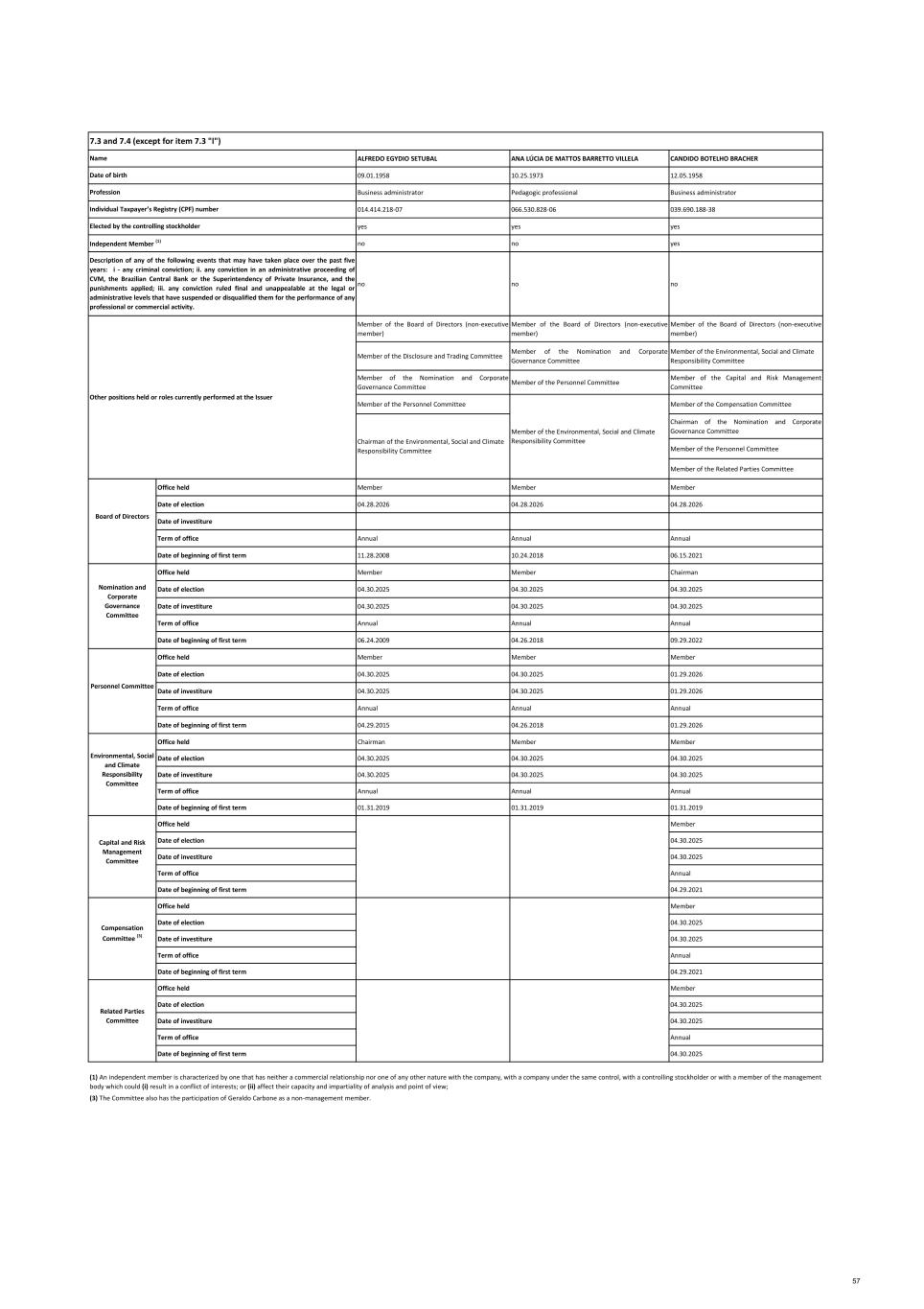 ALFREDO EGYDIO SETUBAL ANA LÚCIA DE MATTOS BARRETTO VILLELA CANDIDO BOTELHO BRACHER 09.01.1958 10.25.1973 12.05.1958 Business administrator Pedagogic professional Business administrator 014.414.218-07 066.530.828-06 039.690.188-38 yes yes yes no no yes no no no Member of the Board of Directors (non-executive member) Member of the Board of Directors (non-executive member) Member of the Board of Directors (non-executive member) Member of the Disclosure and Trading Committee Member of the Nomination and Corporate Governance Committee Member of the Environmental, Social and Climate Responsibility Committee Member of the Nomination and Corporate Governance Committee Member of the Personnel Committee Member of the Capital and Risk Management Committee Member of the Personnel Committee Member of the Compensation Committee Chairman of the Nomination and Corporate Governance Committee Member of the Personnel Committee Member of the Related Parties Committee Office held Member Member Member Date of election 04.28.2026 04.28.2026 04.28.2026 Date of investiture Term of office Annual Annual Annual Date of beginning of first term 11.28.2008 10.24.2018 06.15.2021 Office held Member Member Chairman Date of election 04.30.2025 04.30.2025 04.30.2025 Date of investiture 04.30.2025 04.30.2025 04.30.2025 Term of office Annual Annual Annual Date of beginning of first term 06.24.2009 04.26.2018 09.29.2022 Office held Member Member Member Date of election 04.30.2025 04.30.2025 01.29.2026 Date of investiture 04.30.2025 04.30.2025 01.29.2026 Term of office Annual Annual Annual Date of beginning of first term 04.29.2015 04.26.2018 01.29.2026 Office held Chairman Member Member Date of election 04.30.2025 04.30.2025 04.30.2025 Date of investiture 04.30.2025 04.30.2025 04.30.2025 Term of office Annual Annual Annual Date of beginning of first term 01.31.2019 01.31.2019 01.31.2019 Office held Member Date of election 04.30.2025 Date of investiture 04.30.2025 Term of office Annual Date of beginning of first term 04.29.2021 Office held Member Date of election 04.30.2025 Date of investiture 04.30.2025 Term of office Annual Date of beginning of first term 04.29.2021 Office held Member Date of election 04.30.2025 Date of investiture 04.30.2025 Term of office Annual Date of beginning of first term 04.30.2025 (3) The Committee also has the participation of Geraldo Carbone as a non‐management member. (1) An independent member is characterized by one that has neither a commercial relationship nor one of any other nature with the company, with a company under the same control, with a controlling stockholder or with a member of the management body which could (i) result in a conflict of interests; or (ii) affect their capacity and impartiality of analysis and point of view; Environmental, Social and Climate Responsibility Committee Capital and Risk Management Committee Compensation Committee (3) Related Parties Committee Personnel Committee 7.3 and 7.4 (except for item 7.3 "l") Elected by the controlling stockholder Name Date of birth Profession Individual Taxpayer’s Registry (CPF) number Chairman of the Environmental, Social and Climate Responsibility Committee Member of the Environmental, Social and Climate Responsibility Committee Independent Member (1) Description of any of the following events that may have taken place over the past five years: i - any criminal conviction; ii. any conviction in an administrative proceeding of CVM, the Brazilian Central Bank or the Superintendency of Private Insurance, and the punishments applied; iii. any conviction ruled final and unappealable at the legal or administrative levels that have suspended or disqualified them for the performance of any professional or commercial activity. Board of Directors Nomination and Corporate Governance Committee Other positions held or roles currently performed at the Issuer 57