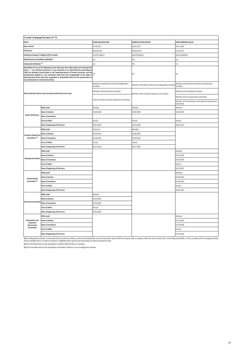 CESAR NIVALDO GON FABRICIO BLOISI ROCHA JOÃO MOREIRA SALLES 07.09.1971 05.09.1977 04.11.1981 Businessman Businessman Economist 154.974.508-57 263.679.838-21 295.520.008-58 yes Yes yes yes Yes no no no no Member of the Board of Directors (independent member) Member of the Board of Directors (independent member) Member of the Board of Directors (non-executive member) Member of the Personnel Committee Member of the Strategy Committee Member of the Compensation Committee Member of the Nomination and Corporate Governance Committee Office held Member Member Member Date of election 04.28.2026 04.28.2026 04.28.2026 Date of investiture Term of office Annual Annual Annual Date of beginning of first term 07.01.2022 05.17.2024 06.01.2017 Office held Chairman Member Date of election 04.30.2025 04.30.2025 Date of investiture 04.30.2025 04.30.2025 Term of office Annual Annual Date of beginning of first term 06.27.2024 06.27.2024 Office held Member Date of election 04.30.2025 Date of investiture 04.30.2025 Term of office Annual Date of beginning of first term 05.25.2017 Office held Member Date of election 04.30.2025 Date of investiture 04.30.2025 Term of office Annual Date of beginning of first term 04.29.2021 Office held Member Date of election 04.30.2025 Date of investiture 04.30.2025 Term of office Annual Date of beginning of first term 04.30.2025 Office held Member Date of election 01.29.2026 Date of investiture 01.29.2026 Term of office Annual Date of beginning of first term 01.29.2026 (2) The Committee also has the participation of Milton Maluhy Filho as a member; (3) The Committee also has the participation of Geraldo Carbone as a non‐management member. (1) An independent member is characterized by one that has neither a commercial relationship nor one of any other nature with the company, with a company under the same control, with a controlling stockholder or with a member of the management body which could (i) result in a conflict of interests; or (ii) affect their capacity and impartiality of analysis and point of view; Compensation Committee (3) Customer Experience Committee (2) Strategy Committee Personnel Committee Nomination and Corporate Governance Committee Name Date of birth Profession Individual Taxpayer’s Registry (CPF) number 7.3 and 7.4 (except for item 7.3 "l") Member of the Customer Experience Committee Elected by the controlling stockholder Independent Member (1) Description of any of the following events that may have taken place over the past five years: i - any criminal conviction; ii. any conviction in an administrative proceeding of CVM, the Brazilian Central Bank or the Superintendency of Private Insurance, and the punishments applied; iii. any conviction ruled final and unappealable at the legal or administrative levels that have suspended or disqualified them for the performance of any professional or commercial activity. Other positions held or roles currently performed at the Issuer Board of Directors Chairman of the Customer Experience Committee 58