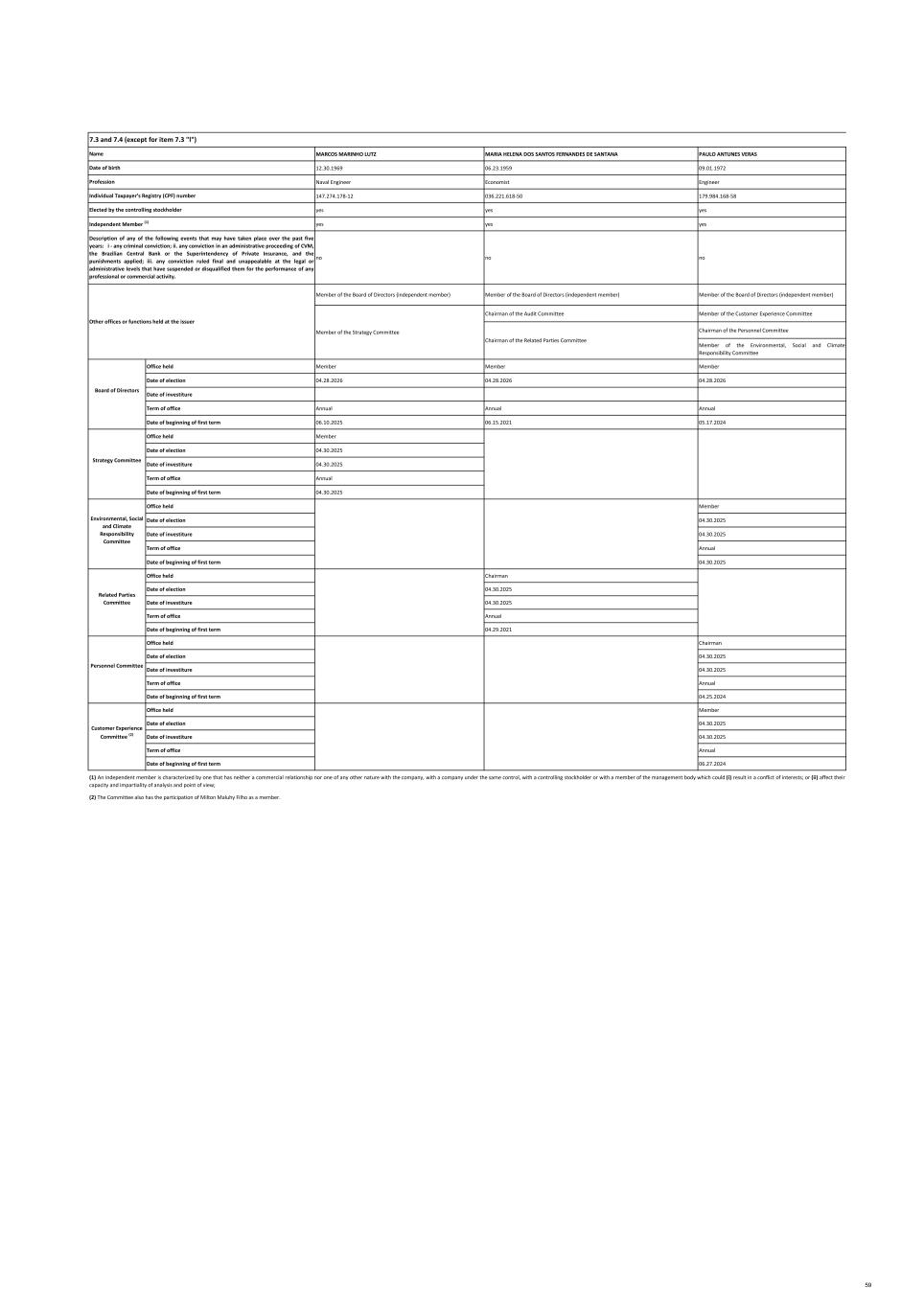 MARCOS MARINHO LUTZ MARIA HELENA DOS SANTOS FERNANDES DE SANTANA PAULO ANTUNES VERAS 12.30.1969 06.23.1959 09.01.1972 Naval Engineer Economist Engineer 147.274.178-12 036.221.618-50 179.984.168-58 yes yes yes yes yes yes no no no Member of the Board of Directors (independent member) Member of the Board of Directors (independent member) Member of the Board of Directors (independent member) Chairman of the Audit Committee Member of the Customer Experience Committee Chairman of the Personnel Committee Member of the Environmental, Social and Climate Responsibility Committee Office held Member Member Member Date of election 04.28.2026 04.28.2026 04.28.2026 Date of investiture Term of office Annual Annual Annual Date of beginning of first term 06.10.2025 06.15.2021 05.17.2024 Office held Member Date of election 04.30.2025 Date of investiture 04.30.2025 Term of office Annual Date of beginning of first term 04.30.2025 Office held Member Date of election 04.30.2025 Date of investiture 04.30.2025 Term of office Annual Date of beginning of first term 04.30.2025 Office held Chairman Date of election 04.30.2025 Date of investiture 04.30.2025 Term of office Annual Date of beginning of first term 04.29.2021 Office held Chairman Date of election 04.30.2025 Date of investiture 04.30.2025 Term of office Annual Date of beginning of first term 04.25.2024 Office held Member Date of election 04.30.2025 Date of investiture 04.30.2025 Term of office Annual Date of beginning of first term 06.27.2024 (2) The Committee also has the participation of Milton Maluhy Filho as a member. Elected by the controlling stockholder Name Date of birth Profession Individual Taxpayer’s Registry (CPF) number 7.3 and 7.4 (except for item 7.3 "l") (1) An independent member is characterized by one that has neither a commercial relationship nor one of any other nature with the company, with a company under the same control, with a controlling stockholder or with a member of the management body which could (i) result in a conflict of interests; or (ii) affect their capacity and impartiality of analysis and point of view; Personnel Committee Customer Experience Committee (2) Related Parties Committee Independent Member (1) Description of any of the following events that may have taken place over the past five years: i - any criminal conviction; ii. any conviction in an administrative proceeding of CVM, the Brazilian Central Bank or the Superintendency of Private Insurance, and the punishments applied; iii. any conviction ruled final and unappealable at the legal or administrative levels that have suspended or disqualified them for the performance of any professional or commercial activity. Board of Directors Environmental, Social and Climate Responsibility Committee Strategy Committee Chairman of the Related Parties Committee Member of the Strategy Committee Other offices or functions held at the issuer 59