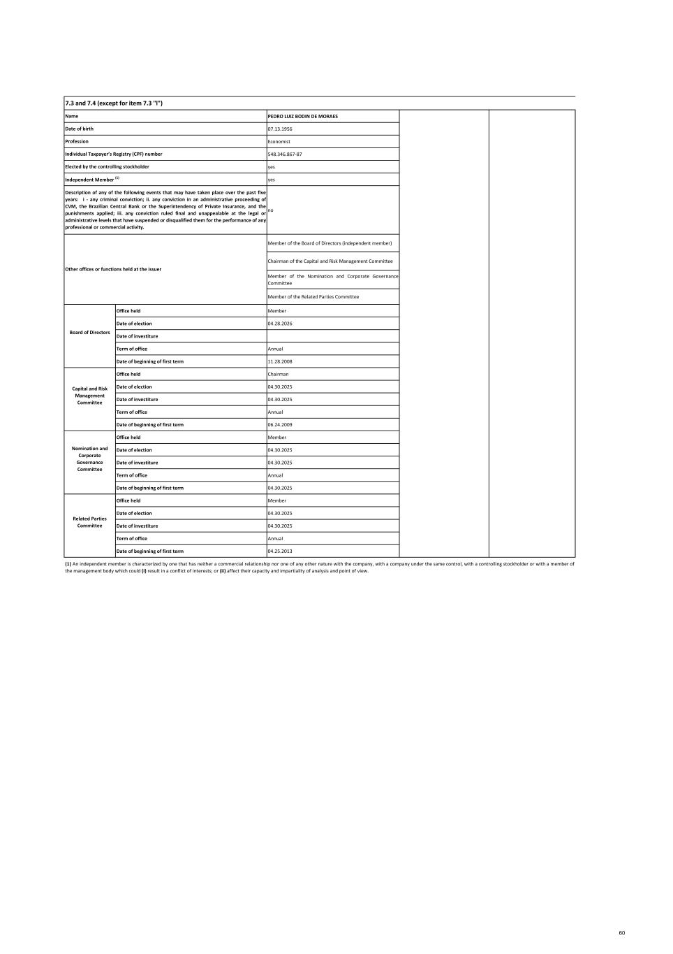 PEDRO LUIZ BODIN DE MORAES 07.13.1956 Economist 548.346.867-87 yes yes no Member of the Board of Directors (independent member) Chairman of the Capital and Risk Management Committee Member of the Nomination and Corporate Governance Committee Member of the Related Parties Committee Office held Member Date of election 04.28.2026 Date of investiture Term of office Annual Date of beginning of first term 11.28.2008 Office held Chairman Date of election 04.30.2025 Date of investiture 04.30.2025 Term of office Annual Date of beginning of first term 06.24.2009 Office held Member Date of election 04.30.2025 Date of investiture 04.30.2025 Term of office Annual Date of beginning of first term 04.30.2025 Office held Member Date of election 04.30.2025 Date of investiture 04.30.2025 Term of office Annual Date of beginning of first term 04.25.2013 (1) An independent member is characterized by one that has neither a commercial relationship nor one of any other nature with the company, with a company under the same control, with a controlling stockholder or with a member of the management body which could (i) result in a conflict of interests; or (ii) affect their capacity and impartiality of analysis and point of view. Board of Directors Individual Taxpayer’s Registry (CPF) number Other offices or functions held at the issuer Capital and Risk Management Committee Nomination and Corporate Governance Committee Elected by the controlling stockholder Independent Member (1) Description of any of the following events that may have taken place over the past five years: i - any criminal conviction; ii. any conviction in an administrative proceeding of CVM, the Brazilian Central Bank or the Superintendency of Private Insurance, and the punishments applied; iii. any conviction ruled final and unappealable at the legal or administrative levels that have suspended or disqualified them for the performance of any professional or commercial activity. Related Parties Committee Name Date of birth Profession 7.3 and 7.4 (except for item 7.3 "l") 60