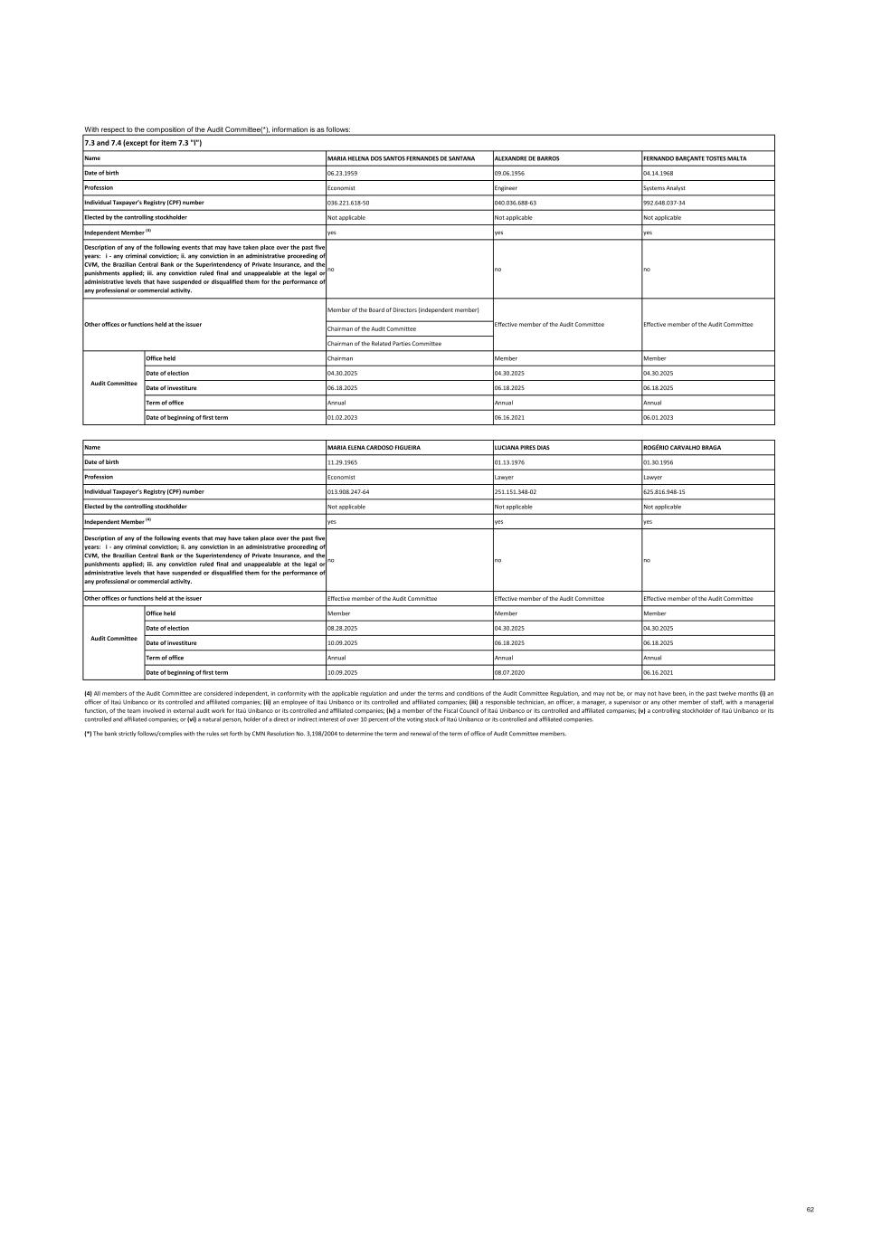 MARIA HELENA DOS SANTOS FERNANDES DE SANTANA ALEXANDRE DE BARROS FERNANDO BARÇANTE TOSTES MALTA 06.23.1959 09.06.1956 04.14.1968 Economist Engineer Systems Analyst 036.221.618-50 040.036.688-63 992.648.037-34 Not applicable Not applicable Not applicable yes yes yes no no no Member of the Board of Directors (independent member) Chairman of the Audit Committee Chairman of the Related Parties Committee Office held Chairman Member Member Date of election 04.30.2025 04.30.2025 04.30.2025 Date of investiture 06.18.2025 06.18.2025 06.18.2025 Term of office Annual Annual Annual Date of beginning of first term 01.02.2023 06.16.2021 06.01.2023 MARIA ELENA CARDOSO FIGUEIRA LUCIANA PIRES DIAS ROGÉRIO CARVALHO BRAGA 11.29.1965 01.13.1976 01.30.1956 Economist Lawyer Lawyer 013.908.247-64 251.151.348-02 625.816.948-15 Not applicable Not applicable Not applicable yes yes yes no no no Effective member of the Audit Committee Effective member of the Audit Committee Effective member of the Audit Committee Office held Member Member Member Date of election 08.28.2025 04.30.2025 04.30.2025 Date of investiture 10.09.2025 06.18.2025 06.18.2025 Term of office Annual Annual Annual Date of beginning of first term 10.09.2025 08.07.2020 06.16.2021 (4) All members of the Audit Committee are considered independent, in conformity with the applicable regulation and under the terms and conditions of the Audit Committee Regulation, and may not be, or may not have been, in the past twelve months (i) an officer of Itaú Unibanco or its controlled and affiliated companies; (ii) an employee of Itaú Unibanco or its controlled and affiliated companies; (iii) a responsible technician, an officer, a manager, a supervisor or any other member of staff, with a managerial function, of the team involved in external audit work for Itaú Unibanco or its controlled and affiliated companies; (iv) a member of the Fiscal Council of Itaú Unibanco or its controlled and affiliated companies; (v) a controlling stockholder of Itaú Unibanco or its controlled and affiliated companies; or (vi) a natural person, holder of a direct or indirect interest of over 10 percent of the voting stock of Itaú Unibanco or its controlled and affiliated companies. With respect to the composition of the Audit Committee(*), information is as follows: (*) The bank strictly follows/complies with the rules set forth by CMN Resolution No. 3,198/2004 to determine the term and renewal of the term of office of Audit Committee members. Audit Committee Profession Individual Taxpayer’s Registry (CPF) number Elected by the controlling stockholder Independent Member (4) Description of any of the following events that may have taken place over the past five years: i - any criminal conviction; ii. any conviction in an administrative proceeding of CVM, the Brazilian Central Bank or the Superintendency of Private Insurance, and the punishments applied; iii. any conviction ruled final and unappealable at the legal or administrative levels that have suspended or disqualified them for the performance of any professional or commercial activity. Other offices or functions held at the issuer Date of birth Name Date of birth Profession 7.3 and 7.4 (except for item 7.3 "l") Individual Taxpayer’s Registry (CPF) number Effective member of the Audit Committee Effective member of the Audit Committee Name Elected by the controlling stockholder Independent Member (4) Description of any of the following events that may have taken place over the past five years: i - any criminal conviction; ii. any conviction in an administrative proceeding of CVM, the Brazilian Central Bank or the Superintendency of Private Insurance, and the punishments applied; iii. any conviction ruled final and unappealable at the legal or administrative levels that have suspended or disqualified them for the performance of any professional or commercial activity. Audit Committee Other offices or functions held at the issuer 62